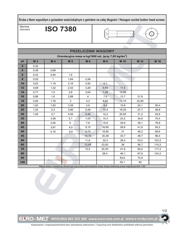 Œruba z ³bem wypuk³ym z gniazdem szeœciok¹tnym z gwintem na ca³ej d³ugoœci / Hexagon socket button head screws Norma ISO 7380 Standard PRZELICZNIK WAGOWY Orientacyjna masa w kg/1000 szt. (przy 7,85 kg/dm3) M3 4 0,32 5 0,38 0,88 6 0,42 0,94 1,6 8 0,52 1 1,84 2,58 10 0,62 1,18 2,16 2,92 6,1 12 0,68 1,32 2,42 3,28 6,65 11,6 14 0,77 1,5 2,6 3,64 7,28 12,65 16 0,86 1,6 2,88 4 7,9 13,7 21,8 18 0,94 1,76 3 4,3 8,65 14,75 22,95 20 1,02 1,92 3,38 4,6 9,4 15,8 24,1 50,4 25 1,24 2,3 3,96 5,48 10,9 18,25 27,7 56,8 30 1,46 2,7 4,56 6,46 12,2 20,65 31,2 63,6 35 3,08 5,1 7,05 14,3 23,2 34,8 70,4 40 3,46 6 7,8 15,6 25,6 39,1 76,8 45 3,81 6,5 9,15 16,85 28,6 41,8 83,2 50 4,16 6,6 9,75 18,85 31 46,2 89,6 10,75 20,38 33,7 49,7 96,4 36,4 53,2 103,2 55 60 M4 M5 M6 O d/l M8 M 10 M 12 M 16 11,8 22,3 65 12,85 23,83 39 56,7 110,2 70 13,9 25,35 41,6 60,2 117,2 28,4 46,1 67,8 124,2 50,6 74,9 55,1 82 80 90 100 Masê œruby mosiê¿nej otrzymuje siê przez pomno¿enie masy œruby stalowej przez wspó³czynnik 1,08 1/2 INFOLINIA 801 555 280 www.euro-met.com.pl www.e-sruby.com.pl Kopiowanie i rozpowszechnianie bez zezwolenia zabronione / Copyning and distribution prohibited without permision