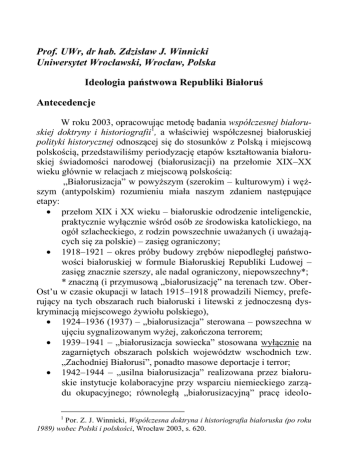 Prof. UWr, dr hab. Zdzisław J. Winnicki Uniwersytet Wrocławski, Wrocław, Polska Ideologia państwowa Republiki Białoruś Antecedencje W roku 2003, opracowując metodę badania współczesnej białoruskiej doktryny i historiografii1, a właściwiej współczesnej białoruskiej polityki historycznej odnoszącej się do stosunków z Polską i miejscową polskością, przedstawiliśmy periodyzację etapów kształtowania białoruskiej świadomości narodowej (białorusizacji) na przełomie XIX–XX wieku głównie w relacjach z miejscową polskością: „Białorusizacja” w powyższym (szerokim – kulturowym) i węższym (antypolskim) rozumieniu miała naszym zdaniem następujące etapy: przełom XIX i XX wieku – białoruskie odrodzenie inteligenckie, praktycznie wyłącznie wśród osób ze środowiska katolickiego, na ogół szlacheckiego, z rodzin powszechnie uważanych (i uważających się za polskie) – zasięg ograniczony; 1918–1921 – okres próby budowy zrębów niepodległej państwowości białoruskiej w formule Białoruskiej Republiki Ludowej – zasięg znacznie szerszy, ale nadal ograniczony, niepowszechny*; * znaczną (i przymusową „białorusizację” na terenach tzw. OberOst’u w czasie okupacji w latach 1915–1918 prowadzili Niemcy, preferujący na tych obszarach ruch białoruski i litewski z jednoczesną dyskryminacją miejscowego żywiołu polskiego), 1924–1936 (1937) – „białorusizacja” sterowana – powszechna w ujęciu sygnalizowanym wyżej, zakończona terrorem; 1939–1941 – „białorusizacja sowiecka” stosowana wyłącznie na zagarniętych obszarach polskich województw wschodnich tzw. „Zachodniej Białorusi”, ponadto masowe deportacje i terror; 1942–1944 – „usilna białorusizacja” realizowana przez białoruskie instytucje kolaboracyjne przy wsparciu niemieckiego zarządu okupacyjnego; równoległą „białorusizacyjną” pracę ideolo1 Por. Z. J. Winnicki, Współczesna doktryna i historiografia białoruska (po roku 1989) wobec Polski i polskości, Wrocław 2003, s. 620. Rocznik Stowarzyszenia Naukowców Polaków Litwy, 2014, T. 13/14 giczną realizowały na terenie „czasowo okupowanych zachodnich obwodów BSSR” sowieckie organizacje polityczne (struktura KPB–KPZR) i sowiecka partyzantka zwalczająca w terenie przede wszystkim polskie oddziały Armii Krajowej; 1944–1956 (1957) – „białorusizacja” przez ekspatriację (tzw. repatriacja do powojennej Polski – urzędowe określenie ewakuacja), deportację, terror, dekatolizację i depolonizację instytucji (likwidacja resztek szkolnictwa polskiego w roku 1949) i masowe nieuznawanie deklaracji polskości przez miejscową ludność wiejską jako etap na drodze do powszechnej sowietyzacji wszystkich narodowości BSSR; 1991–1995 – „białorusizacja” podjęta przez antysystemowych białoruskich działaczy odrodzeniowych, a po ich włączeniu w struktury władzy (parlament, komisje parlamentarne) – sterowana państwowo, w ujęciu zbliżonym do działań z lat 20. XX wieku w przedwojennej BSSR; współcześnie (1996–2013) – „białorusizacja” – ideologicznie i urzędowo stosowana ambiwalentnie; zwalczana jako prąd ruch opozycyjny i „nacjonalistyczny”, popierana [przez państwo] jako element kulturowy (zwłaszcza ludowy), świadomościowy … i depolonizacyjny zarazem polegający na wspieraniu dalszej białorusizacji liturgii w Kościele oraz delegalizacji Związku Polaków na Białorusi. Etapy 3, 4, 5, 6 łączyły się z represjami antypolskimi z terrorem fizycznym i ludobójstwem (Kuropaty, Katyń, mordy ewakuowanych więzień w roku 1941, Syberia) włącznie2. Wszystkie te etapy oddziaływały także na Białorusinów etnicznych, z tym że szczególnie istotne znaczenie miały tutaj etapy: 1, 2, 5 i 6. Od roku 2003 doszedł etap 9. – ideologia państwowa Republiki Białoruś, który trwa już dziesięć lat i jest po okresie sowietyzacji najdłuższym (i rozwijającym się) etapem kształtowania państwowej, obywatelskiej i narodowej świadomości współczesnych Białorusinów oraz obywateli białoruskich innych narodowości (około 20% mieszkańców). Powyższe w odniesieniu do Białorusinów można zatem skorygować następująco: 2 Ibidem, s. 37–38. 129 Artykuły naukowe białoruski ruch odrodzeniowy przełomu XIX i XX wieku; okres proklamowania Białoruskiej Republiki Ludowej (BRL) 1918–1921; koncepcja białorusizacji sowieckiej z lat 1924–1936/1937; 1942–1944 „usilna białorusizacja” realizowana przez białoruskie instytucje kolaboracyjne przy wsparciu niemieckiego zarządu okupacyjnego – równoległą „białorusizacyjną” pracę ideologiczną realizowały na terenie „czasowo okupowanych zachodnich obwodów BSSR” sowieckie organizacje polityczne (struktura KPB–KPZR) i sowiecką partyzantkę; sowietyzacja/rusyfikacja na tle doktryny przebudowy społeczeństwa ZSSR w kategorię ludzi radzieckich (Białoruś sowiecka odczuła tego szczególne, trwające do chwili obecnej skutki) – od roku 1937 praktycznie do końca ZSSR; okres poszukiwań po 1989 roku – narodowa koncepcja historii i tzw. II białorusizacja w okresie rządów Szuszkiewicza od 1994 roku (początek autorytarnych rządów Aleksandra Łukaszenki i budowy modelu białoruskiego); od 2003 roku ideologia państwowa Republiki Białoruś – powszechna państwowa koncepcja edukacyjno-polityczna obywateli Republiki Białoruś. Jak skutkowały te etapy? 1. Etap. Nie miał praktycznie żadnego znaczenia dla ogółu prawosławnych wówczas w zdecydowanej większości chłopów raczej nieposiadających świadomości narodowej. Popierający cara i cerkiew chłop (blisko 90% białoruskiej ludności) z Ziem Białoruskich3 (nie „Białorusi” w sensie politycznym) nie miał zaufania do odrodzeniow3 Pojęcie „Ziemie Białoruskie” (za Piotrem Eberhardtem) stosujemy w odniesieniu do obszaru dzisiejszego (2013 r.) państwa Białoruskiego z jednoczesnym odnosz