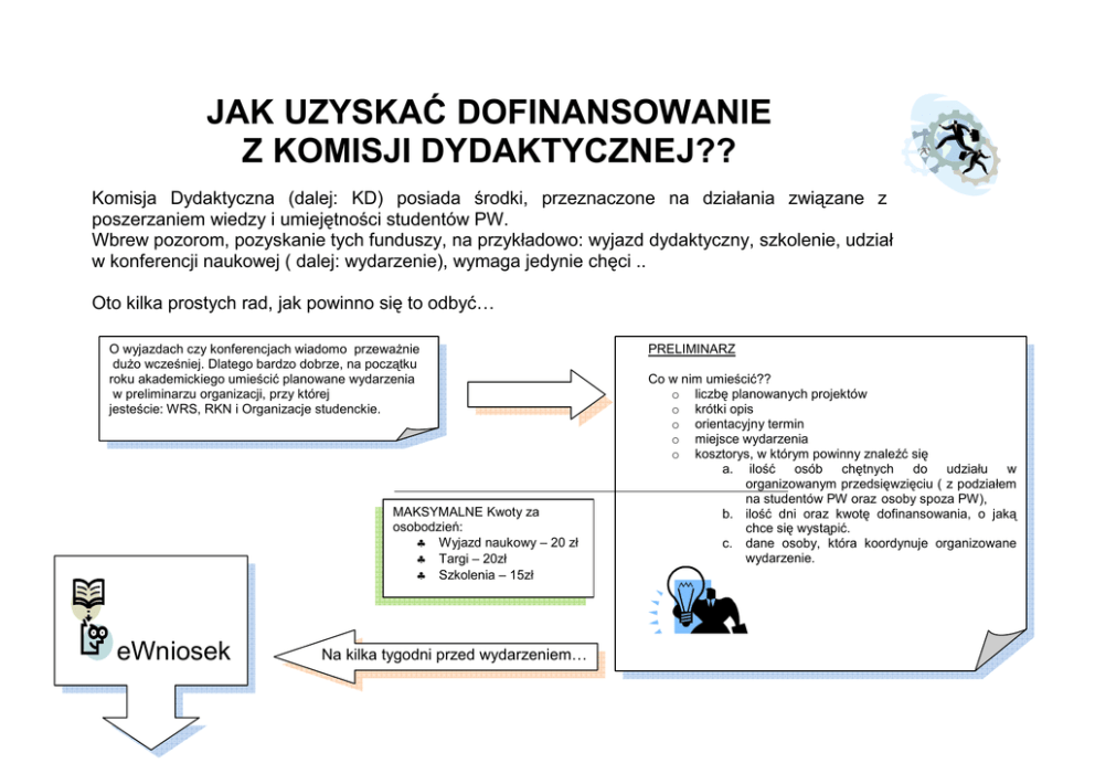 JAK UZYSKAĆ DOFINANSOWANIE Z KOMISJI DYDAKTYCZNEJ?? Komisja Dydaktyczna (dalej: KD) posiada środki, przeznaczone na działania związane z poszerzaniem wiedzy i umiejętności studentów PW. Wbrew pozorom, pozyskanie tych funduszy, na przykładowo: wyjazd dydaktyczny, szkolenie, udział w konferencji naukowej ( dalej: wydarzenie), wymaga jedynie chęci .. Oto kilka prostych rad, jak powinno się to odbyć… O wyjazdach czy konferencjach wiadomo przewaŜnie duŜo wcześniej. Dlatego bardzo dobrze, na początku roku akademickiego umieścić planowane wydarzenia w preliminarzu organizacji, przy której jesteście: WRS, RKN i Organizacje studenckie. MAKSYMALNE Kwoty za osobodzień: ♣ Wyjazd naukowy – 20 zł ♣ Targi – 20zł ♣ Szkolenia – 15zł eWniosek Na kilka tygodni przed wydarzeniem… PRELIMINARZ Co w nim umieścić?? o liczbę planowanych projektów o krótki opis o orientacyjny termin o miejsce wydarzenia o kosztorys, w którym powinny znaleźć się a. ilość osób chętnych do udziału w organizowanym przedsięwzięciu ( z podziałem na studentów PW oraz osoby spoza PW), b. ilość dni oraz kwotę dofinansowania, o jaką chce się wystąpić. c. dane osoby, która koordynuje organizowane wydarzenie. eWNIOSEK forma elektronicznego rozliczenia dofinansowania, Ŝeby korzystać z eWniosku musisz najpierw załoŜyć konto na: https://www.ew2.samorzad.pw.edu.pl NaleŜy zgłosić się do przewodnicząego KD z potwierdzeniem danych z preliminarza oraz kwotą dofinansowania. Najpóźniej na 2 tygodnie przed wydarzeniem naleŜy złoŜyć i wypełnić eWniosek. Co powinien zawierać?? o wstępny kosztorys projektu o ilość uczestników o merytoryczny cel przedsięwzięcia. Wniosek musi być: o zaakceptowany przez dysponenta Twojej jednostki oraz przewodniczącego KD o podpisany (wersja papierowa) w biurze Samorządu Studentów Politechniki Warszawskiej (p. 165) o uzupełniony o tzw. „Ŝółty wniosek”, gdy wydarzenie odbywa się za granicą (wniosek ten podpisuje opiekun koła naukowego lub dziekan wydziału lub rektor) o FAKTURY Podczas wydarzenia płaci się między innymi za przejazdy, nocleg, ubezpieczenie czy jedzenie. Na te wszystkie usługi naleŜy pobierać faktury, które później wykorzystuje się przy rozliczeniu. ZALICZKA Faktury naleŜy brać na: MoŜliwe jest otrzymanie zaliczki przed planowanym wydarzeniem. NaleŜy to jednak uwzględnić w składanym eWniosku. W Biurze Spraw Studenckich (BSS) przy ulicy Noakowskiego w pokoju 217 podpiszesz zobowiązanie do rozliczenia z zaliczki w określonym terminie , aby móc pobrać zaliczkę w Banku PEKAO, lub otrzymać ją przelewem na konto. Wyjazd i co dalej?? Politechnika Warszawska Samorząd Studentów Pl. Politechniki 1 00-661 Warszawa NIP: 525 000 58 34 Regon: 000001554 A po powrocie… ROZLICZENIE W przeciągu dwóch tygodni od ostatniego dnia wyjazdu naleŜy rozliczyć się w eWniosku. Co w nim uwzględnić?? o zmiany w stosunku do wcześniejszego kosztorysu wydarzenia o dane z pobranych faktur o dołączyć sprawozdanie z wydarzenia Poza tym , naleŜy umieścić galerię zdjęć z wydarzenia na portalu polibuda.info, aby inni studenci mogli zobaczyć, co działo się na danym wydarzeniu. A link do galerii przesłać wraz ze sprawozdaniem merytorycznym na adres mailowy: [email protected] NaleŜy pamiętać Ŝe w opisie na odwrocie faktury, powinna znaleźć się: ♣ data wydarzenia ♣ podpis osoby koordynującej. ♣ numer eWniosku ♣ opis za co jest faktura z elementem: „dla studentów PW” Co z tym rozliczeniem?? o musi zostać powtórnie zaakceptowane przez dysponenta Twojej jednostki oraz przewodniczącego KD. o z opisaną fakturą oraz w przypadku wyjazdów wymagających listy uczestników (załącznik numer 5) naleŜy udać się do Gmachu Głównego, do pokoju 165 w celu podpisania rozliczenia. Jeśli okaŜe się, Ŝe na wydarzenie wydano mniej pieniędzy niŜ było we wniosku, resztę zwraca się do BSS. , wcześniej uwzględniając to w rozliczeniu. WAśNE!!! Aby uzyskać dofinansowanie na wyjazd naukowy dla grupy studentów, musi w nim wziąć udział minimum 15, a przypadku targów 20 studentów. MoŜna równieŜ uzyskać dofinansowanie na indywidualny wyjazd. NaleŜy uwzględnić wszystkie koszta związane z projektem. UWAGA!! Suma poniesionych wydatków musi być = sumie źródeł finansowania, a suma dołączonych faktur musi być większa od dofinansowania.