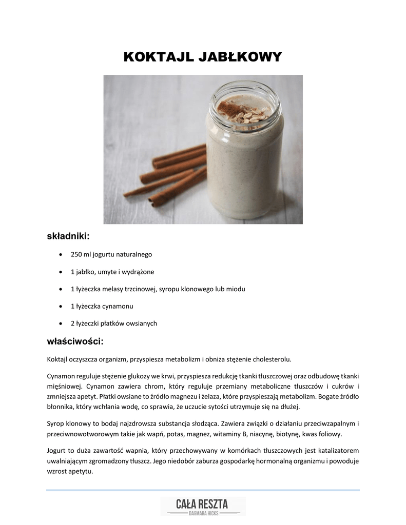 KOKTAJL JABŁKOWY składniki: 250 ml jogurtu naturalnego 1 jabłko, umyte i wydrążone 1 łyżeczka melasy trzcinowej, syropu klonowego lub miodu 1 łyżeczka cynamonu 2 łyżeczki płatków owsianych właściwości: Koktajl oczyszcza organizm, przyspiesza metabolizm i obniża stężenie cholesterolu. Cynamon reguluje stężenie glukozy we krwi, przyspiesza redukcję tkanki tłuszczowej oraz odbudowę tkanki mięśniowej. Cynamon zawiera chrom, który reguluje przemiany metaboliczne tłuszczów i cukrów i zmniejsza apetyt. Płatki owsiane to źródło magnezu i żelaza, które przyspieszają metabolizm. Bogate źródło błonnika, który wchłania wodę, co sprawia, że uczucie sytości utrzymuje się na dłużej. Syrop klonowy to bodaj najzdrowsza substancja słodząca. Zawiera związki o działaniu przeciwzapalnym i przeciwnowotworowym takie jak wapń, potas, magnez, witaminy B, niacynę, biotynę, kwas foliowy. Jogurt to duża zawartość wapnia, który przechowywany w komórkach tłuszczowych jest katalizatorem uwalniającym zgromadzony tłuszcz. Jego niedobór zaburza gospodarkę hormonalną organizmu i powoduje wzrost apetytu.