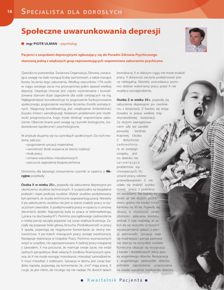16 NpaesczjaaZOZ S ldi z s iteal ndilcaa d o r o s ł y c h Społeczne uwarunkowania depresji ■ mgr Piotr ulman – psycholog Pacjenci z zespołami depresyjnymi zgłaszający się do Poradni Zdrowia Psychicznego stanowią jedną z większych grup reprezentujących wspomniane zaburzenie psychiczne. Zjawisko to potwierdza Światowa Organizacja Zdrowia, zwracająca uwagę na stale rosnącą liczbę zachorowań, a także rosnące koszty leczenia tego zaburzenia. Według szacunków 17% osób w ciągu swojego życia ma przynajmniej jeden epizod wielkiej depresji. Depresja chociaż jest często wyśmiewana i trywializowana stanowi duże zagrożenie dla osób cierpiących na nią. Najłagodniejsze konsekwencje to pogorszenie funkcjonowania społecznego, pogorszenie wyników leczenia chorób somatycznych. Najgorszą konsekwencją jest zwiększenie śmiertelności (ryzyko śmierci samobójczej). Kolejnym problemem jest możliwość prognostyczna, kogo może dotknąć wspomniane zaburzenie. Obecnie brane pod uwagę są czynniki biologiczne, środowiskowe (społeczne) i psychologiczne. W artykule skupimy się na czynnikach społecznych. Do nich możemy zaliczyć: • pogorszenie sytuacji materialnej • samotność (brak wsparcia ze strony rodziny) • brak pracy • zmiana warunków mieszkaniowych • poczucie zagrożenia bezpieczeństwa Omówmy dla lepszego zrozumienia czynniki w oparciu o fikcyjne przykłady: Osoba X w wieku 25+, pojawiły się zaburzenia depresyjne po ukończeniu studiów technicznych. X uczęszczał/a na bezpłatne praktyki i staże podczas studiów. Wybór studiów podyktowany był opiniami, że studia techniczne zagwarantują pracę. Niestety X po zakończeniu studiów nie jest w stanie znaleźć pracy w wyuczonym zawodzie. X podejmował/a pracę w oparciu o umowy zlecenie/o dzieło. Najczęściej była to praca w telemarketingu (,,praca na słuchawkach”). Pomimo początkowego zadowolenia z niskiej pensji zaczęła pojawiać się coraz większa frustracja. Zaczęły się pojawiać bóle głowy, brzucha. Produktywność w pracy X spada, pojawiają się negatywne komentarze ze strony kierownictwa. X po trzech miesiącach pracy zostaje zwolniony/a. Następuje rejestracja w Urzędzie Pracy. Pomimo wyznaczonych wizyt w urzędzie, nie zaproponowano X żadnej pracy związanej z zawodem. X ma poczucie, że marnuje swoje życie, nie widzi żadnych perspektyw. Brak własnych środków finansowych sprawia, że X nie może wynająć mieszkania i mieszkać samodzielnie. X musi mieszkać z rodzicami. Sytuacja w domu jest coraz bardziej napięta, pojawiają się komentarze, że ,,inni” mają pracę. X czuje, że jest nikim, do niczego się nie nadaje. Po dwóch latach bezrobocia, X w dalszym ciągu nie może znaleźć pracy. X dorywczo zaczyna podejmować pracę nielegalną. Niestety pracodawca pomimo dobrze wykonanej pracy przez X nie wypłaca wynagrodzenia. Osoba Z w wieku 35+, pojawiły się zaburzenia depresyjne po zwolnieniu z korporacji. Z bardzo się angażował/a w pracę wielkiej międzynarodowej korporacji. Za dużym zaangażowaniem szły też zarobki powyżej średniej krajowej. Osoba Z dotychczas zadowolony/a ze swojego związku, jedno dziecko nie sprawiające problemów wychowawczych. Po utracie pracy, wbrew przewidywaniom Z nie udało się znaleźć szybko nowej pracy, z podobnymi zarobkami. Nie byłoby to może aż tak dużym problemem, gdyby nie kredyt mieszkaniowy na 30 lat. Pojawiły się obawy o możliwość utraty zdolności spłacania kredytu. Jednak Z żyje nadzieją, że jakoś da się wszystko (z dużymi wyrzeczeniami) spłacić z pensji partnera/ki. Sytuacja staje się trudniejsza i pensja partnera nie starcza na wszystkie wydatki. Konieczna okazuje się rezygnacja z karate i dodatkowych lekcji języka angielskiego dziecka. Rezygnacja z angielskiego zadowoliła dziecko, jednakże zaprzestanie uczęszczania na karate wyraźnie rozdrażniło dziecko. K w a r t a l n i k Pa c j e n t a S p e c j a l i s t aNdalsaz ad od rz ioeslłnyi c ha Dziecko zaczyna bić się z kolegami w szkole. Z jest wzywana/y do szkoły. Nauczycielka zwraca uwagę, że dziecko się zmieniło na gorsze. Informacja ta obniżyła nastrój Z. Sytuacja w domu staje się napięta. Wszyscy domownicy łatwo wpadają w złość, przy stłuczonej szklance, zapalonym świetle w pustym pokoju, pojawiają się dyskusje o braku oszczędności i gospodarności. Z ma problemy z zasypianiem i koncentracją, z każdym miesiącem bezrobocia traci wiarę w swoje możliwości. Osoba Y w wieku 67 lat, pojawiły się zaburzenia depresyjne po przejściu na emeryturę. Y początkowo był/a zadowolony/a po przejściu na emeryturę. Ciężka praca w fabryce i pojawiające się schorzenia zmniejszyły tempo wykonywania różnych czynności przez Y. W swojej dawnej pracy Y nie miał/a dużej styczności z komputerem. Było wiadomo, że komputer reguluje automatykę zakładu, ale Y nie musiał z nim pracować. Był fachowcem w wykonywanej przez siebie pracy i często pomagał nowym pracownikom. Niestety, gdy Y przestał pracować, a własne dzieci dawno się wyprowadziły Y zaczął czuć pustkę. Partner/ ka zmarł/a dwa lata temu na raka. Gdy Y chce sobie załatwić ,,kartę warszawiaka” dowiaduje się od znudzonej pracownicy biura obsługi pasażera, że szczegółowe informacje znajdzie w Internecie. Dodatkowo jeśli skorzysta z Internetu, nie będzie musiał/a stać w długiej kolejce, która może wywołać bóle w stawach kolanowych. Y chce także załatwić pewne sprawy u swojego operatora telefonii komórkowej. Również otrzymuje informacje, że wszystkie potrzebne dokumenty i informacje znajdzie w Internecie, wystarczy, że sobie wydrukuje i podpisze. Ewentualnie można zrobić wszystko on-line, a dokumenty do podpisu przyniesie kurier. Y czuje się coraz bardziej pogubiony, nie potrafi obsługiwać komputera, bo nie było mu to wcześniej do niczego potrzebne. Y nie wie co ma robić. Bardzo się tym den