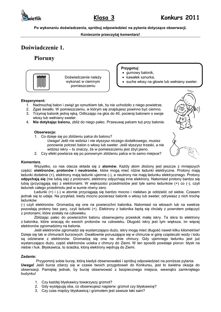 Klasa 3 Konkurs 2011 Po wykonaniu doświadczenia, spróbuj odpowiedzieć na pytania dotyczące obserwacji. Koniecznie przeczytaj komentarz! Doświadczenie 1. Pioruny Doświadczenie należy wykonać w ciemnym pomieszczeniu Przygotuj: gumowy balonik, kawałek sznurka, suche włosy na głowie lub wełniany sweter. Eksperyment: 1. Nadmuchaj balon i zwiąż go sznurkiem tak, by nie uchodziło z niego powietrze. 2. Zgaś światło. W pomieszczeniu, w którym się znajdujesz powinno być ciemno. 3. Trzymaj balonik jedną ręką. Odliczając na głos do 40, pocieraj balonem o swoje włosy lub wełniany sweter. 4. Nie dotykając balonu, zbliż do niego palec. Przesuwaj palcem tuż przy balonie. Obserwacja: 1. Co dzieje się po zbliżeniu palca do balonu? Uwaga! Jeśli nie widzisz i nie słyszysz niczego dodatkowego, musisz ponownie potrzeć balon o włosy lub sweter. Jeśli słyszysz trzaski, a nie widzisz iskry – to znaczy, że w pomieszczeniu jest zbyt jasno. 2. Czy efekt powtarza się po ponownym zbliżeniu palca w to samo miejsce? Komentarz. Wszystko, co nas otacza składa się z atomów. Każdy atom złożony jest jeszcze z mniejszych części: elektronów, protonów i neutronów, które mogą mieć różne ładunki elektryczne. Protony mają ładunki dodatnie (+), elektrony mają ładunki ujemne (-), a neutrony nie mają ładunku elektrycznego. Protony odpychają się (nie lubią się) z protonami, elektrony odpychają inne elektrony. Natomiast protony bardzo się lubią (przyciągają się) z elektronami. W większości przedmiotów jest tyle samo ładunków (+) co (-), czyli ładunek całego przedmiotu jest w sumie równy zero. Ładunki (+) i (-) w atomie przyciągają się bardzo mocno i niełatwo je oddzielić od siebie. Czasem jednak się to udaje. Na przykład, kiedy mocno pocierasz balonik o włosy lub sweter, odrywasz z nich trochę ładunków (-) czyli elektronów. Gromadzą się one na powierzchni balonika. Natomiast na włosach lub na swetrze pozostają protony bez pary, czyli ładunki (+). Elektrony z balonika będą się chciały z powrotem połączyć z protonami, które zostały na człowieku. Zbliżając palec do powierzchni balonu obserwujemy przeskok małej iskry. Ta iskra to elektrony z balonika, które wracają do swoich protonów na człowieku. Długość iskry jest tym większa, im więcej elektronów zgromadzimy na balonie. Jeśli elektronów zgromadzi się wystarczająco dużo, iskry mogą mieć długość nawet kilku kilometrów! Dzieje się tak w chmurach burzowych. Gwałtownie poruszające się w chmurze w górę cząsteczki wody i lodu są odzierane z elektronów. Gromadzą się ona na dnie chmury. Gdy ujemnego ładunku jest już wystarczająco dużo, część elektronów ucieka z chmury do Ziemi. W ten sposób powstaje piorun: błysk na niebie i huk. Błyskawica, to ścieżka, którą elektrony wędrują do Ziemi. Zadanie: Przypomnij sobie burzę, którą kiedyś obserwowałeś i spróbuj odpowiedzieć na poniższe pytania. Uwaga! Jeśli burza zdarzy się w czasie twoich przygotowań do Konkursu, jest to świetna okazja do obserwacji. Pamiętaj jednak, by burzę obserwować z bezpiecznego miejsca, wewnątrz zamkniętego budynku! 1. Czy każdej błyskawicy towarzyszy grzmot? 2. Gdy występują oba, co obserwujesz najpierw: grzmot czy błyskawicę? 3. Czy czas między błyskawicą i grzmotem jest zawsze taki sam? Klasa 3 Konkurs 2011 Komentarz. Światło porusza się bardzo szybko, niemalże błyskawicznie – ponad 1 000 000 000 km/h (miliard kilometrów na godzinę!). Dźwięk rozchodzi się znacznie wolniej – ok. 1 200 km/h (tysiąc dwieście kilometrów na godzinę). Dlatego właśnie najpierw obserwujemy błyskawicę, a dopiero po chwili słyszymy grzmot. Dźwięk przebywa 1 kilometr w czasie 3 sekund. Jeśli chcesz wiedzieć, w jakiej odległości od ciebie uderzył piorun, musisz policzyć sekundy upływające między błyskawicą i grzmotem i podzielić ich liczbę przez 3. Na przykład: jeżeli pomiędzy błyskiem, a grzmotem doliczysz do 6, oznacza to, że piorun uderzył w odległości 2 kilometrów od miejsca, w którym stoisz (bo 6:3 = 2 ). Im bliżej ciebie jest burza, tym krótszy czas pomiędzy błyskiem a grzmotem. Zapamiętaj: Podczas burzy chroń się w domu. Jeśli jednak burza zastała cię na zewnątrz i nie ma w pobliżu żadnego budynku, nie stój pod drzewem, ani w pobliżu innego wysokiego obiektu. Stań z daleka od linii energetycznych i nie wchodź do pomieszczeń z transformatorami. Piorun niesie z sobą potężną energię i może spowodować porażenie i śmierć! Klasa 3 Konkurs 2011 Po wykonaniu doświadczenia, spróbuj odpowiedzieć na pytania dotyczące obserwacji. Koniecznie przeczytaj komentarz! Doświadczenie 2. Ruch powietrza. Do wykonania doświadczenia potrzebny jest ciepły kaloryfer. Przygotuj: 2 ołówki, ostro zatemperowane z jednej strony, 1 gładką kartkę A4 (do drukarki) lub z bloku technicznego, kawałek plasteliny, taśmę klejącą, linijkę, 30 cm nitki, nożyczki, stół lub biurko z krzesłem. Eksperyment – część 1: 1. Usiądź na krześle przy stole lub biurku. 2. Uformuj kulkę z plasteliny i przyklej ją na środku kartki. Przyklej rogi kartki kawałkami taśmy klejącej do stołu tak, by leżała ona płasko. 3. Przyklej taśmą klejącą jeden koniec nitki do niezatemperowanej końcówki pierwszego ołówka - na wysokości ok. 1 cm od tej końcówki. 4. Na drugim, swobodnym końcu nitki zawiąż pętelkę. 5. Nawiń nić na pierwszy ołówek tak, żeby wystawała tylko pętelka. 6. Uważając, by nitka nie rozwinęła się, umocuj pionowo ołówek z nitką w kulce plasteliny niezatemperowaną końcówką do dołu. 7. Do wystającej pętelki włóż drugi ołówek ostrzem w dół i lekko napręż nitkę. 8. Jedną ręką przytrzymuj pierwszy ołówek w plastelinie. Drugim ołówkiem rysuj linię dookoła pierwszego ołówka tak, by nawinięta na nim nitka - rozwijała się. Pilnuj, aby nitka był