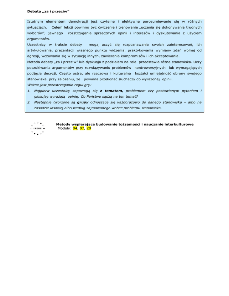 Debata „za i przeciw” Istotnym elementem demokracji jest czytelne i efektywne porozumiewanie się w różnych sytuacjach. Celem lekcji powinno być ćwiczenie i trenowanie „uczenia się dokonywania trudnych wyborów”, jawnego rozstrzygania sprzecznych opinii i interesów i dyskutowania z użyciem argumentów. Uczestnicy w trakcie debaty mogą uczyć się rozpoznawania swoich zainteresowań, ich artykułowania, prezentacji własnego punktu widzenia, praktykowania wymiany zdań wolnej od agresji, wczuwania się w sytuację innych, zawierania kompromisów i ich akceptowania. Metoda debaty „za i przeciw” lub dyskusja z podziałem na role przedstawia różne stanowiska. Uczy poszukiwania argumentów przy rozwiązywaniu problemów kontrowersyjnych lub wymagających podjęcia decyzji. Często ostra, ale rzeczowa i kulturalna stanowiska przy założeniu, że kształci umiejętność obrony swojego powinna przekonać słuchaczy do wyrażonej opinii. Ważne jest przestrzeganie reguł gry: 1. Najpierw uczestnicy zapoznają się z tematem, problemem czy postawionym pytaniem i głosując wyrażają opinię: Co Państwo sądzą na ten temat? 2. Następnie tworzone są grupy odnoszące się każdorazowo do danego stanowiska – albo na zasadzie losowej albo według zajmowanego wobec problemu stanowiska. Metody wspierające budowanie tożsamości i nauczanie interkulturowe Moduły: 04, 07, 20 Debata „za i przeciw” 3. Na podstawie materiałów grupy zajmują się w sposób pogłębiony „swoim” stanowiskiem i wypracowują punkty widzenia z ich uzasadnieniem. Przy czym uczestnicy grupy powinni rozpoznać i przemyśleć także argumenty partii przeciwnej i zastanowić się, jak można je obalić. Następnie grupy wybierają 2 lub 3 reprezentantów swojej grupy. 4. Dla przeprowadzenia debaty należy zadbać o odpowiedni sposób siedzenia: z przodu siedzą moderatorzy, po dwóch przeciwległych stronach „partie”(reprezentanci grup), za nimi pozostali uczestnicy jako obserwatorzy. 5. Moderatorzy otwierają debatę, witają obserwatorów, nazywają temat, przedstawiają biorących udział w rozmowie i wyjaśniają przebieg gry metodycznej. Następnie przedstawiciele grup każdorazowo wygłaszają ok. trzyminutowy wstęp. Wymiana argumentów następuje w wystąpieniach i kontrwystąpieniach (ok. 15-20 min.). 6. W analizie moderatorzy proszą obserwatorów o wzięcie udziału w rundzie i o przekazanie, które argumenty uważają za przekonywające, a które nie. Poza tym powinni przekazać swoje wrażenie i powiedzieć, co było dobre, a co się im nie podobało. 7. Na zakończenie debaty zostaje przeprowadzone jeszcze raz głosowanie nad pytaniem wyjściowym. według: Dr Lothar Scholz. Methoden-Kiste. Bundeszentrale für politische Bildung. Köln 2004 Metody wspierające budowanie tożsamości i nauczanie interkulturowe Moduły: 04, 07, 20