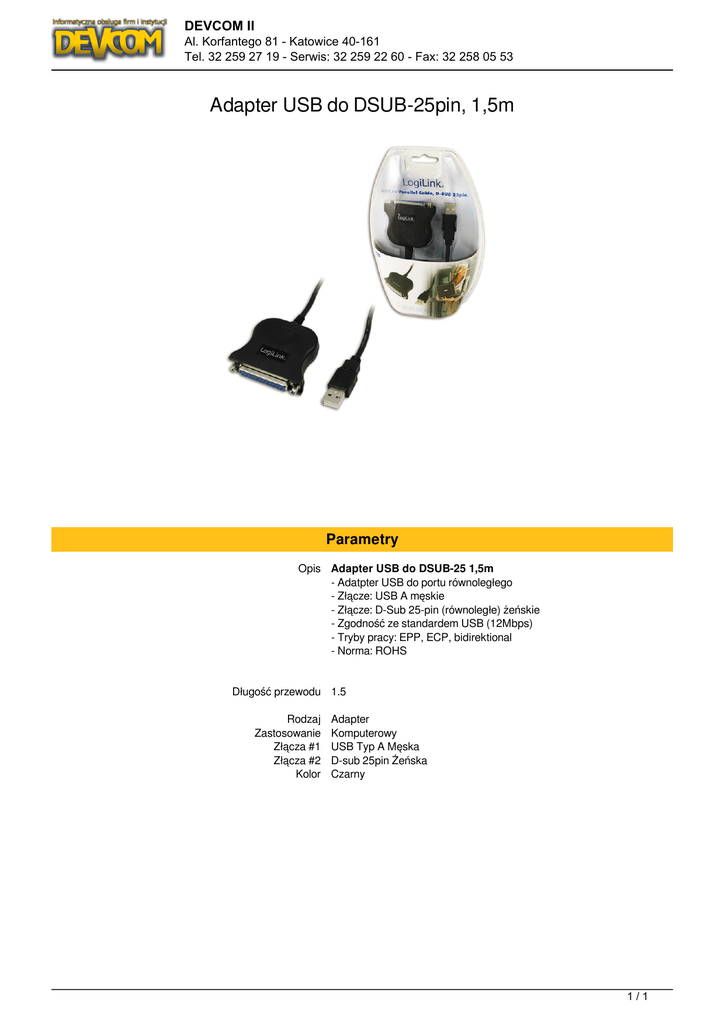 DEVCOM II Al. Korfantego 81 - Katowice 40-161 Tel. 32 259 27 19 - Serwis: 32 259 22 60 - Fax: 32 258 05 53 Adapter USB do DSUB-25pin, 1,5m Parametry Opis Adapter USB do DSUB-25 1,5m - Adatpter USB do portu równoległego - Złącze: USB A męskie - Złącze: D-Sub 25-pin (równoległe) żeńskie - Zgodność ze standardem USB (12Mbps) - Tryby pracy: EPP, ECP, bidirektional - Norma: ROHS Długość przewodu 1.5 Rodzaj Zastosowanie Złącza #1 Złącza #2 Kolor Adapter Komputerowy USB Typ A Męska D-sub 25pin Żeńska Czarny 1/1 Powered by TCPDF (www.tcpdf.org)