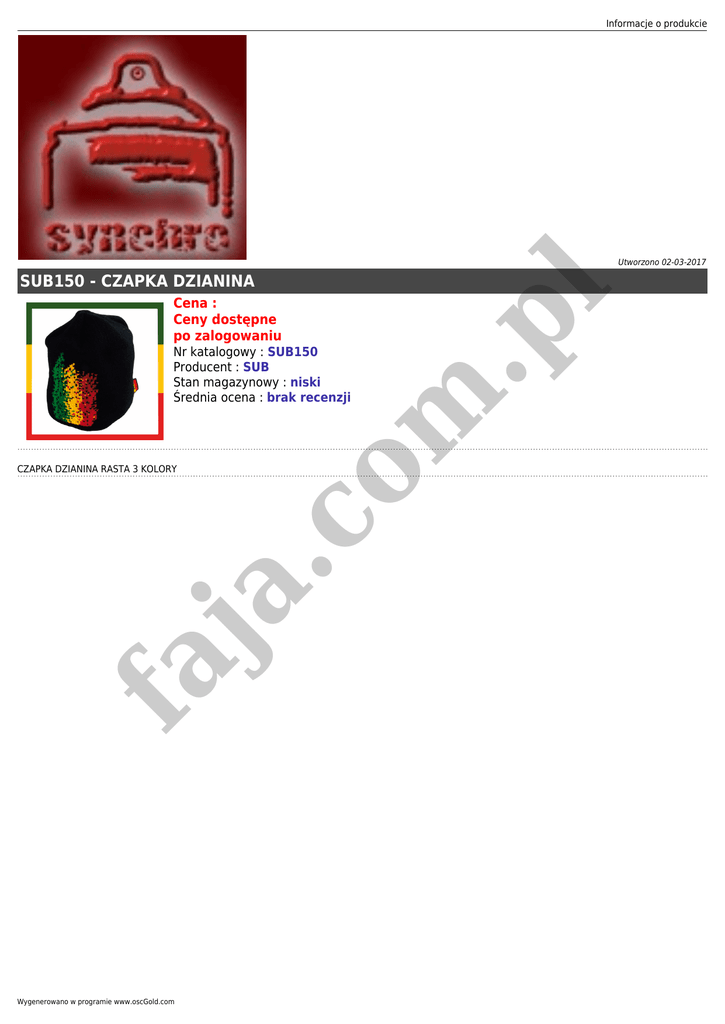 Informacje o produkcie SUB150 - CZAPKA DZIANINA Cena : Ceny dostępne po zalogowaniu fa ja .c o CZAPKA DZIANINA RASTA 3 KOLORY m Nr katalogowy : SUB150 Producent : SUB Stan magazynowy : niski Średnia ocena : brak recenzji .p l Utworzono 02-03-2017 Wygenerowano w programie www.oscGold.com