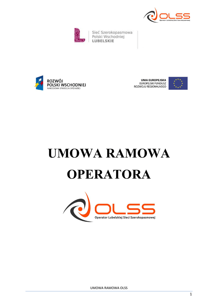 UMOWA RAMOWA OPERATORA UMOWA RAMOWA OLSS 1 UMOWA RAMOWA Nr _____________________ zawarta dnia: _____________________ w Lublinie zwana dalej „Umową Ramową” pomiędzy: _______________________________________________________________adres do korespondencji ____________________________________________________, wpisaną do rejestru przedsiębiorców Krajowego Rejestru Sądowego pod numerem KRS ___________________, NIP ________________, REGON ______________kapitał zakładowy ___________________złotych zwana dalej „OI” lub „Operatorem Infrastruktury”, reprezentowanym przez: 1. …………………………………….… - …………………………………….… 2. ………………………………………. - …………………………………….… a __________________________________________________ z siedzibą w _____________________, ul. ____________________________________________, __________________, wpisaną do rejestru przedsiębiorców Krajowego Rejestru Sądowego pod numerem KRS __________________________, której dokumentacja przechowywana jest przez Sąd Rejonowy _______________________________ _________________________Wydział Krajowego Rejestru Sądowego, REGON: _______________, NIP: _____________________, legitymującą się Wpisem do Rejestru Przedsiębiorców Telekomunikacyjnych prowadzonego przez Prezesa UKE, pod numerem _______________, wysokość kapitału zakładowego ________________________________zł, zwaną dalej „OSD” lub „Operatorem Sieci Dostępowej”, reprezentowaną przez: 1. …………………………………….… - …………………………………….… 2. ………………………………………. - …………………………………….… OI lub OSD zwani są również dalej każdy z osobna „Stroną” lub łącznie „Stronami” Umowy Ramowej. UMOWA RAMOWA OLSS 2 CZĘŚĆ I. OGÓLNA Rozdział 1. Definicje Awaria – stan techniczny Infrastruktury OI, powodujący brak dostępności Usługi lub pogorszenie parametrów jakościowych Usługi, uniemożliwiający korzystanie z niej przez OSD Ciemne włókno światłowodowe – włókno światłowodowe umożliwiające realizację usługi transmisji danych Czas Reakcji na Awarię (CRA) – czas liczony od momentu potwierdzenia drogą elektroniczną zgłoszenia Awarii, przez Stronę odpowiedzialną za usunięcie Awarii do momentu podjęcia działań mających na celu jej usunięcie i przywrócenie pełnej funkcjonalności Usługi Czas Usunięcia Awarii (CUA) – czas liczony od momentu potwierdzenia drogą elektroniczną zgłoszenia Awarii przez Stronę odpowiedzialną za usunięcie Awarii do momentu potwierdzenia drogą pisemną lub elektroniczną, potwierdzenia usunięcia Awarii. Usunięcie Awarii oznacza stan, w którym przywrócone zostają poprawne parametry techniczne i jakościowe świadczonej Usługi. Czas Usunięcia Awarii jest czasem netto tzn. nie uwzględnia czasu dokonywania przez OSD czynności niezbędnych do usunięcia Awarii (np. czas dojazdu służb technicznych OSD) Data Aktywacji Usługi (DAU) – data, od której zgodnie z Umową Szczegółową OI powinien rozpocząć świadczenie Usługi Decyzja Notyfikacyjna - decyzja Komisji Europejskiej z dnia 10.11.2011r. roku dotycząca Pomocy państwa SA.33441 (2011/N), SA.33440 (2011/N), SA.33439 (2011/N), SA.33438 (2011/N) & SA 30851 (2011/N) – Polska Projekt pt. Sieć szerokopasmowa Polski Wschodniej Długość optyczna – rzeczywista długość włókna światłowodowego na danym odcinku, określona przy pomocy urządzeń pomiarowych Dostęp – korzystanie lub współkorzystanie z Infrastruktury na warunkach i w zakresie opisanym w Umowie Ramowej, celem świadczenia Usług Dzień Roboczy (DR) – każdy dzień tygodnia, z wyjątkiem sobót i niedziel oraz innych dni ustawowo wolnych od pracy obowiązujących na obszarze Rzeczypospolitej Polskiej Dzierżawa Ciemnych Włókien – dzierżawa jednego lub więcej ciemnych włókien światłowodowych na ciągłym odcinku o określonej Długości optycznej, zestawionych pomiędzy kolokacjami i zakończone na przełącznicy optycznej OI lub dzierżawa jednego lub więcej ciemnych włókien światłowodowych zestawionych pomiędzy studniami kablowymi OI i połączonych z siecią OSD Dzierżawa Kanalizacji Kablowej – umożliwienie OSD dostępu i korzystania z Kanalizacji Kablowej oraz infrastruktury towarzyszącej, jeżeli jest ona elementem Infrastruktury OI, w celu ułożenia kabli telekomunikacyjnych Infrastruktura – urządzenia telekomunikacyjne oraz urządzenia towarzyszące niezbędne do prawidłowego działania Usługi, z wyjątkiem telekomunikacyjnych urządzeń końcowych, oraz w szczególności: powierzchnia kolokacyjna, szafy telekomunikacyjne, kanalizacje, linie kablowe, słupy, wieże, maszty, kable, przewody i osprzęt wykorzystywany do zapewnienia telekomunikacji UMOWA RAMOWA OLSS 3 Kanalizacja kablowa – zespół podziemnych rur i studni (zasobników, komór i szafek kablowych) służący do układania kabli telekomunikacyjnych Kolokacja – udostępnianie fizycznej przestrzeni lub urządzeń technicznych w celu umieszczenia i podłączenia niezbędnego sprzętu OSD, w tym urządzeń telekomunikacyjnych Kanał optyczny (Lambda) – fala świetlna o określonej długości w systemie (C/D/U)WDM będąca nośnikiem sygnału cyfrowego Nadzór OI – czynności podejmowane przez OI w sytuacji, gdy OSD zgodnie z wcześniejszym zgłoszeniem wykonuje prace na Obiektach lub Infrastrukturze OI wykorzystywanej na potrzeby dostępu do Infrastruktury Obiekt – zorganizowany zespół gruntów, budynków i Infrastruktury w posiadaniu OI, przeznaczony do świadczenia usług telekomunikacyjnych Operator Infrastruktury (OI) – przedsiębiorca telekomunikacyjny do Infrastruktury OI na podstawie niniejszej Umowy Ramowej oferujący Dostęp Operator Sieci Dostępowej (OSD) – przedsiębiorca telekomunikacyjny, jednostka samorządu terytori