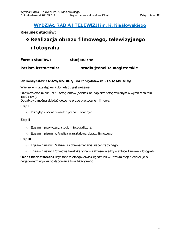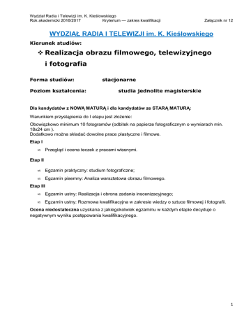 Wydział Radia i Telewizji im. K. Kieślowskiego Rok akademicki 2016/2017 Kryterium — zakres kwalifikacji Załącznik nr 12 WYDZIAŁ RADIA I TELEWIZJI im. K. Kieślowskiego Kierunek studiów: Realizacja obrazu filmowego, telewizyjnego i fotografia Forma studiów: Poziom kształcenia: stacjonarne studia jednolite magisterskie Dla kandydatów z NOWĄ MATURĄ i dla kandydatów ze STARĄ MATURĄ: Warunkiem przystąpienia do I etapu jest złożenie: Obowiązkowo minimum 10 fotogramów (odbitek na papierze fotograficznym o wymiarach min. 18x24 cm ). Dodatkowo można składać dowolne prace plastyczne i filmowe. Etap I • Przegląd i ocena teczek z pracami własnymi. Etap II • Egzamin praktyczny: studium fotograficzne; • Egzamin pisemny: Analiza warsztatowa obrazu filmowego. Etap III • Egzamin ustny: Realizacja i obrona zadania inscenizacyjnego; • Egzamin ustny: Rozmowa kwalifikacyjna w zakresie wiedzy o sztuce filmowej i fotografii. Ocena niedostateczna uzyskana z jakiegokolwiek egzaminu w każdym etapie decyduje o negatywnym wyniku postępowania kwalifikacyjnego. 1 Wydział Radia i Telewizji im. K. Kieślowskiego Rok akademicki 2016/2017 Kryterium — zakres kwalifikacji Załącznik nr 12 Kierunek studiów: Organizacja produkcji filmowej i telewizyjnej Forma studiów: Poziom kształcenia: stacjonarne studia pierwszego stopnia Dla kandydatów z NOWĄ MATURĄ i dla kandydatów ze STARĄ MATURĄ: Egzamin ustny: Wiedza o filmie i mediach. Kierunek studiów: Organizacja produkcji filmowej i telewizyjnej Forma studiów: Poziom kształcenia: stacjonarne studia drugiego stopnia O przyjęcie na studia mogą się ubiegać absolwenci studiów wyższych (licencjackich i magisterskich) kierunku organizacja produkcji filmowej i telewizyjnej, a także kierunków ekonomicznych, prawa, socjologii, kulturoznawstwa, dziennikarstwa i komunikacji społecznej. Kandydat ubiegający się o przyjęcie posiada kwalifikacje oraz kompetencje niezbędne do podjęcia kształcenia na studiach II stopnia na tym kierunku, a w szczególności: • ma podstawową wiedzę o różnych rodzajach struktur i instytucji społecznych (politycznych, prawnych, ekonomicznych) oraz o współczesnym życiu kulturalnym i instytucjach kultury. Przyjęcia na studia do granicy limitu odbywać się będą na podstawie: Rozmowy kwalifikacyjnej weryfikującej wiedzę o różnych rodzajach struktur i instytucji społecznych (politycznych, prawnych, ekonomicznych) oraz o współczesnym życiu kulturalnym i instytucjach kultury. W przypadku kandydatów, którzy uzyskali tę samą ocenę z rozmowy kwalifikacyjnej, jako kolejne kryterium stosuje się ocenę z pracy dyplomowej, a następnie z egzaminu dyplomowego. Osoby zakwalifikowane, których program ukończonych studiów znacznie odbiega od programu na kierunku organizacja produkcji filmowej i telewizyjnej, mogą być zobowiązane do zaliczenia różnic programowych. 2 Wydział Radia i Telewizji im. K. Kieślowskiego Rok akademicki 2016/2017 Kryterium — zakres kwalifikacji Załącznik nr 12 Kierunek studiów: Reżyseria Forma studiów: Poziom kształcenia: stacjonarne studia pierwszego stopnia Dla kandydatów z NOWĄ MATURĄ i dla kandydatów ze STARĄ MATURĄ: Warunkiem przystąpienia do I etapu jest złożenie: 1. Jednego scenariusza filmu fabularnego (30 min.). 2. Dwóch projektów filmów dokumentalnych w tym jeden oparty na własnych doświadczeniach, drugi dowolny. 3. Jednostronicowego pomysłu na „prowokowanie rzeczywistości”, uruchamiającego w bohaterach zdarzenia, zachowanie warte obserwowania kamerą (np. event, performance). 4. Cykl fotografii — autoportret. 5. Cyklu dziesięciu fotografii opisujących świat w którym żyje kandydat. 6. Innych dowolnych prac własnych (film, literatura, sztuki plastyczne). Uwaga. Komisja nie zwraca egzemplarzy prac własnych pisemnych. Załączone prace filmowe należy składać wyłącznie w formacie DVD. Etap I • Egzamin pisemny: Zadanie analityczno – scenariopisarskie. • Egzamin ustny: Zadania plastyczne ( montażowe i inscenizacyjne). • Egzamin ustny: Obrona prac własnych (teczka). Etap II • Zadanie dokumentalne – reportaż. • Zadanie inscenizacyjne (studio). • Rozmowa kwalifikacyjna. Obrona zadania dokumentalnego i inscenizacji. Ocena niedostateczna uzyskana z jakiegokolwiek egzaminu w każdym etapie decyduje o negatywnym wyniku postępowania kwalifikacyjnego. O ostatecznym przyjęciu na studia decyduje liczba punktów w ramach ustalonego limitu. 3 Wydział Radia i Telewizji im. K. Kieślowskiego Rok akademicki 2016/2017 Kryterium — zakres kwalifikacji Załącznik nr 12 Kierunek studiów: Reżyseria Forma studiów: Poziom kształcenia: stacjonarne studia drugiego stopnia O przyjęcie na studia mogą ubiegać się absolwenci studiów wyższych licencjackich kierunku reżyseria /w zakresie reżyserii filmowej/. Kandydat ubiegający się o przyjęcie posiada kwalifikacje oraz kompetencje niezbędne do podjęcia kształcenia na studiach II stopnia na tym kierunku, a w szczególności: • potrafi samodzielnie tworzyć, realizować i publicznie prezentować własne założenia estetyczne i autorskie koncepcje artystyczne w zakresie reżyserii w dziedzinie filmu i telewizji; • potrafi samodzielnie zmontować i udźwiękowić krótki film fabularny; • potrafi zrealizować, zmontować i udźwiękowić krótki film dokumentalny w oparciu o umiejętności obserwacji, rekonstrukcji i inscenizacji profilmowej rzeczywistości; • jest zdolny do pogłębiania wiedzy i rozszerzania horyzontów poznawczych w ramach ustawicznego samokształcenia i weryfikowania przyjętych założeń oraz postaw intelektualnych i artystycznych; • wykazuje zdolność do krytycznej oceny własnych i cudzych działań i dokonań artystycznych, opinii i postaw twórczych i intelektualnych. Rozmowa kwalifikacyjna i sprawdzian uzdolnień artystycznych w oparciu o przedstawione własne prace audiowizualne – film fabularny i dokumentalny zr