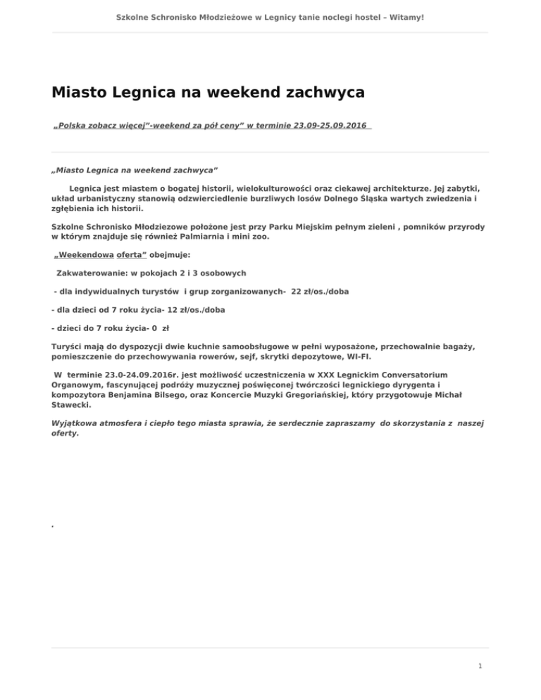 Szkolne Schronisko Młodzieżowe w Legnicy tanie noclegi hostel – Witamy! Miasto Legnica na weekend zachwyca „Polska zobacz więcej”-weekend za pół ceny” w terminie 23.09-25.09.2016 „Miasto Legnica na weekend zachwyca” Legnica jest miastem o bogatej historii, wielokulturowości oraz ciekawej architekturze. Jej zabytki, układ urbanistyczny stanowią odzwierciedlenie burzliwych losów Dolnego Śląska wartych zwiedzenia i zgłębienia ich historii. Szkolne Schronisko Młodziezowe położone jest przy Parku Miejskim pełnym zieleni , pomników przyrody w którym znajduje się również Palmiarnia i mini zoo. „Weekendowa oferta” obejmuje: Zakwaterowanie: w pokojach 2 i 3 osobowych - dla indywidualnych turystów i grup zorganizowanych- 22 zł/os./doba - dla dzieci od 7 roku życia- 12 zł/os./doba - dzieci do 7 roku życia- 0 zł Turyści mają do dyspozycji dwie kuchnie samoobsługowe w pełni wyposażone, przechowalnie bagaży, pomieszczenie do przechowywania rowerów, sejf, skrytki depozytowe, WI-FI. W terminie 23.0-24.09.2016r. jest możliwość uczestniczenia w XXX Legnickim Conversatorium Organowym, fascynującej podróży muzycznej poświęconej twórczości legnickiego dyrygenta i kompozytora Benjamina Bilsego, oraz Koncercie Muzyki Gregoriańskiej, który przygotowuje Michał Stawecki. Wyjątkowa atmosfera i ciepło tego miasta sprawia, że serdecznie zapraszamy do skorzystania z naszej oferty. . 1