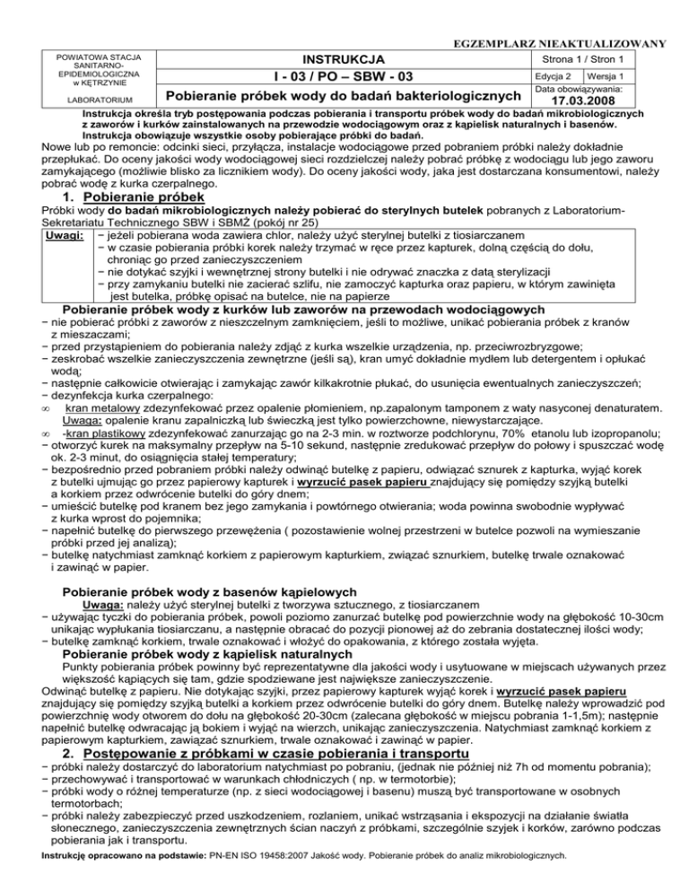 EGZEMPLARZ NIEAKTUALIZOWANY POWIATOWA STACJA SANITARNOEPIDEMIOLOGICZNA w KĘTRZYNIE I - 03 / PO – SBW - 03 LABORATORIUM Pobieranie próbek wody do badań bakteriologicznych INSTRUKCJA Strona 1 / Stron 1 Edycja 2 Wersja 1 Data obowiązywania: 17.03.2008 Instrukcja określa tryb postępowania podczas pobierania i transportu próbek wody do badań mikrobiologicznych z zaworów i kurków zainstalowanych na przewodzie wodociągowym oraz z kąpielisk naturalnych i basenów. Instrukcja obowiązuje wszystkie osoby pobierające próbki do badań. Nowe lub po remoncie: odcinki sieci, przyłącza, instalacje wodociągowe przed pobraniem próbki naleŜy dokładnie przepłukać. Do oceny jakości wody wodociągowej sieci rozdzielczej naleŜy pobrać próbkę z wodociągu lub jego zaworu zamykającego (moŜliwie blisko za licznikiem wody). Do oceny jakości wody, jaka jest dostarczana konsumentowi, naleŜy pobrać wodę z kurka czerpalnego. 1. Pobieranie próbek Próbki wody do badań mikrobiologicznych naleŜy pobierać do sterylnych butelek pobranych z LaboratoriumSekretariatu Technicznego SBW i SBMś (pokój nr 25) Uwagi: − jeŜeli pobierana woda zawiera chlor, naleŜy uŜyć sterylnej butelki z tiosiarczanem − w czasie pobierania próbki korek naleŜy trzymać w ręce przez kapturek, dolną częścią do dołu, chroniąc go przed zanieczyszczeniem − nie dotykać szyjki i wewnętrznej strony butelki i nie odrywać znaczka z datą sterylizacji − przy zamykaniu butelki nie zacierać szlifu, nie zamoczyć kapturka oraz papieru, w którym zawinięta jest butelka, próbkę opisać na butelce, nie na papierze Pobieranie próbek wody z kurków lub zaworów na przewodach wodociągowych − nie pobierać próbki z zaworów z nieszczelnym zamknięciem, jeśli to moŜliwe, unikać pobierania próbek z kranów z mieszaczami; − przed przystąpieniem do pobierania naleŜy zdjąć z kurka wszelkie urządzenia, np. przeciwrozbryzgowe; − zeskrobać wszelkie zanieczyszczenia zewnętrzne (jeśli są), kran umyć dokładnie mydłem lub detergentem i opłukać wodą; − następnie całkowicie otwierając i zamykając zawór kilkakrotnie płukać, do usunięcia ewentualnych zanieczyszczeń; − dezynfekcja kurka czerpalnego: • kran metalowy zdezynfekować przez opalenie płomieniem, np.zapalonym tamponem z waty nasyconej denaturatem. Uwaga: opalenie kranu zapalniczką lub świeczką jest tylko powierzchowne, niewystarczające. • -kran plastikowy zdezynfekować zanurzając go na 2-3 min. w roztworze podchlorynu, 70% etanolu lub izopropanolu; − otworzyć kurek na maksymalny przepływ na 5-10 sekund, następnie zredukować przepływ do połowy i spuszczać wodę ok. 2-3 minut, do osiągnięcia stałej temperatury; − bezpośrednio przed pobraniem próbki naleŜy odwinąć butelkę z papieru, odwiązać sznurek z kapturka, wyjąć korek z butelki ujmując go przez papierowy kapturek i wyrzucić pasek papieru znajdujący się pomiędzy szyjką butelki a korkiem przez odwrócenie butelki do góry dnem; − umieścić butelkę pod kranem bez jego zamykania i powtórnego otwierania; woda powinna swobodnie wypływać z kurka wprost do pojemnika; − napełnić butelkę do pierwszego przewęŜenia ( pozostawienie wolnej przestrzeni w butelce pozwoli na wymieszanie próbki przed jej analizą); − butelkę natychmiast zamknąć korkiem z papierowym kapturkiem, związać sznurkiem, butelkę trwale oznakować i zawinąć w papier. Pobieranie próbek wody z basenów kąpielowych Uwaga: naleŜy uŜyć sterylnej butelki z tworzywa sztucznego, z tiosiarczanem − uŜywając tyczki do pobierania próbek, powoli poziomo zanurzać butelkę pod powierzchnie wody na głębokość 10-30cm unikając wypłukania tiosiarczanu, a następnie obracać do pozycji pionowej aŜ do zebrania dostatecznej ilości wody; − butelkę zamknąć korkiem, trwale oznakować i włoŜyć do opakowania, z którego została wyjęta. Pobieranie próbek wody z kąpielisk naturalnych Punkty pobierania próbek powinny być reprezentatywne dla jakości wody i usytuowane w miejscach uŜywanych przez większość kąpiących się tam, gdzie spodziewane jest największe zanieczyszczenie. Odwinąć butelkę z papieru. Nie dotykając szyjki, przez papierowy kapturek wyjąć korek i wyrzucić pasek papieru znajdujący się pomiędzy szyjką butelki a korkiem przez odwrócenie butelki do góry dnem. Butelkę naleŜy wprowadzić pod powierzchnię wody otworem do dołu na głębokość 20-30cm (zalecana głębokość w miejscu pobrania 1-1,5m); następnie napełnić butelkę odwracając ją bokiem i wyjąć na wierzch, unikając zanieczyszczenia. Natychmiast zamknąć korkiem z papierowym kapturkiem, zawiązać sznurkiem, trwale oznakować i zawinąć w papier. 2. Postępowanie z próbkami w czasie pobierania i transportu − próbki naleŜy dostarczyć do laboratorium natychmiast po pobraniu, (jednak nie później niŜ 7h od momentu pobrania); − przechowywać i transportować w warunkach chłodniczych ( np. w termotorbie); − próbki wody o róŜnej temperaturze (np. z sieci wodociągowej i basenu) muszą być transportowane w osobnych termotorbach; − próbki naleŜy zabezpieczyć przed uszkodzeniem, rozlaniem, unikać wstrząsania i ekspozycji na działanie światła słonecznego, zanieczyszczenia zewnętrznych ścian naczyń z próbkami, szczególnie szyjek i korków, zarówno podczas pobierania jak i transportu. Instrukcję opracowano na podstawie: PN-EN ISO 19458:2007 Jakość wody. Pobieranie próbek do analiz mikrobiologicznych.