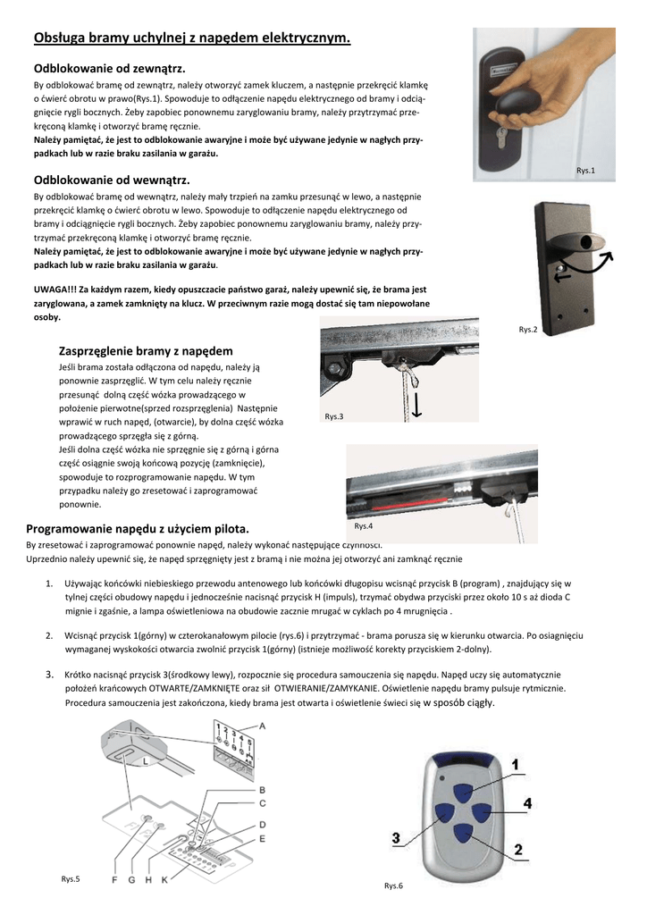 Obsługa bramy uchylnej z napędem elektrycznym. Odblokowanie od zewnątrz. By odblokować bramę od zewnątrz, należy otworzyć zamek kluczem, a następnie przekręcić klamkę o ćwierć obrotu w prawo(Rys.1). Spowoduje to odłączenie napędu elektrycznego od bramy i odcią‐ gnięcie rygli bocznych. Żeby zapobiec ponownemu zaryglowaniu bramy, należy przytrzymać prze‐ kręconą klamkę i otworzyć bramę ręcznie. Należy pamiętać, że jest to odblokowanie awaryjne i może być używane jedynie w nagłych przy‐ padkach lub w razie braku zasilania w garażu. Rys.1 Odblokowanie od wewnątrz. By odblokować bramę od wewnątrz, należy mały trzpień na zamku przesunąć w lewo, a następnie przekręcić klamkę o ćwierć obrotu w lewo. Spowoduje to odłączenie napędu elektrycznego od bramy i odciągnięcie rygli bocznych. Żeby zapobiec ponownemu zaryglowaniu bramy, należy przy‐ trzymać przekręconą klamkę i otworzyć bramę ręcznie. Należy pamiętać, że jest to odblokowanie awaryjne i może być używane jedynie w nagłych przy‐ padkach lub w razie braku zasilania w garażu. UWAGA!!! Za każdym razem, kiedy opuszczacie państwo garaż, należy upewnić się, że brama jest zaryglowana, a zamek zamknięty na klucz. W przeciwnym razie mogą dostać się tam niepowołane osoby. Rys.2 Zasprzęglenie bramy z napędem Jeśli brama została odłączona od napędu, należy ją ponownie zasprzęglić. W tym celu należy ręcznie przesunąć dolną część wózka prowadzącego w położenie pierwotne(sprzed rozsprzęglenia) Następnie wprawić w ruch napęd, (otwarcie), by dolna część wózka prowadzącego sprzęgła się z górną. Jeśli dolna część wózka nie sprzęgnie się z górną i górna część osiągnie swoją końcową pozycję (zamknięcie), spowoduje to rozprogramowanie napędu. W tym przypadku należy go zresetować i zaprogramować ponownie. Programowanie napędu z użyciem pilota. Rys.3 Rys.4 By zresetować i zaprogramować ponownie napęd, należy wykonać następujące czynności. Uprzednio należy upewnić się, że napęd sprzęgnięty jest z bramą i nie można jej otworzyć ani zamknąć ręcznie 1. Używając końcówki niebieskiego przewodu antenowego lub końcówki długopisu wcisnąć przycisk B (program) , znajdujący się w tylnej części obudowy napędu i jednocześnie nacisnąć przycisk H (impuls), trzymać obydwa przyciski przez około 10 s aż dioda C mignie i zgaśnie, a lampa oświetleniowa na obudowie zacznie mrugać w cyklach po 4 mrugnięcia . 2. Wcisnąć przycisk 1(górny) w czterokanałowym pilocie (rys.6) i przytrzymać ‐ brama porusza się w kierunku otwarcia. Po osiagnięciu wymaganej wyskokości otwarcia zwolnić przycisk 1(górny) (istnieje możliwość korekty przyciskiem 2‐dolny). 3. Krótko nacisnąć przycisk 3(środkowy lewy), rozpocznie się procedura samouczenia się napędu. Napęd uczy się automatycznie położeń krańcowych OTWARTE/ZAMKNIĘTE oraz sił OTWIERANIE/ZAMYKANIE. Oświetlenie napędu bramy pulsuje rytmicznie. Procedura samouczenia jest zakończona, kiedy brama jest otwarta i oświetlenie świeci się w sposób ciągły. Rys.5 Rys.6
