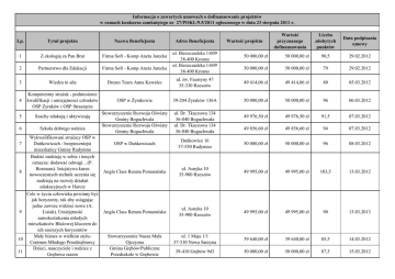 Informacja o zawartych umowach o dofinansowanie projektów w ramach konkursu zamkniętego nr 27/POKL/9.5/2011 ogłoszonego w dniu 23 sierpnia 2011 r. Lp. Tytuł projektu Nazwa Beneficjenta 1 Z ekologią za Pan Brat Firma Soft - Komp Aneta Jarecka 2 Partnerstwo dla Edukacji Firma Soft - Komp Aneta Jarecka 3 Wiedza to siła Dream Team Anna Kawalec 4 Kompetentny strażak - podniesienie kwalifikacji i umiejętnosci członków OSP Żyraków i OSP Straszęcin 5 Szachy edukują i aktywizują 6 Szkoła dobrego rodzica Wykwalifikowani strażacy OSP w Duńkowicach - bezpieczniejsi mieszkańcy Gminy Radymno Budzić nadzieję w sobie i innych oznacza: dodawać odwagi…(P. Bosmans). Inicjatywa kursu 8 nowoczesnych technik uczenia się nadzieją na rozwój działań edukacyjnych w Harcie Cele w życiu człowieka powinny być jak horyzonty, tak aby osiągając jedne zawsze widzieć nowe (A. 9 Lisiak). Umiejętność samokształcenia młodych mieszkańców Błażowej kluczem do ich szerszych horyzontów Mały biznes w wielkim stylu10 Centrum Młodego Przedsiębiorcy Dzieci, nauczyciele i rodzice z 11 Grębowa razem 7 Adres Beneficjenta ul. Bieszczadzka 1/609 38-400 Krosno ul. Bieszczadzka 1/609 38-400 Krosno Wartość projektu Wartość przyznanego dofinansowania Liczba zdobytych punktów Data podpisania umowy 50 000,00 zł 50 000,00 zł 90,5 29.02.2012 50 000,00 zł 50 000,00 zł 79 29.02.2012 ul. św. Faustyny 47 35-330 Rzeszów 49 414,06 zł 49 414,06 zł 80 05.03.2012 OSP w Żyrakowie 39-204 Żyraków 136A 50 000,00 zł 50 000,00 zł 96 06.03.2012 Stowarzyszenie Rozwoju Oświaty Gminy Boguchwala Stowarzyszenie Rozwoju Oświaty Gminy Boguchwala ul. Dr. Tkaczowa 134 36-040 Boguchwała ul. Dr. Tkaczowa 134 36-040 Boguchwała 49 976,50 zł 49 976,50 zł 91,5 07.03.2012 49 856,60 zł 49 856,60 zł 94 07.03.2012 OSP w Duńkowicach Duńkowice 16 37-550 Radymno 50 000,00 zł 50 000,00 zł 96 08.03.2012 Anglo Class Renata Pomarańska ul. Asnyka 10 35-900 Rzeszów 49 995,00 zł 49 995,00 zł 103,5 13.03.2012 Anglo Class Renata Pomarańska ul. Asnyka 10 35-900 Rzeszów 49 995,00 zł 49 995,00 zł 90 13.03.2013 Stowarzyszenie Nasza Mała Ojczyzna Gmina Grębów/Publiczne Przedszkole w Grębowie ul. 1 Maja 1/1 37-310 Nowa Sarzyna 39 640,00 zł 39 640,00 zł 85,5 14.03.2012 39-410 Grębów 943 50 000,00 zł 50 000,00 zł 87,5 15.03.2012 12 Razem na rzecz lepszej edukacji w Grębowie Gmina Grębów/Publiczne Przedszkole w Grębowie 39-410 Grębów 943 30 028,00 zł 30 028,00 zł 89 15.03.2012 13 Nowe umiejętności - nowe możliwości Lokalna Grupa Działania "Roztocze Tomaszowskie" ul. Lwowska 32/104 22-600 Tomaszów Lubelski 49 085,00 zł 49 085,00 zł 97 16.03.2012 14 Na dobry początek w edukacji 38-232 Krempna 85/3 47 153,00 zł 47 153,00 zł 91 16.03.2012 15 Lepsza jakość edukacji osób niepełnosprawnych” ul. Mickiewicza 38 37-420 Rudnik nad Sanem 47 240,00 zł 47 240,00 zł 93 19.03.2012 16 MAŁA AKADEMIA SENIORA. Aktywizacja edukacyjna osób w wieku 55-64 z terenu gminy Kolbuszowa Stowarzyszenie Na Rzecz Rozwoju Powaitu Kolbuszowskiego "NIL" ul. Jana Pawła II 8 36-100 Kolbuszowa 49 810,00 zł 49 810,00 zł 91,5 20.03.2012 17 Przedszkole z pasją Stowarzyszenie na Rzecz Wspierania Inicjatyw Lokalnych w Woli Rzeczyckiej Wola Rzeczycka 254 37-455 Radomyśl nad Sanem ul. Dworcowa 6a 39-215 Czarna 45 616,50 zł 45 616,50 zł 63,5 22.03.2012 48 800,00 zł 48 800,00 zł 104 23.03.2012 48 800,00 zł 48 800,00 zł 98,5 23.03.2012 49 507,80 zł 49 507,80 zł 66 28.03.2012 49 825,00 zł 49 825,00 zł 104 03.04.2012 50 000,00 zł 50 000,00 zł 95,5 03.04.2012 47 470,00 47 470,00 94,5 18.04.2012 1 102 212,46 zł 1 102 212,46 zł Kompetentny strażak - ochotnik szkolenia dla członków OSP Czarna Edukacja w OSP Pilzno dla 19 bezpieczeństwa mieszkańców Gminy Pilzno 18 20 Otwarty świat 21 Ratuj życie, żyj bezpiecznie Wyszkoleni strażacy – bezpieczna Gmina Jodłowa Palimy się do wiedzy - program wsparcia aktywności społecznej i edukacyjnej członków OSP z terenu gminy Nowy Żmigród 22 23 Gminny Ośrodek Kultury i Rekreacji w Krempnej Stowarzyszenie na rzecz osób niepełnosprawnych "Poprowadź Mnie przez Świat" OSP w Czarnej OSP w Pilźnie ul. Węgierska 30 39-220 Pilzno Komitet Miast Bliźniaczych Nowa Dęba – Fermoy - Ploemeur ul. Rzeszowska 3/215 39-460 Nowa Dęba OSP w Harcie Ochotniczą Strażą Pożarną w Jodłowej 36-067 Harta 144 Jodłowa 39-225 Jodłowa Gmina Nowy Żmigród ul. Mickiewicza 2 38-230 Nowy Żmigród Razem Projekt uzyskał dofinansowanie w ramach rezerwy finansowej przeznaczonej na procedurę odwoławczą.