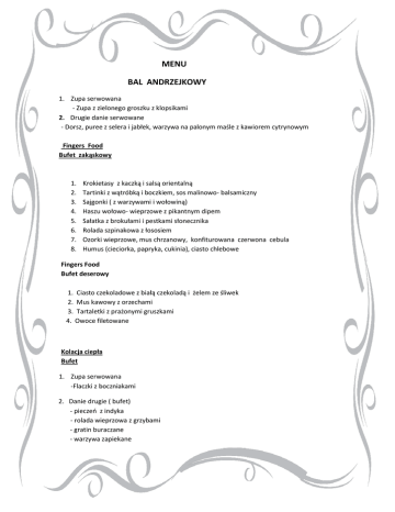 MENU BAL ANDRZEJKOWY 1. Zupa serwowana - Zupa z zielonego groszku z klopsikami 2. Drugie danie serwowane - Dorsz, puree z selera i jabłek, warzywa na palonym maśle z kawiorem cytrynowym Fingers Food Bufet zakąskowy 1. 2. 3. 4. 5. 6. 7. 8. Krokietasy z kaczką i salsą orientalną Tartinki z wątróbką i boczkiem, sos malinowo- balsamiczny Sajgonki ( z warzywami i wołowiną) Haszu wołowo- wieprzowe z pikantnym dipem Sałatka z brokułami i pestkami słonecznika Rolada szpinakowa z łososiem Ozorki wieprzowe, mus chrzanowy, konfiturowana czerwona cebula Humus (cieciorka, papryka, cukinia), ciasto chlebowe Fingers Food Bufet deserowy 1. Ciasto czekoladowe z białą czekoladą i żelem ze śliwek 2. Mus kawowy z orzechami 3. Tartaletki z prażonymi gruszkami 4. Owoce filetowane Kolacja ciepła Bufet 1. Zupa serwowana -Flaczki z boczniakami 2. Danie drugie ( bufet) - pieczeń z indyka - rolada wieprzowa z grzybami - gratin buraczane - warzywa zapiekane