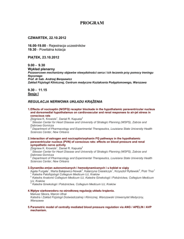 PROGRAM CZWARTEK, 22.10.2012 16.00-19.00 - Rejestracja uczestników 19.30 - Powitalna kolacja PIĄTEK, 23.10.2012 9.00 - 9.30 Wykład plenarny Pozasercowe mechanizmy objawów niewydolności serca i ich leczenie przy pomocy treningu fizycznego Prof. dr hab. Andrzej Beręsewicz Zakład Fizjologii Klinicznej, Centrum medyczne Kształcenia Podyplomowego, Warszawa 9.30 - 11.15 Sesja I REGULACJA NERWOWA UKŁADU KRĄŻENIA 1. Effects of nociceptin (N/OFQ) receptor blockade in the hypothalamic paraventricular nucleus and dorsomedial hypothalamus on cardiovascular and renal responses to air-jet stress in conscious rats Zbigniew K. Krowicki1, Daniel R. Kapusta2 1 Silesian Center for Heart Disease and University of Strategic Planning (WSPS), Zabrze and Dabrowa Gornicza 2 Department of Pharmacology and Experimental Therapeutics, Louisiana State University Health Sciences Center, New Orleans 2. Interaction of estrogen and nociceptin/orphanin FQ pathways in the hypothalamic paraventricular nucleus (PVN) of conscious rats: effects on blood pressure and renal sympathetic nerve activity Zbigniew K. Krowicki1, Daniel R. Kapusta2 1 Silesian Center for Heart Disease and University of Strategic Planning (WSPS), Zabrze and Dabrowa Gornicza 2 Department of Pharmacology and Experimental Therapeutics, Louisiana State University Health Sciences Center, New Orleans 3. Dynamika zmian autonomicznych i hemodynamicznych i u kobiet w ciąży Agata Furgała1, Marta Bałajewicz-Nowak2, Katarzyna Ciesielczyk1, Krzysztof Rytlewski3, Piotr Thor1 1 Katedra Patofizjologii Collegium Medicum UJ, Kraków 2 Katedra Anatomii Collegium Medicum UJ, Katedra Ginekologii i Położnictwa, Collegium Medicum UJ, Kraków 3 Katedra Ginekologii i Położnictwa, Collegium Medicum UJ, Kraków 4. Wpływ siarkowodoru na ośrodkową regulację układu krążenia. Mariusz Sikora, Marcin Ufnal Katedra i Zakład Fizjologii Doświadczalnej i Klinicznej, Warszawski Uniwersytet Medyczny, Warszawa 5. Parametric model of centrally mediated blood pressure regulation via ANG / APELIN / AVP mechanism. Ryszard Gomółka1, Antoni Grzanka1, Agnieszka Cudnoch-Jędrzejewska2 1 Wydział Elektroniki i Technik Informacyjnych Politechniki Warszawskiej, Warszawa 2 Katedra i Zakład Fizjologii Doświadczalnej i Klinicznej WUM, Warszawa 6. Wpływ diety wysokotłuszczowej na ośrodkową regulację ciśnienia tętniczego u szczurów zdrowych i szczurów z pozawałową niewydolnością serca Katarzyna Czarzasta, Agnieszka Cudnoch-Jędrzejewska, Ryszard Gomółka, Liana Puchalska, Ewa Szczepańska-Sadowska Katedra i Zakład Fizjologii Doświadczalnej i Klinicznej Warszawski Uniwersytet Medyczny, Warszawa 7. Aktywacja recepcji trzewnej /próba wodna/ i zmiany aktywności autonomicznej mioelektrycznej żołądka Agata Furgała, Joanna Szmigiel, Katarzyna Ciesielczyk, Jolanta Stachura, Piotr Thor Katedra Patofizjologii Collegium Medicum UJ, Kraków 11.15 – 11-30: Przerwa 11.30 – 13.30 Sesja II ARYTMIE 1. A comparative study of anti-arrhythmic and hemodynamic effects of dihydropyridines and oxidized dihydropyridines in the model of ischemia- and reperfusion- induced arrhythmias in rats Tadeusz F. Krzemiński1, Maurycy Porc1, Katarzyna A. Mitręga2 1 Katedra i Zakład Farmakologii w Zabrzu Śląskiego Uniwersytetu Medycznego w Katowicach, Zabrze 2 Katedra i Zakład Farmakologii w Zabrzu Śląskiego Uniwersytetu Medycznego w KatowicachKatedra i Zakład Farmakologii w Zabrzu Śląskiego Uniwersytetu Medycznego w Katowicach, Zabrze 2. A comparative study of the effects of furnidipines metabolites (M-2, M-3, M-8) in the model of ischemia- and reperfusion- induced arrhythmias and with M-2 chronic oral treatment after myocardial infarction in rats Katarzyna A. Mitręga, Maurycy Porc, Tadeusz F. Krzemiński Katedra i Zakład Farmakologii w Zabrzu Śląskiego Uniwersytetu Medycznego w Katowicach, Zabrze 3. Wpływ kwasów wielonienasyconych kwasów tłuszczowych omega-3 na zaburzenia rytmu serca w modelu świeżego zawału serca u szczura Mariusz Marciszek, Urszula Mackiewicz, Michał Mączewski, Monika Duda Centrum Medyczne Kształcenia Podyplomowego, Warszawa 4. Analiza wpływu nienasyconych kwasów tłuszczowych pochodzących z nowej generacji jaj na czas refrakcji oraz repolaryzacji komory u świń z doświadczalną tachykardiomiopatią. Agnieszka Noszczyk-Nowak1, Urszula Pasławska1, Józef Nicpoń1, Adrian Janiszewski2, Piotr Skrzypczak3 1 Uniwersytet Przyrodniczy we Wrocławiu, Katedra Chorób Wewnętrznych z Klinika Koni, Psów i Kotów, Wrocław 2 Wojewódzki Szpital Specjalistyczny , Wrocław 3 Uniwersytet Przyrodniczy we Wrocławiu, Katedra i Klinika Chirurgii, Wrocław 5. Influence on arrhythmias and possible cardioprotective action of molsidomine and its biologically active derivatives: SIN-1 and SIN-1A in two rats models of experimental cardiology Michał Żorniak, Katarzyna Mitręga, Maurycy Porc, Tadeusz F. Krzemiński Katedra i Zakład Farmakologii w Zabrzu, Śląski Uniwersytet Medyczny w Katowicach, Zabrze 6. MMP-9 in atrial remodeling in patients with atrial fibrillation Janina Lewkowicz, Małgorzata Knapp, Elżbieta Skibińska, Ewa Waszkiewicz, Włodzimierz J. Musiał Klinka Kardiologii Uniwersytecki Szpital Kliniczny, Białystok 7. Asymetria rytmu serca w czasie wolnego oddychania z równo trwającą fazą wdechu i wydechu Przemysław GUZIK1, Tomasz KRAUZE1, Jarosław PISKORSKI2 1 Uniwersytet Medyczny im. K. Marcinkowskiego, Poznań 2 Uniwersytet Zielonogórski, Zielona Góra 8. Asymetria rytmu serca w wybranych grupach medycznych Olga Lipińska, Monika Petelczyc Wydział FIzyki Politechnika Warszawska, Warszawa 13.30 – 14.30: Przerwa obiadowa 14.30 – 16.15 Sesja III NACZYNIA, STENTY 1. Biological response to different doses of sirolimus eluted from the surface of biodegradable polymer coated stents in porcine model of neointimal hyperplasia Paweł Gąsior1, Piotr Desperak1, Krzysztof Milewski2, Piotr Buszman2, Stefan Samborski2, Michał Jelonek2, Agata Kra