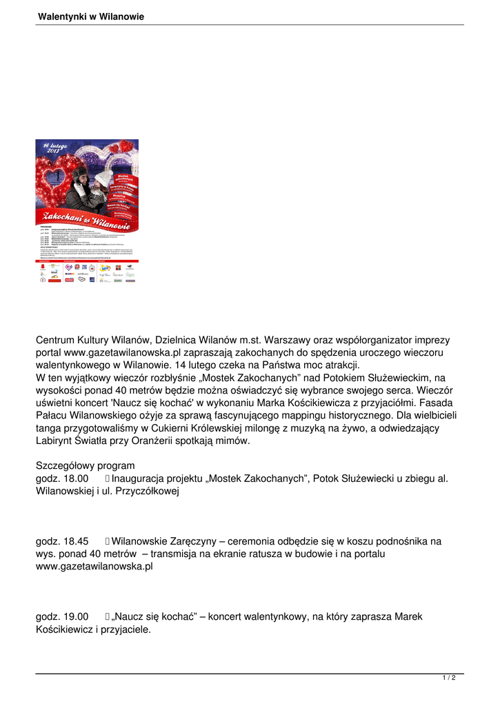 Walentynki w Wilanowie Centrum Kultury Wilanów, Dzielnica Wilanów m.st. Warszawy oraz współorganizator imprezy portal www.gazetawilanowska.pl zapraszają zakochanych do spędzenia uroczego wieczoru walentynkowego w Wilanowie. 14 lutego czeka na Państwa moc atrakcji. W ten wyjątkowy wieczór rozbłyśnie „Mostek Zakochanych” nad Potokiem Służewieckim, na wysokości ponad 40 metrów będzie można oświadczyć się wybrance swojego serca. Wieczór uświetni koncert 'Naucz się kochać' w wykonaniu Marka Kościkiewicza z przyjaciółmi. Fasada Pałacu Wilanowskiego ożyje za sprawą fascynującego mappingu historycznego. Dla wielbicieli tanga przygotowaliśmy w Cukierni Królewskiej milongę z muzyką na żywo, a odwiedzający Labirynt Światła przy Oranżerii spotkają mimów. Szczegółowy program godz. 18.00 Inauguracja projektu „Mostek Zakochanych”, Potok Służewiecki u zbiegu al. Wilanowskiej i ul. Przyczółkowej godz. 18.45 Wilanowskie Zaręczyny – ceremonia odbędzie się w koszu podnośnika na wys. ponad 40 metrów – transmisja na ekranie ratusza w budowie i na portalu www.gazetawilanowska.pl godz. 19.00 „Naucz się kochać” – koncert walentynkowy, na który zaprasza Marek Kościkiewicz i przyjaciele. 1/2 Walentynki w Wilanowie godz. 19.45 Wilanowskie Zaręczyny – ciąg dalszy. godz. 20.00 „Serdeczny” pokaz sztucznych ogni. godz. 20:00 Milonga przy muzyce na żywo w Cukierni Królewskiej godz. 20.30 Mapping na fasadzie Pałacu w Wilanowie oraz “zaloty” w Labiryncie Światła przy Oranżerii Pałacowej. Ponadto przejażdżki bryczkami po królewskim Wilanowie, życzenia walentynkowe na budynku Ratusza przy ul. Klimczaka, pływalnia i jacuzzi dla zakochanych par – 10 zł, Zakochani w książkach – konkurs fotograficzny przygotowany przez Bibliotekę Publiczną, konkurs na najpiękniejszy List Miłosny – przygotowany przez gazetę wilanowską.pl. Zapraszamy również na strony internetowe: gazetawilanowska.pl , bibliotekawilanowska.pl , wilanow.pl 2/2