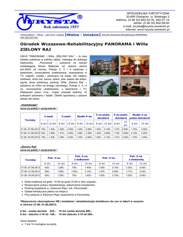 SPÓŁDZIELNIA TURYSTYCZNA 32-600 Oświęcim, ul. Solskiego 2 telefony: (0 48 33) 842-43-76, 842-27-19 tel/fax: (0 48 33) 842-59-94 e-mail: [email protected] Internet: www.turysta.oswiecim.pl Strona główna Oferta Lato 2012 - krajowe Mielno - Unieście Ośrodek Wczasowo-Rehabilitacyjny PANORAMA i Willa ZIELONY RAJ Ośrodek Wczasowo-Rehabilitacyjny PANORAMA i Willa ZIELONY RAJ OW-R ”PANORAMA” i Willa „ZIELONY RAJ” – to dwa obiekty położone w pobliżu siebie, należące do jednego właściciela. „Panorama” – położona na mierzei oddzielającej Morze Bałtyckie od Jeziora Jamno (ok.200m od morza). Pokoje 2, 3 i 4 osobowe z łazienkami, nowocześnie umeblowane, wyposażone w TV, czajniki. Leżaki i parawany na plażę. Na miejscu stołówka, drink bar, sauna, bilard, plac zabaw dla dzieci, ogród, taras widokowy, parking. Willa „Zielony Raj” – położona ok.100m od brzegu morskiego. Pokoje 2, 3 i 4 os. nowocześnie umeblowane, z łazienkami i TV. Większość pokoi 2-os.. Część posiada balkony. W pokojach parawany i leżaki. Obiekt ogrodzony z placem zabaw dla dzieci. „PANORAMA” cena za pokój + wyżywienie * 2-osob 3-osob. Studio 4-os. 2-os podw. 3-os podw. Studio 4-os standard standard podw.standard Terminy 8 dni 15 dni 8 dni 15 dni 8 dni 15 dni 8 dni 15 dni 8 dni 15 dni 8 dni 31.05.-27.06.2012 700.- 1.400.- 1.260.- 2.520.- 1.400.- 2.800.- 1.050.- 2.100.- 1.470.- 2.940.- 1.750.- 15 dni 3.500.- 27.06.-31.08.2012 840.- 1.680.- 1.470.- 2.940.- 1.680.- 3.360.- 1.400.- 2.800.- 1.750.- 3.500- 2.100.- 4.200.- 31.08.-30.09.2012 700.- 1.400.- 1.260.- 2.520.- 1.400.- 2.800.- 1.050.- 2.100.- 1.470.- 2.940- 1.750.- 3.500.- „Zielony Raj” cena za pokój + wyżywienie * Terminy 31.05.-27.06.2012 Pok. 2-os. Pok. 2-os. z balkonem Pok. 3-os. Pok. 3-os. z dostawką 8 dni 15 dni 8 dni 15 dni 8 dni 15 dni 8 dni 15 dni 630.- 1.260.- 700.- 1.400.- 1.050.- 2.100.- 1.225.- 2.450.- 27.06.-31.08.2012 980.- 1.960.- 1.050.- 2.100.- 1.470.- 2.940.- 1.715.- 3.430.- 31.08.-30.09.2012 630.- 1.260.- 700.- 1.400.- 1.050.- 2.100.- 1.225.- 2.450.- Doba hotelowa od godz. 14.00 do godz.10.00 w dniu wyjazdu. Rozpoczęcie pobytu obiadokolacją, zakończenie śniadaniem. Parking bezpłatnie w „Zielonym Raju” lub „Panoramie”. Opłata klimatyczna płatna na miejscu. Przy pobycie w Zielonym Raju wyżywienie w Panoramie. *Wyżywienie obowiązkowe HB ( śniadanie i obiadokolacja) dodatkowo do cen w tabeli w sezonie: w okresie 27.06.-31.08.20012. 8 dni - osoba dorosła 245,8 dni - dziecko 3-10 lat 140,Cena zawiera: 7 lub 14 noclegów za pokój 15 dni osoba dorosła 490.15 dni dziecko 3-10 lat 280.-