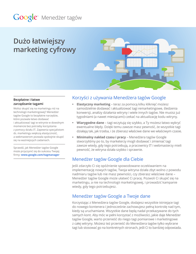 Menedżer tagów Dużo łatwiejszy Dużo łatwiejszy marketing cyfrowy marketing cyfrowy Bezpłatne i łatwe zarządzanie tagami Wolisz skupić się na marketingu niż na technologii marketingowej? Menedżer tagów Google to bezpłatne narzędzie, które pozwala łatwo dodawać i aktualizować tagi w witrynie w dowolnym momencie bez potrzeby korzystania z pomocy działu IT. Zapewnia specjalistom ds. marketingu większą elastyczność, a webmasterom pozwala spokojnie skupić się na ważniejszych zadaniach. Sprawdź, jak Menedżer tagów Google może przyczynić się do sukcesu Twojej firmy: www.google.com/tagmanager Korzyści z używania Menedżera tagów Google • E lastyczny marketing – teraz za pomocą kilku kliknięć możesz samodzielnie dodawać i aktualizować tagi remarketingowe, śledzenia konwersji, analizy działania witryny i wiele innych tagów. Nie musisz już tygodniami (a nawet miesiącami) czekać na aktualizację kodu witryny. • W iarygodne dane – tagi wczytują się szybko, a Ty możesz łatwo wykryć ewentualne błędy. Dzięki temu zawsze masz pewność, że wszystkie tagi działają tak, jak trzeba, i że zbierasz właściwe dane we właściwym czasie. • M inimalny nakład czasu i pracy – Menedżera tagów Google stworzyliśmy po to, by marketerzy mogli dodawać i zmieniać tagi zawsze wtedy, gdy tego potrzebują, a pracownicy IT i webmasterzy mieli pewność, że witryna działa szybko i sprawnie. Menedżer tagów Google dla Ciebie Jeśli zdarzyło Ci się opóźnienie spowodowane oczekiwaniem na implementację nowych tagów, Twoja witryna działa zbyt wolno z powodu nadmiaru tagów lub nie masz pewności, czy zbierasz właściwe dane – Menedżer tagów Google może ułatwić Ci pracę. Pozwoli Ci skupić się na marketingu, a nie na technologii marketingowej, i prowadzić kampanie wtedy, gdy tego potrzebujesz. Menedżer tagów Google a Twoje dane Korzystając z Menedżera tagów Google, dodajesz wszystkie istniejące tagi do nowego kontenera i jednocześnie zachowujesz pełną kontrolę nad tym, kiedy są uruchamiane. Wszystkie dane będą nadal przekazywane do tych samych kont. Aby móc w pełni korzystać z możliwości, jakie daje Menedżer tagów Google, warto przenieść do niego tagi pomiarowe i marketingowe z całej witryny. Możesz też przenieść do Menedżera tagów tylko wybrane tagi lub stosować go na konkretnych stronach, jeśli Ci to bardziej odpowiada. Zacznij już dziś: www.google.com/tagmanager Pierwsze kroki w Menedżerze tagów Google Rozpoczęcie korzystania z tego narzędzia jest dla większości użytkowników szybkie i proste – wystarczy utworzyć konto, dodać do witryny jeden fragment kodu i zacząć zarządzać tagami. Konfiguracja konta zajmuje tylko kilka minut. W zależności od rozmiaru witryny i liczby tagów przeniesienie istniejących tagów do Menedżera tagów Google może trwać krócej niż godzinę, chociaż może też wymagać więcej czasu. Dlaczego warto korzystać z Menedżera tagów Google? Gdy korzystasz z Menedżera tagów Google, zostaje Ci więcej czasu i pieniędzy na kampanie marketingowe. Nie musisz już prosić pracowników działu IT o napisanie lub zmianę kodu witryny – możesz samodzielnie zarządzać tagami w całej witrynie w naszym wygodnym interfejsie. atwe testowanie – Menedżer tagów Google pozwala Ł łatwo sprawdzić, czy nowe tagi działają prawidłowo, zanim opublikujesz zmiany. Specjaliści ds. marketingu mogą weryfikować tagi samodzielnie, a webmasterzy są mniej obciążeni pracą. ezproblemowe współdziałanie z innymi rozwiązaniami – B Menedżer tagów Google obsługuje tagi pomiarowe i marketingowe Google oraz tagi innych firm, w tym wiele tagów z wbudowanymi szablonami. ygoda dla działu IT – informatykom i webmasterom W przypadnie do gustu wiele funkcji Menedżera tagów Google, które zapewniają prawidłowe działanie tagów oraz witryny. ziałanie oparte na regułach – Menedżer tagów Google D pozwala tworzyć własne reguły i makra, dzięki czemu Twoje tagi zbierają właściwe informacje we właściwym czasie. iększe możliwości dla agencji – obsługa wielu kont W i funkcji uprawnień użytkowników w Menedżerze tagów Google pozwala agencjom łatwiej zarządzać tagami klientów. nóstwo użytecznych funkcji – Menedżera tagów M Google wyposażyliśmy w wiele skutecznych narzędzi, np. asynchroniczne wczytywanie tagów i konsolę debugowania, które znacznie upraszczają zarządzanie tagami w witrynie. © 2012 Google Inc. Wszelkie prawa zastrzeżone. Google i logo Google są znakami towarowymi firmy Google Inc. Wszystkie inne nazwy firm i produktów mogą być znakami towarowymi ich właścicieli.