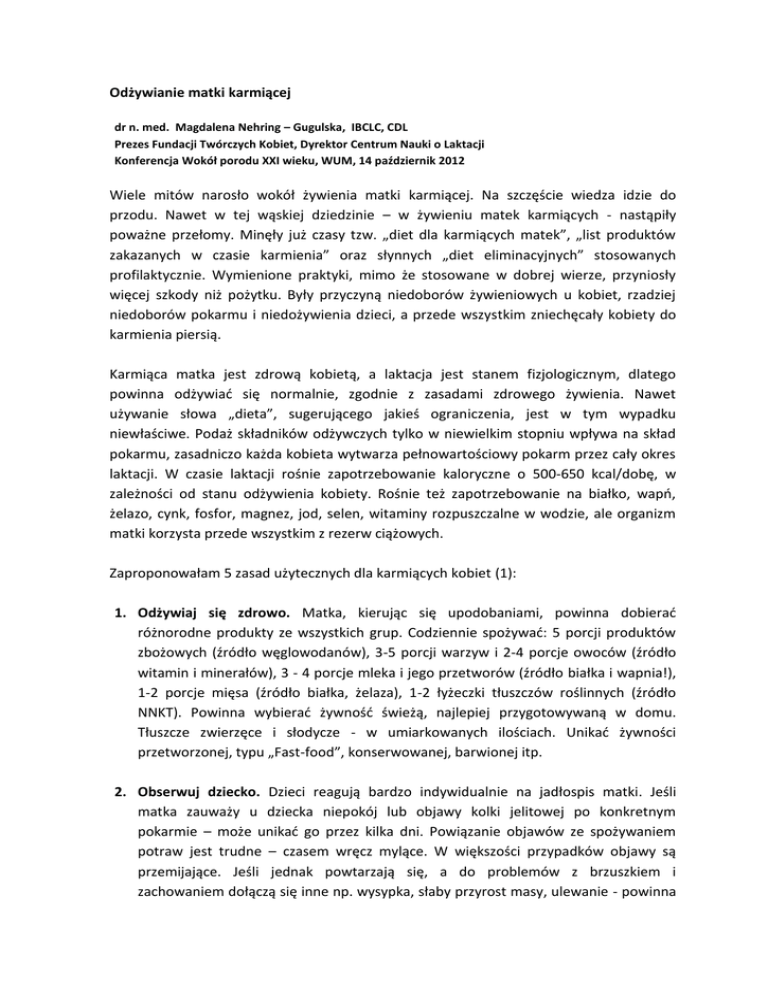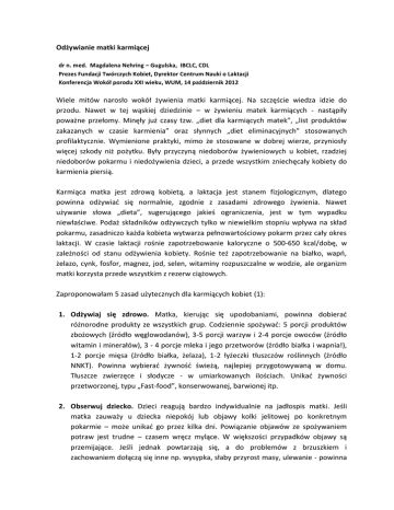 Odżywianie matki karmiącej dr n. med. Magdalena Nehring – Gugulska, IBCLC, CDL Prezes Fundacji Twórczych Kobiet, Dyrektor Centrum Nauki o Laktacji Konferencja Wokół porodu XXI wieku, WUM, 14 październik 2012 Wiele mitów narosło wokół żywienia matki karmiącej. Na szczęście wiedza idzie do przodu. Nawet w tej wąskiej dziedzinie – w żywieniu matek karmiących - nastąpiły poważne przełomy. Minęły już czasy tzw. „diet dla karmiących matek”, „list produktów zakazanych w czasie karmienia” oraz słynnych „diet eliminacyjnych” stosowanych profilaktycznie. Wymienione praktyki, mimo że stosowane w dobrej wierze, przyniosły więcej szkody niż pożytku. Były przyczyną niedoborów żywieniowych u kobiet, rzadziej niedoborów pokarmu i niedożywienia dzieci, a przede wszystkim zniechęcały kobiety do karmienia piersią. Karmiąca matka jest zdrową kobietą, a laktacja jest stanem fizjologicznym, dlatego powinna odżywiać się normalnie, zgodnie z zasadami zdrowego żywienia. Nawet używanie słowa „dieta”, sugerującego jakieś ograniczenia, jest w tym wypadku niewłaściwe. Podaż składników odżywczych tylko w niewielkim stopniu wpływa na skład pokarmu, zasadniczo każda kobieta wytwarza pełnowartościowy pokarm przez cały okres laktacji. W czasie laktacji rośnie zapotrzebowanie kaloryczne o 500-650 kcal/dobę, w zależności od stanu odżywienia kobiety. Rośnie też zapotrzebowanie na białko, wapń, żelazo, cynk, fosfor, magnez, jod, selen, witaminy rozpuszczalne w wodzie, ale organizm matki korzysta przede wszystkim z rezerw ciążowych. Zaproponowałam 5 zasad użytecznych dla karmiących kobiet (1): 1. Odżywiaj się zdrowo. Matka, kierując się upodobaniami, powinna dobierać różnorodne produkty ze wszystkich grup. Codziennie spożywać: 5 porcji produktów zbożowych (źródło węglowodanów), 3-5 porcji warzyw i 2-4 porcje owoców (źródło witamin i minerałów), 3 - 4 porcje mleka i jego przetworów (źródło białka i wapnia!), 1-2 porcje mięsa (źródło białka, żelaza), 1-2 łyżeczki tłuszczów roślinnych (źródło NNKT). Powinna wybierać żywność świeżą, najlepiej przygotowywaną w domu. Tłuszcze zwierzęce i słodycze - w umiarkowanych ilościach. Unikać żywności przetworzonej, typu „Fast-food”, konserwowanej, barwionej itp. 2. Obserwuj dziecko. Dzieci reagują bardzo indywidualnie na jadłospis matki. Jeśli matka zauważy u dziecka niepokój lub objawy kolki jelitowej po konkretnym pokarmie – może unikać go przez kilka dni. Powiązanie objawów ze spożywaniem potraw jest trudne – czasem wręcz mylące. W większości przypadków objawy są przemijające. Jeśli jednak powtarzają się, a do problemów z brzuszkiem i zachowaniem dołączą się inne np. wysypka, słaby przyrost masy, ulewanie - powinna skonsultować dziecko z pediatrą lub alergologiem (2). W żadnym wypadku nie wolno stosować „diet eliminacyjnych” na własną rękę. Stosowanie ich profilaktycznie w świetle aktualnych doniesień nie ma uzasadnienia (3,4). 3. Nie przejadaj się. Zwiększone zapotrzebowanie kaloryczne zaspokaja jeden dodatkowy posiłek lub dwie przekąski. Matki dobrze odżywione często go nie potrzebują. Karmienie sprzyja utracie zbędnych kilogramów zgromadzonych w okresie ciąży, ale nie można liczyć na ten efekt przejadając się słodyczami czy potrawami z dużą zawartością zwierzęcego tłuszczu. 4. Pamiętaj o napojach. Karmiąca matka musi pamiętać o uzupełnianiu płynów, zgodnie z pragnieniem (bywa 2-3 litry!). Nadmiar jest zbędny, ograniczanie podaży płynów w celach rzekomo leczniczych np. przy obrzęku piersi, jest nie tylko nieskuteczne, ale szkodliwe. 5. Unikaj używek (mocna herbata, mocna kawa, alkohol, nikotyna). Wszystkie przechodzą do pokarmu i wpływają na dziecko, a w dużych ilościach wyraźnie szkodzą. Kofeina zawarta np. w kawie, coca-coli, herbacie, niektórych lekach może powodować niepokój, pobudzenie, kolkę, bezsenność dziecka, a także bóle piersi u matki. Spożycie do 300 mg kofeiny/dobę nie powinno skutkować objawami. Nikotyna jest trucizną, która może docierać do dziecka zarówno przez mleko matki-palaczki, a także przez wdychanie dymu. U matki poza silnym uzależnieniem (silniejszym niż znane narkotyki) zwiększa zachorowalność na 25 poważnych, grożących życiu chorób, a także osłabia laktację. Jeśli matka pali do 5 papierosów dziennie, nie przy dziecku, tylko po karmieniu – może karmić. Utarło się, że alkohol poprawia laktację. Alkohol obniża poziom oksytocyny, hamuje odruch wypływu mleka, usypia dziecko i w ten sposób zaburza laktację. Jeśli karmiąca okazjonalnie wypije po karmieniu jeden kieliszek wina (max. 10g etanolu), nie zaszkodzi dziecku. Kobiety ciężarne i karmiące spożywające regularnie alkohol narażają swoje dzieci na poważne zaburzenia wzrostu i rozwoju. Jedzenie jest przyjemnością. Nadmiar reguł tę przyjemność zmniejsza. Karmienie dziecka piersią jest wyjątkowym, pozytywnym przeżyciem dla matki. A w praktyce spotykam matki umęczone dietami zalecanymi im przez pracowników ochrony zdrowia oraz inne osoby, często „mędrców” ze stron internetowych. Te kobiety to dzielne Matki Polki, które dla swoich pociech jedzą 3 produkty przez pół roku, wykluczają nabiał i rzekomo szkodliwe warzywa i owoce (np. pestkowe!). Pediatrzy i owi „mędrcy” dziwią się potem, że nasze karmiące matki, wbrew światowym badaniom, są w grupie ryzyka osteoporozy. Dziwią się, że one krótko karmią. Jakie jest ich zdziwienie, gdy dziecko ma słaby przyrost masy, choć matka robi co może i często karmi piersią. Gdy uświadamiam takiej mamie, że to niepotrzebne i kompletnie niezgodne z obecną wiedzą, patrzy na mnie z niedowierzaniem. Zalecenie normalnego odżywiania traktuje jak szkodzenie jej dziecku. Wiele wysiłku muszę włożyć, aby ją przekonać, że jedząc normalnie uratuje 