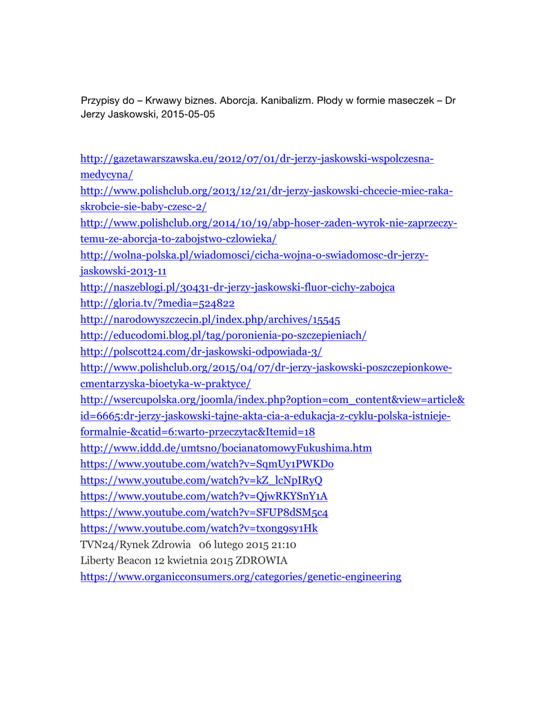 Przypisy do – Krwawy biznes. Aborcja. Kanibalizm. Płody w formie maseczek – Dr Jerzy Jaskowski, 2015-05-05 http://gazetawarszawska.eu/2012/07/01/dr-jerzy-jaskowski-wspolczesnamedycyna/ http://www.polishclub.org/2013/12/21/dr-jerzy-jaskowski-chcecie-miec-rakaskrobcie-sie-baby-czesc-2/ http://www.polishclub.org/2014/10/19/abp-hoser-zaden-wyrok-nie-zaprzeczytemu-ze-aborcja-to-zabojstwo-czlowieka/ http://wolna-polska.pl/wiadomosci/cicha-wojna-o-swiadomosc-dr-jerzyjaskowski-2013-11 http://naszeblogi.pl/30431-dr-jerzy-jaskowski-fluor-cichy-zabojca http://gloria.tv/?media=524822 http://narodowyszczecin.pl/index.php/archives/15545 http://educodomi.blog.pl/tag/poronienia-po-szczepieniach/ http://polscott24.com/dr-jaskowski-odpowiada-3/ http://www.polishclub.org/2015/04/07/dr-jerzy-jaskowski-poszczepionkowecmentarzyska-bioetyka-w-praktyce/ http://wsercupolska.org/joomla/index.php?option=com_content&view=article& id=6665:dr-jerzy-jaskowski-tajne-akta-cia-a-edukacja-z-cyklu-polska-istniejeformalnie-&catid=6:warto-przeczytac&Itemid=18 http://www.iddd.de/umtsno/bocianatomowyFukushima.htm https://www.youtube.com/watch?v=SqmUy1PWKDo https://www.youtube.com/watch?v=kZ_lcNpIRyQ https://www.youtube.com/watch?v=QjwRKYSnY1A https://www.youtube.com/watch?v=SFUP8dSM5c4 https://www.youtube.com/watch?v=txong9sy1Hk TVN24/Rynek Zdrowia 06 lutego 2015 21:10 Liberty Beacon 12 kwietnia 2015 ZDROWIA https://www.organicconsumers.org/categories/genetic-engineering