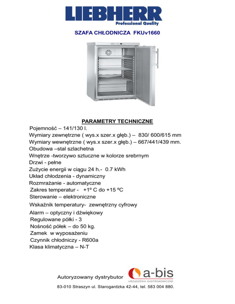 SZAFA CHŁODNICZA FKUv1660 PARAMETRY TECHNICZNE