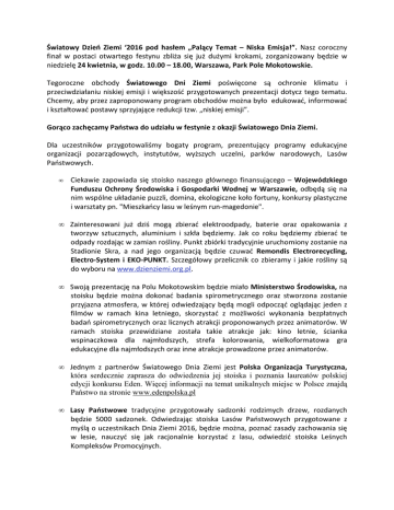 Światowy Dzień Ziemi ‘2016 pod hasłem „Palący Temat – Niska Emisja!”. Nasz coroczny finał w postaci otwartego festynu zbliża się już dużymi krokami, zorganizowany będzie w niedzielę 24 kwietnia, w godz. 10.00 – 18.00, Warszawa, Park Pole Mokotowskie. Tegoroczne obchody Światowego Dni Ziemi poświęcone są ochronie klimatu i przeciwdziałaniu niskiej emisji i większość przygotowanych prezentacji dotycz tego tematu. Chcemy, aby przez zaproponowany program obchodów można było edukować, informować i kształtować postawy sprzyjające redukcji tzw. „niskiej emisji”. Gorąco zachęcamy Państwa do udziału w festynie z okazji Światowego Dnia Ziemi. Dla uczestników przygotowaliśmy bogaty program, prezentujący programy edukacyjne organizacji pozarządowych, instytutów, wyższych uczelni, parków narodowych, Lasów Państwowych. • Ciekawie zapowiada się stoisko naszego głównego finansującego – Wojewódzkiego Funduszu Ochrony Środowiska i Gospodarki Wodnej w Warszawie, odbędą się na nim wspólne układanie puzzli, domina, ekologiczne koło fortuny, konkursy plastyczne i warsztaty pn. "Mieszkańcy lasu w leśnym run-magedonie". • Zainteresowani już dziś mogą zbierać elektroodpady, baterie oraz opakowania z tworzyw sztucznych, aluminium i szkła będziemy. Jak co roku będziemy zbierać te odpady rozdając w zamian rośliny. Punkt zbiórki tradycyjnie uruchomiony zostanie na Stadionie Skra, a nad jego organizacją będzie czuwać Remondis Electrorecycling, Electro-System i EKO-PUNKT. Szczegółowy przelicznik co zbieramy i jakie rośliny są do wyboru na www.dzienziemi.org.pl. • Swoją prezentację na Polu Mokotowskim będzie miało Ministerstwo Środowiska, na stoisku będzie można dokonać badania spirometrycznego oraz stworzona zostanie przyjazna atmosfera, w której odwiedzający będą mogli odpocząć oglądając jeden z filmów w ramach kina letniego, skorzystać z możliwości wykonania bezpłatnych badań spirometrycznych oraz licznych atrakcji proponowanych przez animatorów. W ramach stoiska przewidziane została takie atrakcje jak: kino letnie, ścianka wspinaczkowa dla najmłodszych, strefa kolorowania, wielkoformatowa gra edukacyjne dla najmłodszych oraz inne atrakcje prowadzone przez animatorów. • Jednym z partnerów Światowego Dnia Ziemi jest Polska Organizacja Turystyczna, która serdecznie zaprasza do odwiedzenia jej stoiska i poznania laureatów polskiej edycji konkursu Eden. Więcej informacji na temat unikalnych miejsc w Polsce znajdą Państwo na stronie www.edenpolska.pl • Lasy Państwowe tradycyjne przygotowały sadzonki rodzimych drzew, rozdanych będzie 5000 sadzonek. Odwiedzając stoiska Lasów Państwowych przygotowane z myślą o uczestnikach Dnia Ziemi 2016, będzie można, poznać zasady zachowania się w lesie, nauczyć się jak racjonalnie korzystać z lasu, odwiedzić stoiska Leśnych Kompleksów Promocyjnych. • Prezentacja Polskich Parków Narodowych przygotowana przez Związek Pracodawców Polskich Parków Narodowych, wspólne stoisko prezentujące ofertę przyrodniczą, edukacyjną i turystyczną 23 parków narodowych oraz ich rolę w ochronie powietrza i klimatu. • Na stoisku Tramwajów Warszawskich będzie można dokonać pomiaru hałasu i wziąć udział w wielu konkursach, a na wspólnym stoisku Urzędu m. st. Warszawy, Lasów Miejskich Warszawy i Straży Miejskiej pokazywane będą min. badania miasta dotyczące poprawy powietrza oraz zademonstrowany samochód Ekopatrolu Straży Miejskiej do prowadzenia kontroli powietrza. W realizacji festynu wspomaga nas MPO w m. st. Warszawie Sp. z o.o., a wsparcia promocyjnego udzieliły Tramwaje Warszawskie i Koleje Mazowieckie. Już dziś serdecznie zapraszamy i prosimy – promujcie Państwo ideę Światowego Dnia Ziemi. Grażyna Hodun Koordynator ogólnopolskich obchodów Światowego Dnia Ziemi ___________________________________________________________________________ Fundacja Ośrodka Edukacji Ekologicznej ul. Raszyńska 32/44, lok. 140 02-026 Warszawa tel. 22 668 92 68, fax: 22 883 50 96 www.dzienziemi.org.pl; [email protected] Patronat honorowy: Minister Środowiska, Wojewoda Mazowiecki, Marszałek Województwa Mazowieckiego, Prezydent m. st. Warszawy, Prezes Zarządu Narodowego Funduszu Ochrony Środowiska i Gospodarki Wodnej, Prezes Zarządu Wojewódzkiego Funduszu Ochrony Środowiska i Gospodarki Wodnej w Warszawie, Dyrektor Generalny Lasów Państwowych Finansujący: Wojewódzki Fundusz Ochrony Środowiska i Gospodarki Wodnej w Warszawie Współpraca: Lasy Państwowe, Polska Izba Produktu Regionalnego i Lokalnego, Miejskie Przedsiębiorstwo Oczyszczania w m. st. Warszawie Sp. z o. o., Tramwaje Warszawskie sp. z o.o., „Koleje Mazowieckie – KM” sp. z o.o., Związek Pracodawców Polskich Parków Narodowych, Kampinoski Park Narodowy Partnerzy projektu: Ministerstwo Środowiska, Polska Organizacja Turystyczna Sponsorzy projektu: Remondis Electrorecycling, Electro System Organizacja Odzysku Sprzętu Elektrycznego i Elektronicznego S.A., Eko – Punkt Organizacja Odzysku Opakowań S.A. Patronat medialny: Polskie Radio RDC, TVP 3 Warszawa, Metrocafe, Nasze Miasto, Portal www.zielonalekcja.pl, Portal Ulica Ekologiczna i Życie Rzeczy