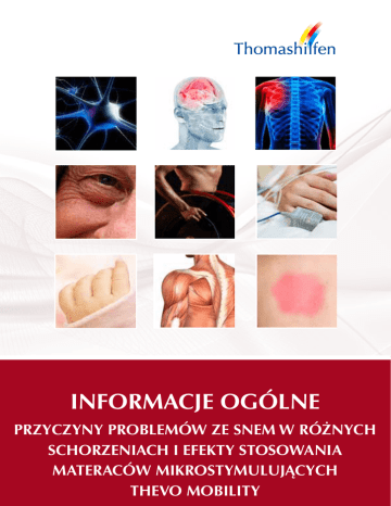 INFORMACJE OGÓLNE PRZYCZYNY PROBLEMÓW ZE SNEM W RÓŻNYCH SCHORZENIACH I EFEKTY STOSOWANIA MATERACÓW MIKROSTYMULUJĄCYCH THEVO MOBILITY Table of Contents Page Fact Sheet Dementia - ThevoVital................................................................................................................ 04 Fact Sheet Parkinson’s Disease - ThevoClam................................................................................................ 05 Fact Sheet Cancer - ThevoRelief.................................................................................................................. 06 Fact Sheet Arthrosis - ThevoCare................................................................................................................. 07 Fact Sheet Osteoporosis - ThevoRelief......................................................................................................... 08 Decubitus or Pressure Ulcer - ThevoautoActiv............................................................................................ 09 Decubitus or Pressure Ulcer - ThevoActiv................................................................................................... 10 Fact Sheet Plegia - ThevoFlex...................................................................................................................... 11 Fact Sheet Autism - ThevoSleepingStar........................................................................................................ 12 Fact Sheet ADAD - ThevoSleepingStar......................................................................................................... 13 (3) SPIS TREŚCI STRONA Demencja - ThevoVital............................................................................................................................... 04 Choroba Parkinsona - ThevoCalm............................................................................................................. 05 Rak - ThevoRelief........................................................................................................................................ 06 Artroza - ThevoRelief................................................................................................................................... 07 Osteoporoza - ThevoRelief.......................................................................................................................... 08 Odleżyny - ThevoautoActiv......................................................................................................................... 09 Odleżyny - ThevoActiv................................................................................................................................ 10 Plegia - ThevoFlex........................................................................................................................................ 11 Autyzm - ThevoSleepingStar........................................................................................................................ 12 ADHD - ThevoSleepingStar....................................................................................................................... 13 Choroby wysokiego ryzyka - ThevoSleepingStar A....................................................................................... 14 (4) Demencja ThevoVital Charakterystyka choroby: Demencja to zespół objawów, spowodowanych zmianami w mózgu, charakteryzujący się powolnym, postępującym uszkodzeniem komórek nerwowych i ich połączeń. Objawy ogólne: • Osłabiona pamięć • Nieprecyzyjne myslenie • Słaba koncentracja • Osłabienie umiejętności planowania i działania • Utrata orientacji • Zaburzenia mowy • Ograniczona umiejętność oceny sytuacji • Zmiany osobowiści • Apatia i wycofanie Wpływ na sen: • Zespół zachodu słońca (Sundowning Syndrome) • Poważne zaburzenia rytmu snu/czuwania • Chodzenie bez celu spowodowane utratą orientacji • Ataki niepokoju w nocy • Zwiększona senność w ciągu dnia • Nastroje depresyjne • Częste budzenie się w nocy Odpowiedni materac: ThevoVital Efekty stosowania materaca ThevoVital: Wbudowany system MiS Micro-Stimulation® • Poczucie bezpieczeństwa wraz z poprawą postrzegania ciała • Mniejsza chęć do ruszania się lub chodzenia • Mniejsze podenerwowanie w ciągu dnia • Lepsze wykorzystanie czasu personelu w nocy, więcej czasu na opiekę • Łatwiejsza obsługa dla niewykwalifikowanego personelu Obniżona potrzeba zażywania środków uspokajających • Mniej efektów ubocznych • Łatwiejsza opieka Optymalne uzupełnienie systemu opieki nad osobami z demencją • Wspomaga zapobieganie upadkom Higieniczna konstrukcja • Brak wystających elementów • Wymienne i nadające się do prania pokrycia materacy • Większy komfort dla osób sprawujących opiekę, pacjentów i ich rodzin Choroba Parkinsona ThevoCalm (5) Charakterystyka choroby: Choroba Parkinsona jest postępującym zaburzeniem system nerwowego, którego najbardziej charakterystycznym objawem są bezładne i niekontrolowane ruchy Objawy ogólne: • Spowolnienie lub zatrzymanie ruchów (hipokinezja przechodząca w akinezję) • Sztywność mięśni (rigor) • Drżenie (tremor) • Depresja Wpływ na sen: • Nocne sztywnienie i znieruchomienie • Ból spowodowany sztywnością mięśni (rigor) • Ruchy nóg: zespół niespokojnych nóg (RLS) • Żywe sny, koszmary senne, niepokój • Potrzeba oddania moczu, nietrzymanie moczu • Zwiększona senność w ciągu dnia • Nastroje depresyjne • Częste budzenie się • Problemy ze snem spowodowane lekami • Nadmierne pocenie się w nocy Odpowiedni materac: ThevoCalm Efekty stosowania materaca ThevoCalm Wbudowany system MiS Micro-Stimulation® • Rozluźnia mięśnie i łagodzi niepokój • Łagodzi problemy ze snem spowodowane lekami • Optymalne uzupełnienie i wsparcie procesu terapeutycznego • Poprawa stanu chorego i zmniejszenie senności w ciągu dnia 