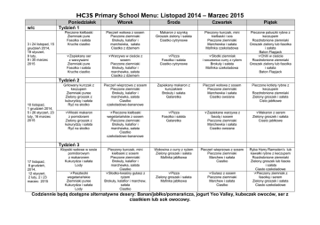 HC3S Primary School Menu: Listopad 2014 – Marzec 2015 w/c 3 i 24 listopad, 15 grudzień 2014, 19 styczeń, 9 luty, 9 i 30 marzec 2015 Poniedziałek Tydzień 1 Wtorek Środa Czwartek Piątek Pieczone kiełbaski Ziemniaki pure Fasolka i sałata Kruche ciastko Pieczeń wołowa z sosem Pieczone ziemniaki Brokuły, kalafior i marchewka, sałata Ciastko z dżemem Makaron z szynką Groszek zielony i sałata Ciastko cytrynowe Pieczony kurczak, mini kiełbaski i sos Pieczone ziemniaki Marchewka i sałata Mafinka czekoladowa Zapiekany ser z warzywami Ziemniaki pure Fasolka i sałata Kruche ciastko Warzywa w cieście z sosem Pieczone ziemniaki Brokuły, kalafior i marchewka, sałata Ciastko z dżemem Pizza Fasolka i sałata Ciastko cytrynowe Słodki ziemniak i soczewica curry z ryżem Brokuły i sałata Mafinka czekoladowa Pieczone paluszki rybne z keczupem Rozdrobnione ziemniaki Groszek zielony lub fasolka i sałata Baton Flapjack Chilli w cieście Rozdrobnione ziemniaki Groszek zielony lub fasolka i sałata Baton Flapjack Grilowany kurczak z keczupem Ziemniaki puree Zielony groszek z kukurydzą i sałata Ryż na słodko Pieczeń wieprzowa z sosem Pieczone ziemniaki Brokuły, kalafior i marchewka, sałata Ciastko czekoladowo-bananowe Zapiekany makaron z kurczakiem Brokuły i sałata Galaretka Pieczeń wołowa z sosem Pieczone ziemniaki Marchewka i sałata Ciastko owsiane Pieczone kotlety rybne z keczupem Rozdrobnione ziemniaki Zielony groszek i sałata Cisto jabłkowe Włoski makaron z pomidorami Zielony groszek z kukurydzą i sałata Ryż na słodko Pieczone kiełbaski wegetariańskie z sosem Pieczone ziemniaki Brokuły, kalafior i marchewka, sałata Ciastko czekoladowo-bananowe Pizza Fasolka i sałata Galaretka Zapiekane warzywa z fasolą i sosem Pieczone ziemniaki Marchewka i sałata Ciastko owsiane Makaron z serem Zielony groszek i sałata Ciasto jabłkowe Pieczony kurczak, mini kiełbaski z sosem Pieczone ziemniaki Brokuły, kalafior i marchewka, sałata Ciastko Słodko-kwaśny gulasz z ryżem Brokuły, kalafior i marchew, sałata Ciastko Wołowina z curry z ryżem Zielony groszek i sałata Mafinka jabłkowa Pieczeń wieprzowa z sosem Pieczone ziemniaki Marchew i sałata Ciastko Pizza Zielony groszek i sałata Mafinka jabłkowa Gulasz z sosem Pieczone ziemniaki Marchew i sałata Ciastko Ryba Harry Ramsden’s lub kawałki rybne z keczupem Rozdrobnione ziemniaki Zielony groszek lub fasola i sałata Ciasto czekoladowe Pieczony ziemniak z fasolką i serem Zielony groszek i sałata Ciasto czekoladowe Tydzień 2 10 listopad, 1 grudzień 2014, 5 i 26 styczeń, 23 luty, 16 marzec 2015 Tydzień 3 17 listopad, 8 grudzień, 2014, 12 styczeń, 2 luty, 2 i 23 marzec 2015 Klopsiki wołowe w sosie pomidorowym z makaronem Kukurydza i sałata Lody Paszteciki wegetariańskie Ziemniaki puree Kukurydza i sałata Lody Codziennie będą dostępne alternatywne desery: Banan/jabłko/pomarańcza, jogurt Yeo Valley, kubeczek owoców, ser z ciastkiem lub sok owocowy.