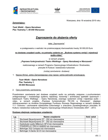 Warszawa, dnia 18 września 2015 roku Zamawiający: Teatr Wielki - Opera Narodowa Plac Teatralny 1, 00-950 Warszawa Zaproszenie do złożenia oferty dalej „Zaproszenie” w postępowaniu o wartości nie przekraczającej równowartości kwoty 30 000,00 Euro na dostawę urządzeń audio, na potrzeby zadania pn. „Budowa systemu emisji i rejestracji audio-video” w ramach projektu „Poprawa funkcjonalności Teatru Wielkiego - Opery Narodowej w Warszawie” realizowanego w ramach Programu Operacyjnego Infrastruktura i Środowisko, priorytet XI Kultura i dziedzictwo kulturowe (rodzaj zamówienia: dostawa) 1. Nazwa (firma), adres Zamawiającego oraz nazwa i adres jednostki wnioskującej. Teatr Wielki - Opera Narodowa Plac Teatralny 1, 00-950 Warszawa 2. Opis przedmiotu zamówienia. Przedmiotem zamówienia jest dostawa urządzeń audio na potrzeby związane z uruchomieniem zintegrowanego i modułowego systemu rejestracji, transmisji i archiwizacji spektakli operowych i baletowych Teatru Wielkiego – Opery Narodowej, zwanego systemem emisji i rejestracji audio – video, w ramach projektu „Poprawa funkcjonalności TW-ON w Warszawie”, objętego dofinansowaniem ze środków Europejskiego Funduszu Rozwoju Regionalnego w ramach działania 11.1 Ochrona i zachowanie dziedzictwa kulturowego o znaczeniu ponadregionalnym priorytetu XI Kultura i dziedzictwo kulturowe Programu Operacyjnego Infrastruktura i Środowisko 2007 – 2013. Dostawa obejmuje następujące urządzenia: Lp. 1. 2. 3. 4. 5. 6. Nazwa urządzenia Słuchawki Beyerdynamic DT - 250 lub równoważne Słuchawki Beyerdynamic DT - 252 lub równoważne Dystrybutor audio Millenium SP-8 lub równoważne POWERPLAY PRO-8 HA8000 lub równoważne Behringer X32 Compact lub równoważne Behringer X-Dante 32-Ch lub równoważne Ilość sztuk 5 2 3 1 1 1 str. 1 3. Sposób realizacji dostawy, wymagania: Sposób realizacji dostawy i związane z tym wymagania zawarte są we wzorze umowy. 4. Termin wykonania zamówienia. Termin wykonania zamówienia ustala się na 7 dni od dnia podpisania umowy. 5. Warunki płatności: Warunki wypłaty wynagrodzenia zawarte są we wzorze umowy. 6. Sposób przygotowania Oferty oraz miejsce i termin składania ofert. Ofertę sporządzoną według formularza stanowiącego załącznik nr 1 do Zaproszenia należy złożyć, zgodnie z wyborem Wykonawcy, w następujących formach: a) osobiście lub przesyłką poleconą/kurierską, w formie papierowej na adres: Teatr Wielki - Opera Narodowa, Urszula Solecka, Specjalista w Zespole Projektowym - Poprawa Funkcjonalności TW-ON, Plac Teatralny 1, 00-950 Warszawa b) faxem na numer Kancelarii Głównej Zamawiającego: (22) 826 04 23 c) w wersji elektronicznej (podpisany skan) na e-mail: [email protected] w nieprzekraczalnym terminie: do dnia 22 września 2015 roku, do godziny 12:00 (decyduje data wpływu). Oferty otrzymane po terminie składania ofert zostaną zwrócone potencjalnym Wykonawcom bez otwierania. W przypadku złożenia/przesłania oferty do Kancelarii Głównej Zamawiającego, za termin złożenia oferty uznaje się termin jej wpływu do Zamawiającego potwierdzony stosowną pieczątką wpływu. W przypadku, gdy wykonawca będzie składał ofertę w formie papierowej powinien ją odpowiednio oznaczyć podając nazwę postępowania. W celu zapewnienia porównywalności wszystkich ofert, Zamawiający, z zachowaniem zasady równego traktowania Wykonawców i zasady uczciwej konkurencji, zastrzega sobie prawo do skontaktowania się z Oferentami w celu uzupełnienia wymaganych dokumentów lub doprecyzowania treści ofert. Zaproszenie nie jest postępowaniem o udzielenie zamówienia w rozumieniu przepisów Prawa zamówień publicznych oraz nie kształtuje zobowiązania Zamawiającego do przyjęcia którejkolwiek z ofert. Zamawiający zastrzega sobie prawo do rezygnacji z zamówienia bez wyboru którejkolwiek ze złożonych ofert bez podania przyczyny. 7. Kryteria, którymi będzie się kierował Zamawiający przy ocenie złożonych ofert: Przy porównywaniu i wyborze najkorzystniejszej oferty Zamawiający będzie stosował następujące kryteria: Cena – 100% (netto) str. 2 Oferta z najniższą ceną otrzyma 100 pkt, inne proporcjonalnie mniej wg wzoru: najniższa cena C = -------------------------------------------------------- x 100 pkt cena badanej oferty Załączniki do Zaproszenia: 1) Załącznik nr 1 do Zaproszenia - Formularz oferty 2) Załącznik nr 2 do Zaproszenia - Wzór umowy str. 3 Załącznik nr 1 do Zaproszenia FORMULARZ OFERTY w postępowaniu o wartości zamówienia nieprzekraczającej równowartości kwoty 30 000,00 Euro na dostawę urządzeń audio, na potrzeby zadania pn. „Budowa systemu emisji i rejestracji audio-video”, w ramach projektu „Poprawa funkcjonalności TW-ON w Warszawie” objętego dofinansowaniem ze środków Europejskiego Funduszu Rozwoju Regionalnego w ramach działania 11.1 Ochrona i zachowanie dziedzictwa kulturowego o znaczeniu ponadregionalnym priorytetu XI Kultura i dziedzictwo kulturowe Programu Operacyjnego Infrastruktura i Środowisko 2007 – 2013. Nazwa (firma) oraz adres Wykonawcy: ......................................................................................................................................... ......................................................................................................................................... NIP: ................................................................................................................................. REGON: .......................................................................................................................... Numer rachunku bankowego: ......................................................................................... 1. Kalkulacja cenowa Wykonawcy za realizację przedmiotu zamówienia: Cena jednostkowa netto /zł/ Podatek VAT /zł/ Cena jednostkowa Cena całkowita Ilość brutto/zł/ netto /zł/ Lp Nazwa urząd