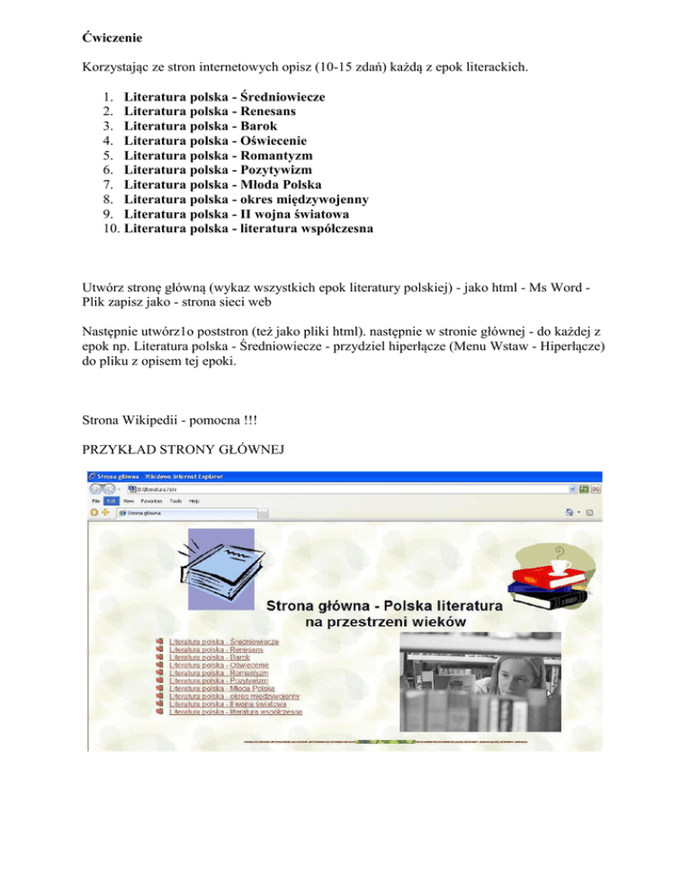 Ćwiczenie Korzystając ze stron internetowych opisz (10-15 zdań) każdą z epok literackich. 1. Literatura polska - Średniowiecze 2. Literatura polska - Renesans 3. Literatura polska - Barok 4. Literatura polska - Oświecenie 5. Literatura polska - Romantyzm 6. Literatura polska - Pozytywizm 7. Literatura polska - Młoda Polska 8. Literatura polska - okres międzywojenny 9. Literatura polska - II wojna światowa 10. Literatura polska - literatura współczesna Utwórz stronę główną (wykaz wszystkich epok literatury polskiej) - jako html - Ms Word Plik zapisz jako - strona sieci web Następnie utwórz1o poststron (też jako pliki html). następnie w stronie głównej - do każdej z epok np. Literatura polska - Średniowiecze - przydziel hiperłącze (Menu Wstaw - Hiperłącze) do pliku z opisem tej epoki. Strona Wikipedii - pomocna !!! PRZYKŁAD STRONY GŁÓWNEJ