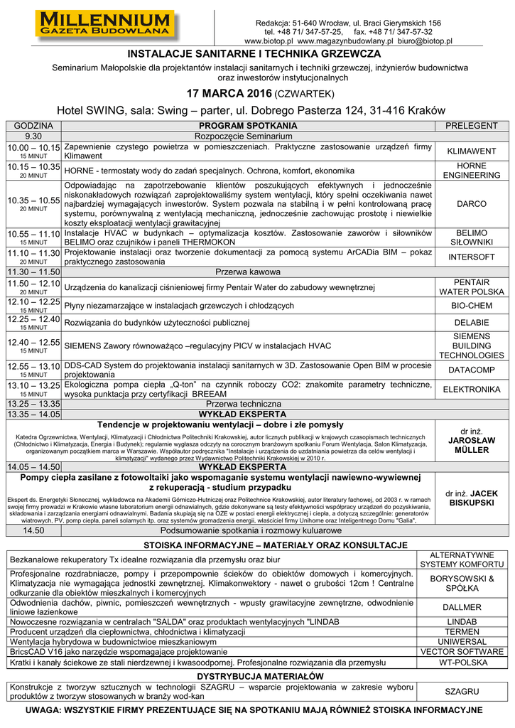 Redakcja: 51-640 Wrocław, ul. Braci Gierymskich 156 tel. +48 71/ 347-57-25, fax. +48 71/ 347-57-32 www.biotop.pl www.magazynbudowlany.pl [email protected] INSTALACJE SANITARNE I TECHNIKA GRZEWCZA Seminarium Małopolskie dla projektantów instalacji sanitarnych i techniki grzewczej, inżynierów budownictwa oraz inwestorów instytucjonalnych 17 MARCA 2016 (CZWARTEK) Hotel SWING, sala: Swing – parter, ul. Dobrego Pasterza 124, 31-416 Kraków PROGRAM SPOTKANIA GODZINA 9.30 Rozpoczęcie Seminarium 10.00 – 10.15 Zapewnienie czystego powietrza w pomieszczeniach. Praktyczne zastosowanie urządzeń firmy 15 MINUT Klimawent 10.15 – 10.35 HORNE - termostaty wody do zadań specjalnych. Ochrona, komfort, ekonomika 20 MINUT Odpowiadając na zapotrzebowanie klientów poszukujących efektywnych i jednocześnie niskonakładowych rozwiązań zaprojektowaliśmy system wentylacji, który spełni oczekiwania nawet 10.35 – 10.55 najbardziej wymagających inwestorów. System pozwala na stabilną i w pełni kontrolowaną pracę 20 MINUT systemu, porównywalną z wentylacją mechaniczną, jednocześnie zachowując prostotę i niewielkie koszty eksploatacji wentylacji grawitacyjnej 10.55 – 11.10 Instalacje HVAC w budynkach – optymalizacja kosztów. Zastosowanie zaworów i siłowników 15 MINUT BELIMO oraz czujników i paneli THERMOKON 11.10 – 11.30 Projektowanie instalacji oraz tworzenie dokumentacji za pomocą systemu ArCADia BIM – pokaz 20 MINUT praktycznego zastosowania 11.30 – 11.50 Przerwa kawowa 11.50 – 12.10 Urządzenia do kanalizacji ciśnieniowej firmy Pentair Water do zabudowy wewnętrznej 20 MINUT KLIMAWENT HORNE ENGINEERING DARCO BELIMO SIŁOWNIKI INTERSOFT PENTAIR WATER POLSKA 12.10 – 12.25 Płyny niezamarzające w instalacjach grzewczych i chłodzących 15 MINUT BIO-CHEM 12.25 – 12.40 Rozwiązania do budynków użyteczności publicznej 15 MINUT DELABIE SIEMENS BUILDING TECHNOLOGIES 12.40 – 12.55 SIEMENS Zawory równoważąco –regulacyjny PICV w instalacjach HVAC 15 MINUT 12.55 – 13.10 DDS-CAD System do projektowania instalacji sanitarnych w 3D. Zastosowanie Open BIM w procesie 15 MINUT projektowania 13.10 – 13.25 Ekologiczna pompa ciepła „Q-ton” na czynnik roboczy CO2: znakomite parametry techniczne, 15 MINUT wysoka punktacja przy certyfikacji BREEAM 13.25 – 13.35 Przerwa techniczna WYKŁAD EKSPERTA 13.35 – 14.05 Tendencje w projektowaniu wentylacji – dobre i złe pomysły Katedra Ogrzewnictwa, Wentylacji, Klimatyzacji i Chłodnictwa Politechniki Krakowskiej, autor licznych publikacji w krajowych czasopismach technicznych (Chłodnictwo i Klimatyzacja, Energia i Budynek); regularnie wygłasza odczyty na corocznym branżowym spotkaniu Forum Wentylacja, Salon Klimatyzacja, organizowanym początkiem marca w Warszawie. Współautor podręcznika "Instalacje i urządzenia do uzdatniania powietrza dla celów wentylacji i klimatyzacji" wydanego przez Wydawnictwo Politechniki Krakowskiej w 2010 r. WYKŁAD EKSPERTA 14.05 – 14.50 Pompy ciepła zasilane z fotowoltaiki jako wspomaganie systemu wentylacji nawiewno-wywiewnej z rekuperacją - studium przypadku Ekspert ds. Energetyki Słonecznej, wykładowca na Akademii Górniczo-Hutniczej oraz Politechnice Krakowskiej, autor literatury fachowej, od 2003 r. w ramach swojej firmy prowadzi w Krakowie własne laboratorium energii odnawialnych, gdzie dokonywane są testy efektywności współpracy urządzeń do pozyskiwania, składowania i zarządzania energiami odnawialnymi. Badania skupiają się na OZE w postaci energii elektrycznej i ciepła, a dotyczą szczególnie: generatorów wiatrowych, PV, pomp ciepła, paneli solarnych itp. oraz systemów gromadzenia energii, właściciel firmy Unihome oraz Inteligentnego Domu "Galia", 14.50 PRELEGENT DATACOMP ELEKTRONIKA dr inż. JAROSŁAW MÜLLER dr inż. JACEK BISKUPSKI Podsumowanie spotkania i rozmowy kuluarowe STOISKA INFORMACYJNE – MATERIAŁY ORAZ KONSULTACJE Bezkanałowe rekuperatory Tx idealne rozwiązania dla przemysłu oraz biur ALTERNATYWNE SYSTEMY KOMFORTU Profesjonalne rozdrabniacze, pompy i przepompownie ścieków do obiektów domowych i komercyjnych. BORYSOWSKI & Klimatyzacja nie wymagająca jednostki zewnętrznej. Klimakonwektory - nawet o grubości 12cm ! Centralne SPÓŁKA odkurzanie dla obiektów mieszkalnych i komercyjnych Odwodnienia dachów, piwnic, pomieszczeń wewnętrznych - wpusty grawitacyjne zewnętrzne, odwodnienie DALLMER liniowe łazienkowe Nowoczesne rozwiązania w centralach "SALDA" oraz produktach wentylacyjnych "LINDAB LINDAB Producent urządzeń dla ciepłownictwa, chłodnictwa i klimatyzacji TERMEN Wentylacja hybrydowa w budownictwioe mieszkaniowym UNIWERSAL BricsCAD V16 jako narzędzie wspomagające projektowanie VECTOR SOFTWARE Kratki i kanały ściekowe ze stali nierdzewnej i kwasoodpornej. Profesjonalne rozwiązania dla przemysłu WT-POLSKA DYSTRYBUCJA MATERIAŁÓW Konstrukcje z tworzyw sztucznych w technologii SZAGRU – wsparcie projektowania w zakresie wyboru produktów z tworzyw stosowanych w branży wod-kan SZAGRU UWAGA: WSZYSTKIE FIRMY PREZENTUJĄCE SIĘ NA SPOTKANIU MAJĄ RÓWNIEŻ STOISKA INFORMACYJNE