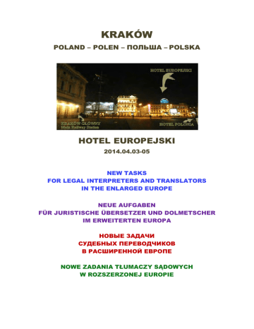 KRAKÓW POLAND – POLEN – ПОЛЬША – POLSKA HOTEL EUROPEJSKI 2014.04.03-05 NEW TASKS FOR LEGAL INTERPRETERS AND TRANSLATORS IN THE ENLARGED EUROPE NEUE AUFGABEN FÜR JURISTISCHE ÜBERSETZER UND DOLMETSCHER IM ERWEITERTEN EUROPA НОВЫЕ ЗАДАЧИ СУДЕБНЫХ ПЕРЕВОДЧИКОВ В РACШИPEННОЙ ЕВРОПЕ NOWE ZADANIA TŁUMACZY SĄDOWYCH W ROZSZERZONEJ EUROPIE HOTEL EUROPEJSKI 31-034 Kraków, ul. Lubicz 5 RATES FOR ROOMS RESERVED BY ’TEPIS’ od/from 03.04.2014 do/to 06.04.2014 Reservation valid by 31st January 2014 Room category One night stay Typ pokoju Pobyt 1 doba _______________________________________________________ 1-osobowy standard Single room PLN 345 - 20% 2-osobowy standard Double/twin room PLN 385 – 20% 2-osobowy plus Double/twin plus PLN 485 – 20% 3-osobowy Triple room PLN 459 – 20% Superior PLN 545 – 20% Cena zawiera: VAT, śniadanie, saunę Price includes: VAT. breakfast, sauna Opłata lokalna 1,60 PLN /osoba/dzień nie wliczona w cenę pokoju Local tax PLN 1.60/person/day not included in the price of room HOTEL POLONIA 31-156 Kraków, ul. Basztowa 25 RESERVATION FORM for rooms booked for ‘TEPIS’ at discounted rates Name of the Guest: ................................................................................................ Arrival date: ........................................... Departure Date: ................................ E-mail address: .................................................................................... I hereby ask for reservation (please tick X on the selected option): Hotel: Room Type: Breakfast: Hotel Polonia Single room (price Price / night) PLN 240 Twin/double room (price / night) PLN 260 Included in the room price 00.00 This reservation is guaranteed. In case of no-show and lack of cancellation I agree to charge my credit card as no-show fee (payment for first disused night). Credit card number : ..................................................................................... Exp. date ....................................................................................................... Date and guest signature: ............................................................................. There is a limited number of rooms reserved for Participants of the TEPIS Conference In the Polonia Hotel. Each reservation must be finally confirmed by the Hotel. No-cost cancellation must be made till the end of January 2014. Please return the completed form by scan to [email protected] Phone number +48 12 422 12 33 HOTEL IBIS 31-154 Kraków, ul. Pawia 15 RESERVATION FORM for rooms booked for ‘TEPIS’ at discounted rates Name of the Guest: ................................................................................................ Arrival date: ........................................... Departure Date: ................................ E-mail address: .................................................................................... I hereby ask for reservation (please tick X on the selected option) : Hotel: Room Type: Breakfast: Ibis Kraków Stare Miasto Ibis budget Kraków Stare Miasto Single room (price 259pln / night) Single room (price 149pln / night) Twin room (price 293 pln / night) Twin room (price 149pln / night) Included in the room price Breakfast (price 21 pln / person/ night) This reservation is guaranteed. In case of no-show and lack of cancellation I agree to charge my credit card as no-show fee (payment for first disused night). Credit card number: ..................................................................................... Exp. Date: ...................................................................................................... Date and guest signature: ............................................................................. There is a limited number of rooms reserved for Participants of the TEPIS Conference In the Ibis Hotel. Each reservation must be finally confirmed by the Hotel. No-cost cancellation must be made before 6 pm on the arrival date Please return the completed form by scan on the below address: Reservation at Ibis Kraków Stare Miasto Hotel: [email protected] Address: ul. Pawia 15, 31-154 Kraków, phone number +48 12 355 29 00 Reservation at Ibis Budget Kraków Stare Miasto Hotel: [email protected] Address: ul. Pawia 11, 31-154 Kraków, phone number +48 12 355 29 50