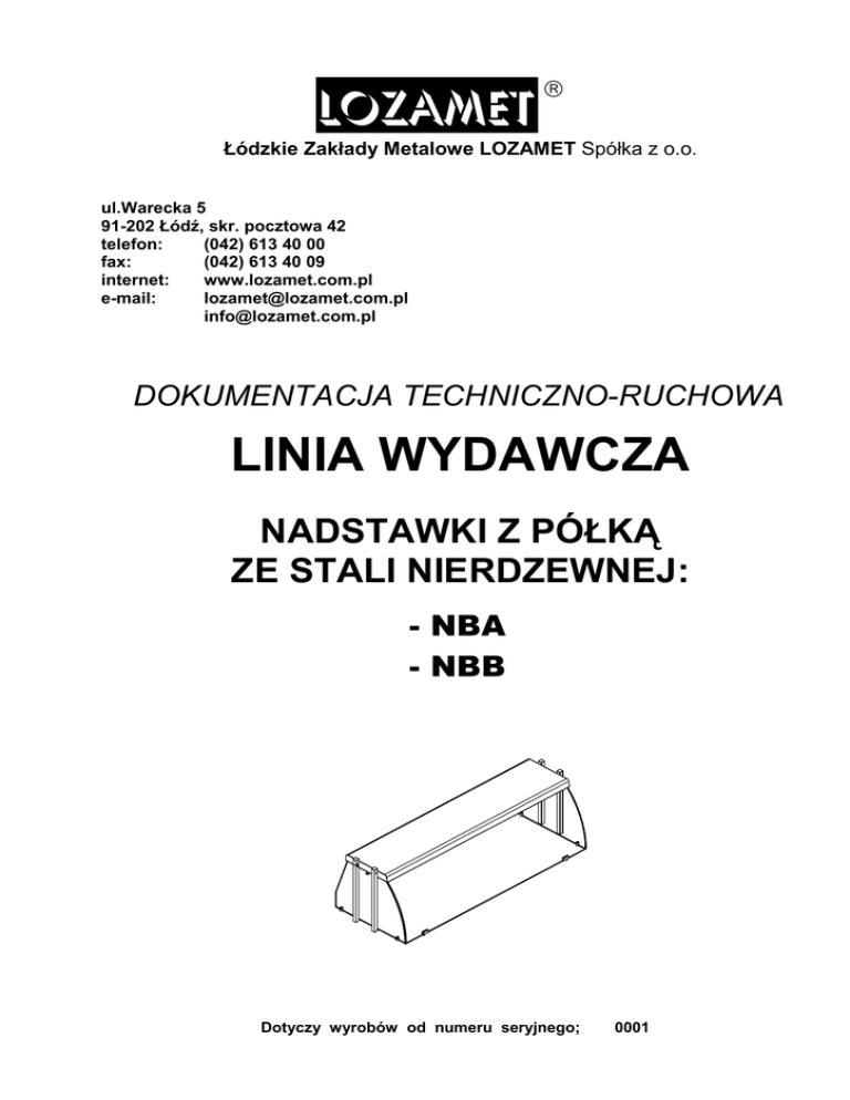 LOZAMEt Łódzkie Zakłady Metalowe LOZAMET Spółka z o.o. ul.Warecka 5 91-202 Łódź, skr. pocztowa 42 telefon: (042) 613 40 00 fax: (042) 613 40 09 internet: www.lozamet.com.pl e-mail: [email protected] [email protected] DOKUMENTACJA TECHNICZNO-RUCHOWA LINIA WYDAWCZA NADSTAWKI Z PÓŁKĄ ZE STALI NIERDZEWNEJ: - NBA - NBB Dotyczy wyrobów od numeru seryjnego; 0001 SPIS TREŚCI Strona 1 CHARAKTERYSTYKA 3 1.1 Zastosowanie 3 1.2 Dane techniczne 3 1.3 Ogólny opis budowy 4 INSTRUKCJA MONTAŻU 4 2 2.1 Ustawienie i montaż 4 2.2 Przyłączenie do instalacji elektrycznej 5 2.2.1 3 Przyłączenie do instalacji elektrycznej INSTRUKCJA OBSŁUGI 5 6 3.1 Przygotowanie nadstawki do pracy 6 3.2 Czynności podczas pracy 6 3.3 Czynności po zakończeniu pracy 6 4 WSKAZANIA BEZPIECZEŃSTWA I HIGIENY PRACY 6 5 INSTRUKCJA KONSERWACJI I NAPRAWY 7 5.1 Konserwacja 7 5.2 Naprawy i remonty 7 5.3 Wykaz typowych uszkodzeń i zalecane sposoby naprawy 7 6 WYPOSAŻENIE STANDARDOWE 8 7 WYKAZ CZĘŚCI ZAMIENNYCH 8 9 SCHEMATY ELEKTRYCZNE 9 2 1 CHARAKTERYSTYKA 1.1 Zastosowanie Nadstawka z półką metalową na segment linii wydawczej spełnia rolę osłony i dodatkowego miejsca ekspozycyjnego lub odkładczego. Nadstawka wyposażona w szyby ma dodatkowo za zadanie utrzymanie temperatury potraw umieszczonych pod nią. Może być wyposażona w oświetlenie fluorescencyjne w celach ekspozycyjnych lub w oświetlenie i grzanie promiennikami halogenowo kwarcowymi w celu dodatkowego zabezpieczenia potraw przed utratą ciepła. 1.2 Dane techniczne NADSTAWKI Z PÓŁKĄ ZE STALI NIERDZEWNEJ I SZYBĄ PRZEDNIĄ PŁASKĄ Model Wymiary L L1 Moc znam. (W) NB.B.08.0/N NB.B.10.0/N NB.B.12.0/N NB.B.15.0/N Z szybą przednią i bocznymi NB.B.08.0/N/B NB.B.10.0/N/B NB.B.12.0/N/B NB.B.15.0/N/B 843 1007 1187 1528 - NB.A.08.0/O NB.A.10.0/O NB.A.12.0/O NB.A.15.0/O NB.B.08.0/O NB.B.10.0/O NB.B.12.0/O NB.B.15.0/O NB.B.08.0/O/B NB.B.10.0/O/B NB.B.12.0/O/B NB.B.15.0/O/B 843 1007 1187 1528 NB.A.08.0/G NB.A.12.0/G NB.A.15.0/G NB.B.08.0/G NB.B.12.0/G NB.B.15.0/G NB.B.08.0/G/B NB.B.12.0/G/B NB.B.15.0/G/B 843 1187 1528 Bez szyb Możliwość montażu szyb NB.A.08.0/N NB.A.10.0/N NB.A.12.0/N NB.A.15.0/N Z szybą przednią Zasilanie Uwagi - - Nneutralna 786 950 1130 1472 1x13 1x13 1x21 2x13 ~230V 50Hz Ooświetlenie fluorescencyjne 786 1130 1472 1x300 2x300 3x300 ~230V 50Hz Goświetlenie i grzanie halogenowo-kwarcowe NADSTAWKI Z PÓŁKĄ ZE STALI NIERDZEWNEJ I SZYBĄ PRZEDNIĄ Z PROMIENIEM (WYPUKŁĄ) Model Wymiary L L1 Moc znam. (W) NB.B.08.5/N NB.B.10.5/N NB.B.12.5/N NB.B.15.5/N Z szybą przednią i bocznymi NB.B.08.5/N/B NB.B.10.5/N/B NB.B.12.5/N/B NB.B.15.5/N/B 843 1007 1187 1528 - NB.A.08.5/O NB.A.10.5/O NB.A.12.5/O NB.A.15.5/O NB.B.08.5/O NB.B.10.5/O NB.B.12.5/O NB.B.15.5/O NB.B.08.5/O/B NB.B.10.5/O/B NB.B.12.5/O/B NB.B.15.5/O/B 843 1007 1187 1528 NB.A.08.5/G NB.A.12.5/G NB.A.15.5/G NB.B.08.5/G NB.B.12.5/G NB.B.15.5/G NB.B.08.5/G/B NB.B.12.5/G/B NB.B.15.5/G/B 843 1187 1528 Bez szyb Możliwość montażu szyb NB.A.08.5/N NB.A.10.5/N NB.A.12.5/N NB.A.15.5/N Z szybą przednią Zasilanie Uwagi - - Nneutralna 786 950 1130 1472 1x13 1x13 1x21 2x13 ~230V 50Hz Ooświetlenie fluorescencyjne 786 1130 1472 1x300 2x300 3x300 ~230V 50Hz Goświetlenie i grzanie halogenowo-kwarcowe 3 1.3 Ogólny opis budowy Nadstawka składa się z półki metalowej wspartej na 4 nogach. Półka może posiadać szyby, przednią lub przednią i boczne. Wewnątrz półki w zależności od wykonania umieszczony jest panel neutralny, panel oświetleniowy lub panel halogenowo kwarcowy. • Panel oświetleniowy wyposażony jest w oprawy oświetleniowe ze świetlówkami i indywidualnymi wyłącznikami. • Panel halogenowo- kwarcowy wyposażony jest w oprawki promienników, promienniki halogenowo – kwarcowe i ogólny wyłącznik klawiszowy. Nadstawki wyposażone w urządzenia elektryczne posiadają przewód zasilający, który z jednej strony zakończony jest wtyczką, a drugi przeprowadzony jest przez jedną z nóg do panela. 2 INSTRUKCJA MONTAŻU 2.1 Ustawienie i montaż Nadstawka montowana jest na segmencie linii wydawczej produkcji LOZAMET przed wysyłką w zakładzie lub na zewnątrz u klienta przez serwis fabryczny. Może być też montowana na innych stołach lub blatach. Pomieszczenie, w którym pracowała będzie nadstawka powinno mieć: • instalację elektryczną jednofazową 230V ~50Hz. • instalacja elektryczna powinna mieć skuteczną ochronę przeciwporażeniową, Aby zamontować nadstawkę należy wcześniej wykonać w blacie odpowiednie otwory wg rysunku poniżej. Strona obslugi 46 46 4 otwory M4 Do uchwytów szyb bocznych 24 160 Strona klienta 27 27 150 102 265 455 455 102 265 150 4 otwory O12,5mm Do nóg nadstawki 24 160 2 otwory O 7mm Do wsporników szyby przedniej Przykręcić cztery nogi nadstawki do blatu wykorzystując tuleje rozporowe. Nadstawki wyposażone w urządzenia elektryczne posiadają przewód zasilający, który z jednej strony zakończony jest wtyczką, a drugi przeprowadzony jest przez jedną z nóg do panela przez otwór Ø 8mm w jednej ze śrub M12. O8 4 Zamontować szybę przednią wykorzystując 2 otwory Ø7 mm do uchwytów szyby przedniej. Zamontować szyby boczne wykorzystując 4 otwory M4 do uchwytów szyb bocznych 700 600 700 600 510 340 450 360 150 3 265 3 3 3 1 1 150 2 3 265 2 3 1 - Nogi nadstawki 2 - Wsporniki szyby przedniej 3 - Uchwyty szyb bocznych 2.2 Przyłączenie do instalacji elektrycznej Podczas instalowania urządzenia należy przestrzegać następujących obowiązujących przepisów: • Normy, przepisy, zarządzenia budowlane i przeciwpożarowe. • Przepisy bezpieczeństwa i higieny pracy. • Normy, przepisy, zarządzenia dotyczące instalacji i urządzeń elektrycznych. Instalator powinien: • Zapoznać się z informacjami umieszczonymi na tabliczce znamionowej. • Sprawdzić skuteczność działania wszystkich elementów urządzenia. • Zapoznać użytkownika z obsługą urządzenia. 2.2.1 Przyłączenie do instalacji