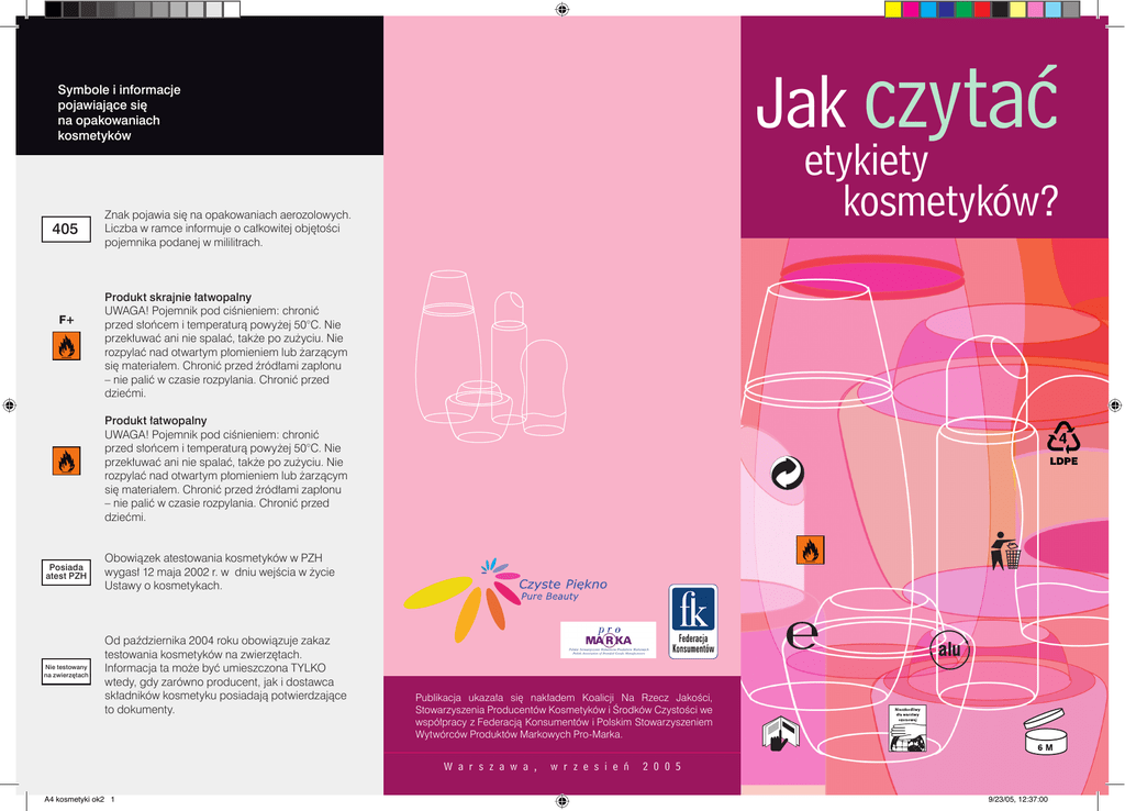 Jak czytać Symbole i informacje pojawiające się na opakowaniach kosmetyków 405 F+ etykiety kosmetyków? Znak pojawia się na opakowaniach aerozolowych. Liczba w ramce informuje o całkowitej objętości pojemnika podanej w mililitrach. Produkt skrajnie łatwopalny UWAGA! Pojemnik pod ciśnieniem: chronić przed słońcem i temperaturą powyżej 50°C. Nie przekłuwać ani nie spalać, także po zużyciu. Nie rozpylać nad otwartym płomieniem lub żarzącym się materiałem. Chronić przed źródłami zapłonu – nie palić w czasie rozpylania. Chronić przed dziećmi. Produkt łatwopalny UWAGA! Pojemnik pod ciśnieniem: chronić przed słońcem i temperaturą powyżej 50°C. Nie przekłuwać ani nie spalać, także po zużyciu. Nie rozpylać nad otwartym płomieniem lub żarzącym się materiałem. Chronić przed źródłami zapłonu – nie palić w czasie rozpylania. Chronić przed dziećmi. Posiada atest PZH Nie testowany na zwierzętach Obowiązek atestowania kosmetyków w PZH wygasł 12 maja 2002 r. w dniu wejścia w życie Ustawy o kosmetykach. Od października 2004 roku obowiązuje zakaz testowania kosmetyków na zwierzętach. Informacja ta może być umieszczona TYLKO wtedy, gdy zarówno producent, jak i dostawca składników kosmetyku posiadają potwierdzające to dokumenty. Publikacja ukazała się nakładem Koalicji Na Rzecz Jakości, Stowarzyszenia Producentów Kosmetyków i Środków Czystości we współpracy z Federacją Konsumentów i Polskim Stowarzyszeniem Wytwórców Produktów Markowych Pro-Marka. W a r s z a w a , A4 kosmetyki ok2 1 w r z e s i e ń 2 0 0 5 9/23/05, 12:37:00 Jak czytać etykiety kosmetyków? Producenci kosmetyków podają na etykietach dokładne informacje o przeznaczeniu swoich produktów i sposobie ich stosowania. Obok informacji tekstowych na etykietach kosmetyków znajdują się różne symbole graficzne. Wielu z nas niejednokrotnie gubi się w ich gąszczu. Przyjrzyjmy się niektórym z tych oznaczeń i rozszyfrujmy je. Symbol „RĘKA NA KSIĄŻCE” oznacza, że do opakowania dołączona jest ulotka informacyjna. Zdarza się bowiem, że w przypadku braku miejsca na etykiecie, niektóre ważne informacje (skład kosmetyku, ostrzeżenia związane z jego stosowaniem), podane są tylko w dołączonej ulotce. Tam też często umieszczony jest sposób użycia. Niezależnie od tego, gdzie informacje są umieszczone, należy się z nimi dokładnie zapoznać i stosować się do zaleceń producenta. Pozwoli to w pełni korzystać z walorów kosmetyków, a także uniknąć przykrych niespodzianek. Symbole i informacje pojawiające się na opakowaniach kosmetyków Znak informujący o realizacji przez producenta obowiązku odzysku opakowania. Znak umieszczany dobrowolnie. TERMIN TRWAŁOŚCI Podawany jest tylko na kosmetykach o trwałości krótszej od 30 miesięcy, najczęściej w formie miesiąc/rok (np. 06/2006) i poprzedzonej słowami: „Najlepiej zużyć przed końcem:”. Na wyrobach o trwałości dłuższej od 30 miesięcy nie ma obowiązku podawania daty ważności, zamiast tego pojawia się na opakowaniu symbol otwartego słoika. Znak „e” podawany przy zawartości nominalnej produktu ([g] lub [ml]) informuje, że producent skorzystał z uznaniowego standardowego systemu kontroli wagi lub objętości na etapie produkcyjnym. Znak umieszczany dobrowolnie. SYMBOL OTWARTEGO SŁOIKA Nowy symbol, który pojawił się na opakowaniach informuje, jak długo można używać kosmetyku. Obok lub na symbolu słoika podany jest OKRES TRWAŁOŚCI PO OTWARCIU czyli okres bezpiecznego stosowania kosmetyku, licząc od jego pierwszego użycia. Jest to czas, w którym producent gwarantuje bezpieczeństwo zdrowotne kosmetyku. Okres ten określany jest w miesiącach (np. 6M). WYKAZ SKŁADNIKÓW Do każdego kosmetyku dołączona jest lista składników. Zwykle znajduje się ona na dole opakowania i poprzedzona jest słowem INGREDIENTS lub SKŁADNIKI. Obecnie lista ta może być dłuższa niż poprzednio, gdyż niektóre składniki kompozycji zapachowych i aromatycznych określane dotychczas słowem „PARFUM” lub/i „AROMA” są wymienione z nazwy. Osoby cierpiące z powodu alergii powinny dokładnie sprawdzić, czy wśród składników kosmetyku nie ma takiego, na który są uczuleni. BRAK SYMBOLU OTWARTEGO SŁOIKA? BRAK TERMINU TRWAŁOŚCI? KONTAKT Z PRODUCENTEM Na opakowaniu kosmetyku umieszczona jest nazwa producenta, jego adres pocztowy (ew. elektroniczny) albo numer telefonu. Dzięki temu użytkownik ma łatwy dostęp do kompetentnej informacji dotyczącej danego produktu, a także ma możliwość złożenia tą drogą reklamacji. A4 kosmetyki ok2 2 Posiada atest PZH Nie testowany na zwierzętach 200 ml Nie, to nie drukarski chochlik! Pewne produkty nie wymagają podania „okresu trwałości po otwarciu”, ponieważ nie zachodzi ryzyko pogorszenia ich bezpieczeństwa zdrowotnego po otwarciu opakowania. Są to m.in.: • produkty jednorazowe, • próbki jednokrotnego użycia, • aerozole, • produkty, w których ze względu na ich skład, nie mogą rozwijać się mikroorganizmy, np. produkty o dużej zawartości alkoholu (wody toaletowe, niektóre dezodoranty czy płyny po goleniu) lub o małej zawartości wody (np. szminki do ust). 41 ALU Oznaczenie rodzaju materiału, z którego wykonano opakowanie. Znak umieszczany dobrowolnie. Znak wskazujący, że opakowanie powinno trafić do kosza na odpady. Pojawia się tylko na etykietach wielojęzycznych. Nie przewidziany w Polsce. „Ozon friendly” („przyjazny dla warstwy ozonowej”). Znak pojawia się tylko na wielojęzycznych etykietach aerozoli. Nie przewidziany w Polsce. Znak – odwrócone „epsilon” pojawia się na opakowaniach aerozolowych i oznajmia, że produkt spełnia polskie i europejskie wymagania stawiane tego typu wyrobom. 9/23/05, 12:37:03