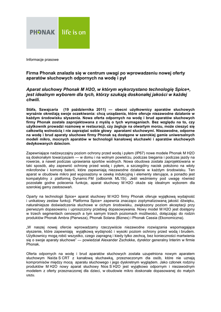 Informacje prasowe Firma Phonak znalazła się w centrum uwagi po wprowadzeniu nowej oferty aparatów słuchowych odpornych na wodę i pył Aparat słuchowy Phonak M H2O, w którym wykorzystano technologię Spice+, jest idealnym wyborem dla tych, którzy szukają doskonałej jakości w każdej chwili. Stäfa, Szwajcaria (19 października 2011) — obecni użytkownicy aparatów słuchowych wyraźnie określają swoje oczekiwania: chcą urządzenia, które oferuje niezawodne działanie w każdym środowisku słyszenia. Nowa oferta odpornych na wodę i brud aparatów słuchowych firmy Phonak została zaprojektowana z myślą o tych wymaganiach. Bez względu na to, czy użytkownik prowadzi rozmowę w restauracji, czy żegluje na otwartym morzu, może cieszyć się całkowitą wolnością i nie zaprzątać sobie głowy aparatami słuchowymi. Niezawodne, odporne na wodę i brud aparaty słuchowe firmy Phonak są dostępne w szerokiej gamie uniwersalnych modeli mikro, mocnych aparatów w technologii kanałowej słuchawki i aparatów słuchowych dedykowanych dzieciom. Zapewniające nadzwyczajny poziom ochrony przed wodą i pyłem (IP67) nowe modele Phonak M H2O są doskonałym towarzyszem — w domu i na wolnym powietrzu, podczas biegania i podczas jazdy na rowerze, a nawet podczas uprawiania sportów wodnych. Nowa obudowa została zaprojektowana w taki sposób, aby zapewnić ochronę przed wodą i pyłem, a szczególny nacisk położono na wloty mikrofonów i komorę baterii, które zapewniają niezawodne działanie w każdym środowisku. Ten aparat w obudowie mikro jest wyposażony w cewkę indukcyjną i elementy sterujące, a ponadto jest kompatybilny z platformą Dynamic FM (odbiornik ML15i). Jeśli weźmiemy pod uwagę również pozostałe godne polecenia funkcje, aparat słuchowy M H2O okaże się idealnym wyborem dla szerokiej gamy zastosowań. Oparty na technologii Spice+ aparat słuchowy M H2O firmy Phonak oferuje wyjątkową wydajność i unikatowy zestaw funkcji. Platforma Spice+ zapewnia znacząco zoptymalizowaną jakość dźwięku, naturalniejsze doświadczenia słuchowe w cichym środowisku, zwiększony poziom akceptacji przy pierwszym dopasowaniu i uproszczony przebieg dopasowywania. Nowy model M H2O jest dostępny w trzech segmentach cenowych a tym samym trzech poziomach możliwości, dołączając do rodzin produktów Phonak Ambra (Pierwsza), Phonak Solana (Biznes) i Phonak Cassia (Ekonomiczna). „W naszej nowej ofercie wprowadzamy rzeczywiście niezawodne rozwiązania wspomagające słyszenie, które zapewniają wyjątkową wydajność i wysoki poziom ochrony przed wodą i brudem. Użytkownicy mogą robić wszystko, czego zapragną i kiedy tylko zechcą, bez konieczności martwienia się o swoje aparaty słuchowe” — powiedział Alexander Zschokke, dyrektor generalny Interim w firmie Phonak. Oferta odpornych na wodę i brud aparatów słuchowych została uzupełniona nowym aparatem słuchowym Naída S CRT z kanałową słuchawką, przeznaczonym dla osób, które nie uznają kompromisów między mocą aparatu słuchowego i jego dyskretnym wyglądem. Jako członek rodziny produktów M H2O nowy aparat słuchowy Nios S H2O jest wyjątkowo odpornym i niezawodnym modelem z oferty przeznaczonej dla dzieci, w obudowie mikro doskonale dopasowanej do małych uszu. O firmie Phonak Firma Phonak, członek Sonova Group z główną siedzibą blisko Zurychu w Szwajcarii, od ponad 50 lat specjalizuje się w projektowaniu, produkcji i ogólnoświatowej dystrybucji zaawansowanych technologicznie aparatów słuchowych i urządzeń bezprzewodowych. Dzięki połączeniu fachowości w dziedzinie technologii słuchowej i ścisłej współpracy z protetykami słuchu, Phonak może zapewnić poprawę jakości życia osobom niedosłyszącym oraz ich bliskim. Grupa Phonak może zaproponować pełny wybór cyfrowych aparatów słuchowych oraz uzupełniających je bezprzewodowych systemów. Działający na całym świecie Phonak wprowadza innowacje i ustanawia nowe standardy w branży w zakresie miniaturyzacji i wydajności produktów. Więcej informacji na stronach www.phonakpro.pl i www.phonak.pl i lub poprzez bezpośredni kontakt: Audrey Jourdan Modarres Corporate Communication Tel: +41 (0)58 928 01 01 Email: [email protected] Phonak AG Laubisrütistrasse 28 CH - 8712 Stäfa Tel: +41 (0)58 928 01 01 Fax: +41 (0)58 928 20 11 www.phonak.com Phonak – Life is on Jesteśmy wrażliwi na potrzeby tych, którzy zdają się na naszą wiedzę, pomysły i troskę. A dzięki twórczemu pokonywaniu wyzwań technologii wprowadzamy innowacje, które pomagają ludziom słyszeć, rozumieć oraz doświadczać całego bogactwa dźwięków, w które obfituje życie. Współdziałaj swobodnie. Porozumiewaj się pewnie. Żyj bez ograniczeń. Life is on. .