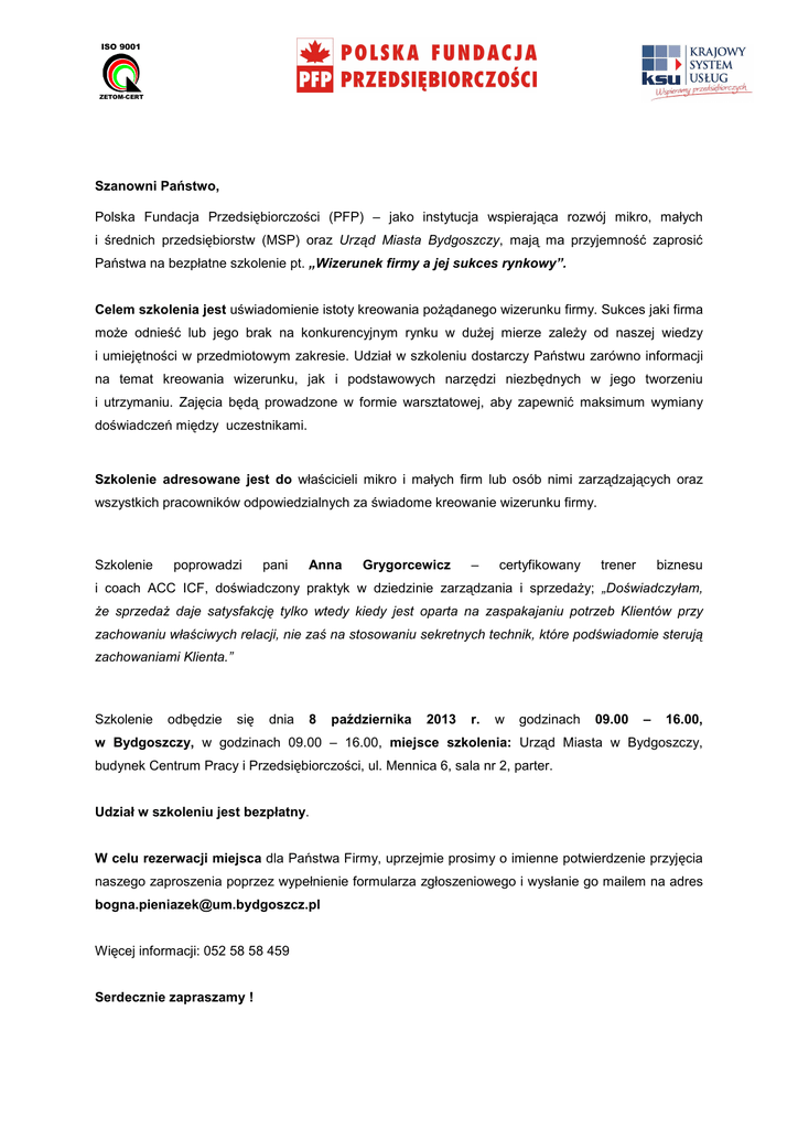 ISO 9001 ZETOM-CERT Szanowni Państwo, Polska Fundacja Przedsiębiorczości (PFP) – jako instytucja wspierająca rozwój mikro, małych i średnich przedsiębiorstw (MSP) oraz Urząd Miasta Bydgoszczy, mają ma przyjemność zaprosić Państwa na bezpłatne szkolenie pt. „Wizerunek firmy a jej sukces rynkowy”. Celem szkolenia jest uświadomienie istoty kreowania poŜądanego wizerunku firmy. Sukces jaki firma moŜe odnieść lub jego brak na konkurencyjnym rynku w duŜej mierze zaleŜy od naszej wiedzy i umiejętności w przedmiotowym zakresie. Udział w szkoleniu dostarczy Państwu zarówno informacji na temat kreowania wizerunku, jak i podstawowych narzędzi niezbędnych w jego tworzeniu i utrzymaniu. Zajęcia będą prowadzone w formie warsztatowej, aby zapewnić maksimum wymiany doświadczeń między uczestnikami. Szkolenie adresowane jest do właścicieli mikro i małych firm lub osób nimi zarządzających oraz wszystkich pracowników odpowiedzialnych za świadome kreowanie wizerunku firmy. Szkolenie poprowadzi pani Anna Grygorcewicz – certyfikowany trener biznesu i coach ACC ICF, doświadczony praktyk w dziedzinie zarządzania i sprzedaŜy; „Doświadczyłam, Ŝe sprzedaŜ daje satysfakcję tylko wtedy kiedy jest oparta na zaspakajaniu potrzeb Klientów przy zachowaniu właściwych relacji, nie zaś na stosowaniu sekretnych technik, które podświadomie sterują zachowaniami Klienta.” Szkolenie odbędzie się dnia 8 października 2013 r. w godzinach 09.00 – 16.00, w Bydgoszczy, w godzinach 09.00 – 16.00, miejsce szkolenia: Urząd Miasta w Bydgoszczy, budynek Centrum Pracy i Przedsiębiorczości, ul. Mennica 6, sala nr 2, parter. Udział w szkoleniu jest bezpłatny. W celu rezerwacji miejsca dla Państwa Firmy, uprzejmie prosimy o imienne potwierdzenie przyjęcia naszego zaproszenia poprzez wypełnienie formularza zgłoszeniowego i wysłanie go mailem na adres [email protected] Więcej informacji: 052 58 58 459 Serdecznie zapraszamy ! ISO 9001 ZETOM-CERT Program szkolenia „Wizerunek firmy a jej sukces rynkowy” Godzina 09.00 – 09.15 Temat zajęć Powitanie uczestników i wprowadzenie Znaczenie wizerunku firmy 9.15 – 10.30 Kto i co wpływa na wizerunek firmy w oczach Klientów? Misja i wizja przedsiębiorstwa 10.30 – 10.45 Przerwa System identyfikacji wizualnej firmy 10.45 – 12.15 12.15 – 12.45 Wybór środków promocji Przerwa E-branding - kreowanie marki w Internecie: - właściwie zaprojektowana strona internetowa: 12.30 – 14.00 14.00 – 14.15 • podstawowe informacje i ich układ na stronie • formy kontaktu z klientem portale społecznościowe Przerwa Savoir - vivre w biznesie: 14.15 – 16.00 16.00 - jak wywrzeć dobre pierwsze wraŜenie? - spotkanie biznesowe - powitanie, podanie ręki - wymiana wizytówek Zakończenie szkolenia