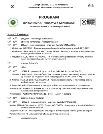 Zarząd Oddziału SITG we Wrocławiu Politechnika Wrocławska — Instytut Górnictwa PROGRAM XV Konferencji KRUSZYWA MINERALNE Surowce – Rynek – Technologie – Jakość Środa 22 kwietnia 1000 – 1200 – przyjazd i rejestracja uczestników 1200 – 1230 – otwarcie konferencji, wystąpienia gości 1230 – 1330 SESJA 1 – przewodnicząca – mgr inż. Mariola STEFANICKA 1. Aleksander KABZIŃSKI – Prognoza zapotrzebowania na kruszywa w latach 2015–2022 2. Włodzimierz BEM, Wojciech GLAPA, Cezary SROGA – Produkcja kruszyw w województwie dolnośląskim w latach 2009–2014 3. Krzysztof GALOS, Paweł PIETKIEWICZ – W kierunku nowego standardu wyceny nieruchomości ze złożami kopalin (w tym kruszywowymi) 1345 – wspólna fotografia 1400 – 1500 – obiad 1515 – 1630 SESJA 2 – przewodniczący – prof. dr hab. inż. Krzysztof GALOS 1. Tomasz KUBUSZEWSKI, Stefan GÓRALCZYK – Analiza systemu zakładowej kontroli produkcji kruszyw po wejściu w życie rozporządzenia nr 305/2011 (CPR) 2. Miranda PTAK, Zbigniew KASZTELEWICZ – Najistotniejsze zmiany w nowelizacji prawa geologicznego i górniczego 3. Marek WILAND – Postępowanie koncesyjne a dokumenty planowania przestrzennego Prezentacja – HYDRO-TECH-SORT Sp. z o.o.- Recykling i innowacyjność w przerobie hałd w kopalniach odkrywkowych Prezentacja – Austin Powder Polska Sp. z o.o. – Austin w Europie 1630 – 1645 1645 – 1800 – przerwa (kawa, herbata) SESJA 3 – przewodnicząca – mgr inż. Mariola STEFANICKA Mariola STEFANICKA, Manfred WEISS, Tomasz WOJTASZEK – Inwestycje w kopalni Wieśnica – biznes i bezpieczeństwo Zbigniew SUCHYTA – Wkład górnictwa skalnego w zrównoważony rozwój gminy Strzegom Panel dyskusyjny nt. Jak wspierać lokalną politykę surowcową 1900 – uroczysta kolacja Czwartek 23 kwietnia 800 – 900 900 – 1015 – śniadanie SESJA 4 – przewodniczący – prof. dr hab. inż. Piotr WODZIŃSKI 1. Jerzy MALEWSKI – Analiza układu kruszenia rudy w ZWR LUBIN 2. Zdzisław NAZIEMIEC, Daniel SARAMAK – Zastosowanie krzywych rozdziału w ocenie procesów klasyfikacji produktów mineralnych 3. Daniel KOWOL, Piotr MATUSIAK – Badania skuteczności osadzarkowego oczyszczania kruszywa z ziaren węglanowych Prezentacja – KGHM ZANAM Sp. z o.o. – Wydział odlewni KGHM ZANAM Prezentacja – KRUSZYWA.NET Sp. z o.o. – Prezentacja portalu kruszywa.net 1015 – 1100 1100 – 1215 – przerwa (kawa, herbata, wystawa firm) SESJA 5 – przewodniczący – prof. dr hab. inż. Jerzy MALEWSKI 1. Tomasz GAWENDA – Innowacyjne technologie produkcji kruszyw o ziarnach foremnych 2. Arkadiusz GRZEŚKOWIAK, Sławomir PATLA, Kamil ROGOSZ – Zastosowanie metody Taguchi w badaniach efektów robót strzałowych 3. Żaklina KONOPACKA, Zbigniew NĘDZA, Michał STOPA – Oznaczanie wolnej krystalicznej krzemionki w pyłach emitowanych na stanowiskach pracy w górnictwie skalnym Prezentacja – SSE Polska Sp. z o.o. – Systemy mechaniczno-załadowcze materiałów emulsyjnych, saletrzanych i heavy ANFO na przykładzie Triple Truck Prezentacja – Rafał Czapski „Maszyny Budowlane” – Oszczędności i maksymalna wydajność w maszynach Hitachi i Bell” 1215 – 1230 1230 – 1345 – przerwa (kawa, herbata) SESJA 6 - przewodniczący – mgr inż. Aleksander KABZIŃSKI 1. Mariola STEFANICKA, Bartosz KOWALCZYK, Łukasz NASTALA, Grzegorz PIĄTEK – Polityka bezpieczeństwa i praktyczne aspekty jej wdrażania w wybranych firmach producentów kruszyw 2. Aleksander KABZIŃSKI – Prace Komisji Bezpieczeństwa PZPK 3. Panel dyskusyjny nt. Co możemy robić wspólnie w sprawie poprawy bezpieczeństwa w górnictwie skalnym Prezentacja – KOMATSU POLAND Sp. z o.o. – Zastosowanie maszyn Komatsu w górnictwie surowców skalnych 1400 – 1500 – obiad 1530 – 1645 SESJA 7 – przewodniczący – prof. dr hab. Stefan GÓRALCZYK 1. Danuta KUKIELSKA, Stefan GÓRALCZYK – Reaktywność alkaliczna kruszyw 2. K. PISZCZ, J. ŁUCZAK, A. WOJCIECHOWSKA, J. HUPKA – Produkcja kruszyw lekkich z surowców odpadowych 3. Jarosław STANKIEWICZ – Możliwości zastosowania kruszyw lekkich w budowie jasnych nawierzchni 4. Wiesław FRANKIEWICZ, Krzysztof FUŁAWKA – Badania procesu wycinania profilowanych elementów kamiennych linową piłą diamentową Prezentacja – Instytut Mechanizacji Budownictwa i Górnictwa Skalnego – Laboratorium wzorcujące sita kontrolne 1645 PODSUMOWANIE OBRAD I ZAMKNIĘCIE KONFERENCJI 1700 – spacer po Parku Zdrojowym 1900 – kolacja przy ognisku zgodnie z tradycją naszej konferencji Piątek 24 kwietnia 730 – 900 – śniadanie Do godz. 1100 – wykwaterowanie z pokoi Wycieczka do Kopalni Granitu Wieśnica (Goczałków koło Strzegomia) 845 – 900 – zbiórka i wyjazd autokarem lub transportem własnym Trasa autokaru: Kudowa Zdrój – Kopalnia Wieśnica – Wrocław – Kudowa Zdrój, w przypadku małej ilości chętnych autokar może zostać odwołany, zapisy w pierwszym dniu konferencji 900 – 1130 – przejazd do kopalni Wieśnica 1130 – 1230 – zwiedzanie kopalni Prosimy o zabranie odpowiedniego obuwia, odzieży i kasków ochronnych. Osoby nie biorące udziału w wycieczce prosimy o opuszczenie pokoi hotelowych do godz. 1100. Bardzo prosimy o zgłoszenie już w środę chęci uczestnictwa w wycieczce w sekretariacie konferencji ! Patronat medialny konferencji pełnią redakcje czasopism: KRUSZYWA, POWDER & BULK, SUROWCE I MASZYNY BUDOWLANE, INFRASTRUKTURA oraz KOPALINY Uczestnicy wystawy: Aska Sykes Sp. z o.o. — Warszawa BELTOR s.c. M. Kotowicz, M. Michoń — Wrocław Biuro Handlowe RUDA Trading International — Katowice BUDKRUSZ Sp. z o.o. — Aleksandrów Kujawski DEMETRIX Sp. z o.o. sp.k. — Piekary Śląskie Dunlop Conveyor Belting Polska Sp. z o.o. — Mikołów EURO SITEX Polska Sp. z o.o. — Warszawa Fabryka Taśm Transporterowych Wolbrom S.A. — Wolbrom GERO Technik Sp. z o.o. — Gogolin GEYER & HOSOJA Zakłady Gumowe w Mielcu Sp. z o.o. — Mielec GO