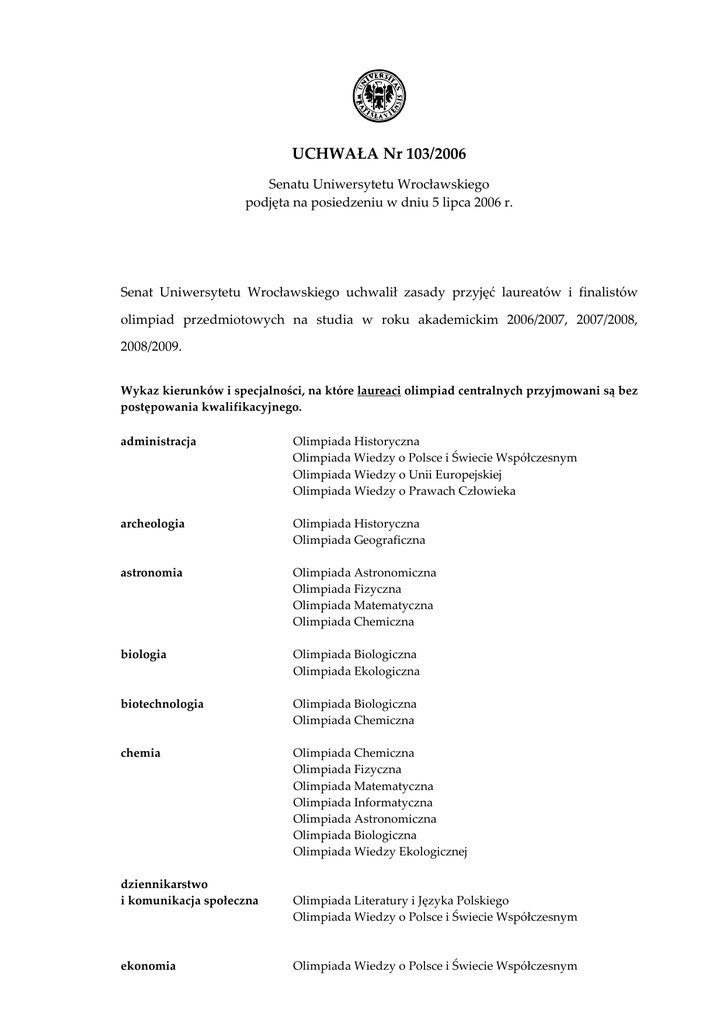 UCHWAŁA Nr 103/2006 Senatu Uniwersytetu Wrocławskiego podjęta na posiedzeniu w dniu 5 lipca 2006 r. Senat Uniwersytetu Wrocławskiego uchwalił zasady przyjęć laureatów i finalistów olimpiad przedmiotowych na studia w roku akademickim 2006/2007, 2007/2008, 2008/2009. Wykaz kierunków i specjalności, na które laureaci olimpiad centralnych przyjmowani są bez postępowania kwalifikacyjnego. administracja Olimpiada Historyczna Olimpiada Wiedzy o Polsce i Świecie Współczesnym Olimpiada Wiedzy o Unii Europejskiej Olimpiada Wiedzy o Prawach Człowieka archeologia Olimpiada Historyczna Olimpiada Geograficzna astronomia Olimpiada Astronomiczna Olimpiada Fizyczna Olimpiada Matematyczna Olimpiada Chemiczna biologia Olimpiada Biologiczna Olimpiada Ekologiczna biotechnologia Olimpiada Biologiczna Olimpiada Chemiczna chemia Olimpiada Chemiczna Olimpiada Fizyczna Olimpiada Matematyczna Olimpiada Informatyczna Olimpiada Astronomiczna Olimpiada Biologiczna Olimpiada Wiedzy Ekologicznej dziennikarstwo i komunikacja społeczna ekonomia Olimpiada Literatury i Języka Polskiego Olimpiada Wiedzy o Polsce i Świecie Współczesnym Olimpiada Wiedzy o Polsce i Świecie Współczesnym Olimpiada Matematyczna Olimpiada Informatyczna Olimpiada Wiedzy Ekonomicznej Olimpiada Wiedzy o Unii Europejskiej europeistyka Olimpiada Historyczna Olimpiada Wiedzy o Polsce i Świecie Współczesnym Olimpiada Wiedzy o Unii Europejskiej filologia angielska Olimpiada Języka Angielskiego filologia germańska Olimpiada Języka Niemieckiego Olimpiada Literatury i Języka Polskiego filologia klasyczna Olimpiada Języka Łacińskiego Olimpiada Literatury i Języka Polskiego Olimpiada Historyczna filologia klasyczna i kultura śródziemnomorska Olimpiada Języka Łacińskiego Olimpiada Literatury i Języka Polskiego Olimpiada Historyczna filologia niderlandzka Olimpiada Języka Angielskiego Olimpiada Języka Niemieckiego Olimpiada Literatury i Języka Polskiego filologia polska Olimpiada Literatury i Języka Polskiego filologia romańska profil francuski Olimpiada Języka Francuskiego filologia słowiańska Olimpiada Języka Rosyjskiego Olimpiada Języka Niemieckiego Olimpiada Języka Angielskiego filozofia Olimpiada Filozoficzna Olimpiada Artystyczna Olimpiada Astronomiczna Olimpiada Biologiczna Olimpiada Chemiczna Olimpiada Fizyczna Olimpiada Geograficzna Olimpiada Historyczna Olimpiada Informatyczna Olimpiada Literatury i Języka Polskiego Olimpiada Matematyczna Olimpiada Wiedzy Ekonomicznej Olimpiada Wiedzy o Polsce i Świecie Współczesnym Olimpiada Wiedzy o Prawach Człowieka fizyka Olimpiada Astronomiczna Olimpiada Fizyczna Olimpiada Matematyczna Olimpiada Chemiczna geografia Olimpiada Geograficzna Olimpiada Nautologiczna geologia Olimpiada Geograficzna Olimpiada Biologiczna Olimpiada Fizyczna Olimpiada Chemiczna Olimpiada Matematyczna Olimpiada Wiedzy Ekologicznej historia Olimpiada Historyczna Olimpiada o Polsce i Świecie Współczesnym Olimpiada Wiedzy Parlamentarnej historia sztuki Olimpiada Artystyczna (sekcja plastyki) informacja naukowa i bibliotekoznawstwo Olimpiada Filozoficzna Olimpiada Historyczna Olimpiada Informatyczna Olimpiada Literatury i Języka Polskiego informatyka Olimpiada Matematyczna Olimpiada Informatyczna Olimpiada Fizyczna matematyka Olimpiada Matematyczna Olimpiada Informatyczna Olimpiada Fizyczna Olimpiada Chemiczna Olimpiada Astronomiczna międzywydziałowe indywidualne studia humanistyczne Olimpiada Historyczna Olimpiada Filozoficzna Olimpiada Literatury i Języka Polskiego Olimpiada Języka Angielskiego Olimpiada Języka Francuskiego Olimpiada Języka Rosyjskiego Olimpiada Języka Niemieckiego Olimpiada Języka Łacińskiego Olimpiada Wiedzy o Polsce i Świecie Współczesnym Olimpiada Wiedzy o Unii Europejskiej ochrona środowiska Olimpiada Ekologiczna Olimpiada Biologiczna Olimpiada Geograficzna Olimpiada Chemiczna Olimpiada Fizyczna pedagogika Olimpiada Literatury i Języka Polskiego Olimpiada Historyczna Olimpiada Biologiczna politologia Olimpiada Historyczna Olimpiada Wiedzy o Polsce i Świecie Współczesnym Olimpiada Wiedzy o Unii Europejskiej prawo Olimpiada Historyczna Olimpiada Wiedzy o Polsce i Świecie Współczesnym Olimpiada Wiedzy o Unii Europejskiej Olimpiada Wiedzy o Prawach Człowieka socjologia Olimpiada Wiedzy o Polsce i Świecie Współczesnym stosunki międzynarodowe Olimpiada Historyczna Olimpiada Wiedzy o Polsce i Świecie Współczesnym Olimpiada Wiedzy o Unii Europejskiej Wykaz kierunków i specjalności, na które finaliści olimpiad centralnych przyjmowani są bez postępowania kwalifikacyjnego. administracja Olimpiada Historyczna Olimpiada Wiedzy o Polsce i Świecie Współczesnym Olimpiada Wiedzy o Unii Europejskiej Olimpiada Wiedzy o Prawach Człowieka astronomia Olimpiada Astronomiczna Olimpiada Fizyczna Olimpiada Matematyczna Olimpiada Chemiczna biologia Olimpiada Biologiczna Olimpiada Ekologiczna biotechnologia Olimpiada Biologiczna Olimpiada Chemiczna chemia Olimpiada Chemiczna Olimpiada Fizyczna Olimpiada Matematyczna Olimpiada Informatyczna Olimpiada Astronomiczna Olimpiada Biologiczna Olimpiada Wiedzy Ekologicznej dziennikarstwo i komunikacja społeczna ekonomia Olimpiada Literatury i Języka Polskiego Olimpiada Wiedzy o Polsce i Świecie Współczesnym Olimpiada Wiedzy o Polsce i Świecie Współczesnym Olimpiada Matematyczna Olimpiada Informatyczna Olimpiada Wiedzy Ekonomicznej Olimpiada Wiedzy o Unii Europejskiej filologia klasyczna Olimpiada Języka Łacińskiego Olimpiada Literatury i Języka Polskiego Olimpiada Historyczna filologia klasyczna i kultura śródziemnomorska Olimpiada Języka Łacińskiego Olimpiada Literatury i Języka Polskiego Olimpiada Historyczna filologia polska Olimpiada Literatury i Języka Polskiego filologia romańska profil francuski Olimpiada Języka Francuskiego filologia słowiańska Olimpiada Języka Rosyjskiego Olimpiada Języka Niemieckiego Olimpiada Języka Angielskiego filozofia Olimpiada Filozoficzna fizyka Ol