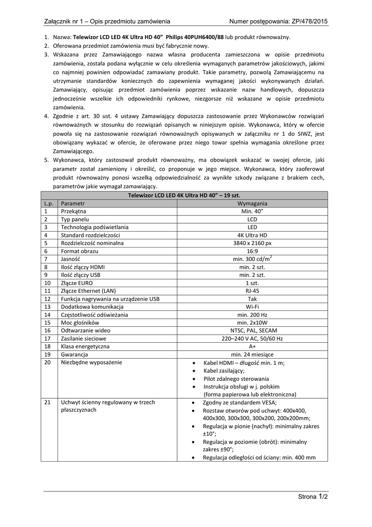 Załącznik nr 1 – Opis przedmiotu zamówienia Numer postępowania: ZP/478/2015 1. Nazwa: Telewizor LCD LED 4K Ultra HD 40” Philips 40PUH6400/88 lub produkt równoważny. 2. Oferowana przedmiot zamówienia musi być fabrycznie nowy. 3. Wskazana przez Zamawiającego nazwa własna producenta zamieszczona w opisie przedmiotu zamówienia, została podana wyłącznie w celu określenia wymaganych parametrów jakościowych, jakimi co najmniej powinien odpowiadać zamawiany produkt. Takie parametry, pozwolą Zamawiającemu na utrzymanie standardów koniecznych do zapewnienia wymaganej jakości wykonywanych działań. Zamawiający, opisując przedmiot zamówienia poprzez wskazanie nazw handlowych, dopuszcza jednocześnie wszelkie ich odpowiedniki rynkowe, niezgorsze niż wskazane w opisie przedmiotu zamówienia. 4. Zgodnie z art. 30 ust. 4 ustawy Zamawiający dopuszcza zastosowanie przez Wykonawców rozwiązań równoważnych w stosunku do rozwiązań opisanych w niniejszym opisie. Wykonawca, który w ofercie powoła się na zastosowanie rozwiązań równoważnych opisywanych w załączniku nr 1 do SIWZ, jest obowiązany wykazać w ofercie, że oferowane przez niego towar spełnia wymagania określone przez Zamawiającego. 5. Wykonawca, który zastosował produkt równoważny, ma obowiązek wskazać w swojej ofercie, jaki parametr został zamieniony i określić, co proponuje w jego miejsce. Wykonawca, który zaoferował produkt równoważny ponosi wszelką odpowiedzialność za wynikłe szkody związane z brakiem cech, parametrów jakie wymagał zamawiający. Telewizor LCD LED 4K Ultra HD 40” – 19 szt. L.p. Parametr Wymagania 1 Przekątna Min. 40” 2 Typ panelu LCD 3 Technologia podświetlania LED 4 Standard rozdzielczości 4K Ultra HD 5 Rozdzielczość nominalna 3840 x 2160 px 6 Format obrazu 16:9 2 7 Jasność min. 300 cd/m 8 Ilość złączy HDMI min. 2 szt. 9 Ilość złączy USB min. 2 szt. 10 Złącze EURO 1 szt. 11 Złącze Ethernet (LAN) RJ‐45 12 Funkcja nagrywania na urządzenie USB Tak 13 Dodatkowa komunikacja Wi‐Fi 14 Częstotliwość odświeżania min. 200 Hz 15 Moc głośników min. 2x10W 16 Odtwarzanie wideo NTSC, PAL, SECAM 17 Zasilanie sieciowe 220–240 V AC, 50/60 Hz 18 Klasa energetyczna A+ 19 Gwarancja min. 24 miesiące 20 Niezbędne wyposażenie • Kabel HDMI – długość min. 1 m; • Kabel zasilający; • Pilot zdalnego sterowania • Instrukcja obsługi w j. polskim (forma papierowa lub elektroniczna) 21 Uchwyt ścienny regulowany w trzech • Zgodny ze standardem VESA; płaszczyznach • Rozstaw otworów pod uchwyt: 400x400, 400x300, 300x300, 300x200, 200x200mm; • Regulacja w pionie (nachył): minimalny zakres ±10°; • Regulacja w poziomie (obrót): minimalny zakres ±90°; • Regulacja odległości od ściany: min. 400 mm Strona 1/2 Załącznik nr 1 – Opis przedmiotu zamówienia Numer postępowania: ZP/478/2015 1. Nazwa: Telewizor LCD LED 4K Ultra HD 65” Samsung UE65JU6400 lub produkt równoważny. 2. Oferowana przedmiot zamówienia musi być fabrycznie nowy. 3. Wskazana przez Zamawiającego nazwa własna producenta zamieszczona w opisie przedmiotu zamówienia, została podana wyłącznie w celu określenia wymaganych parametrów jakościowych, jakimi co najmniej powinien odpowiadać zamawiany produkt. Takie parametry, pozwolą Zamawiającemu na utrzymanie standardów koniecznych do zapewnienia wymaganej jakości wykonywanych działań. Zamawiający, opisując przedmiot zamówienia poprzez wskazanie nazw handlowych, dopuszcza jednocześnie wszelkie ich odpowiedniki rynkowe, niezgorsze niż wskazane w opisie przedmiotu zamówienia. 4. Zgodnie z art. 30 ust. 4 ustawy Zamawiający dopuszcza zastosowanie przez Wykonawców rozwiązań równoważnych w stosunku do rozwiązań opisanych w niniejszym opisie. Wykonawca, który w ofercie powoła się na zastosowanie rozwiązań równoważnych opisywanych w załączniku nr 1 do SIWZ, jest obowiązany wykazać w ofercie, że oferowane przez niego towar spełnia wymagania określone przez Zamawiającego. 5. Wykonawca, który zastosował produkt równoważny, ma obowiązek wskazać w swojej ofercie, jaki parametr został zamieniony i określić, co proponuje w jego miejsce. Wykonawca, który zaoferował produkt równoważny ponosi wszelką odpowiedzialność za wynikłe szkody związane z brakiem cech, parametrów jakie wymagał zamawiający. Telewizor LCD LED 4K Ultra HD 65” – 1 szt. L.p. Parametr Wymagania 1 Przekątna Min. 65” 2 Typ panelu LCD 3 Technologia podświetlania LED 4 Standard rozdzielczości 4K Ultra HD 5 Rozdzielczość nominalna 3840 x 2160 px 6 Format obrazu 16:9 7 8 Ilość złączy HDMI min. 3 szt. 9 Ilość złączy USB min. 2 szt. 10 Złącze EURO 1 szt. 11 Złącze Ethernet (LAN) RJ‐45 12 Funkcja nagrywania na urządzenie USB Tak 13 Dodatkowa komunikacja Wi‐Fi 14 Częstotliwość odświeżania Min. 800 Hz 15 Moc głośników min. 2x20W 16 Odtwarzanie wideo NTSC, PAL, SECAM 17 Zasilanie sieciowe 220–240 V AC, 50/60 Hz 18 Klasa energetyczna A+ 19 Gwarancja min. 24 miesiące 20 Niezbędne wyposażenie • Kabel HDMI – długość min. 1 m; • Kabel zasilający; • Pilot zdalnego sterowania • Instrukcja obsługi w j. polskim (forma papierowa lub elektroniczna) 21 Uchwyt ścienny regulowany w trzech • Zgodny ze standardem VESA; płaszczyznach • Rozstaw otworów pod uchwyt: 600x400, 400x400, 400x300, 300x300, 300x200, 200x200mm; • Regulacja w pionie (nachył): minimalny zakres ±10°; • Regulacja w poziomie (obrót): minimalny zakres ±90°; • Regulacja odległości od ściany: min. 500 mm Strona 2/2