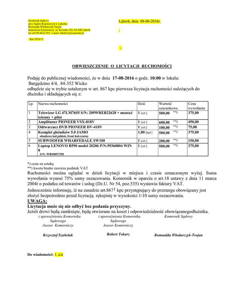 Komornik Sądowy przy Sądzie Rejonowym w Lęborku Romualda Włodarczyk-Trojan Kancelaria Komornicza ul. Kossaka 102, 84-300 Lębork tel. (0-59) 8622-915 e-mail: [email protected] Lębork, dnia 08-06-2016r. . Km 2928/15 - OBWIESZCZENIE O LICYTACJI RUCHOMOŚCI Podaję do publicznej wiadomości, że w dniu 17-08-2016 o godz. 10:00 w lokalu: Bargędzino 4/4, 84-352 Wicko odbędzie się w trybie ustalonym w art. 867 kpc pierwsza licytacja ruchomości należących do dłużnika i składających się z: Lp. Nazwa ruchomości Ilość 1 Telewizor LG 47LM7655 S/N: 209WREB22628 + montaż ścienny + pilot Amplituner PIONEER VSX-818V Odtwarzacz DVD PIONEER DV-410V Komplet głośników 5.0 JAMO 2 3 4 1 [szt.] Wartość szacunkowa 500,00 **) Cena wywołania 375,00 1 [szt.] 1 [szt.] 1,00 [kpl.] 600,00 **) 100,00 **) 500,00 **) 450,00 75,00 375,00 1 [szt.] 1 [szt.] 200,00 **) 500,00 **) 150,00 375,00 . obudowa kol.jabłoń, front kol.czarny 5 6 SUBWOOFER WHARFEDALE SW100 Laptop LENOVO B590 model 20206 P/N:59360004 WIN 8 . S/N: WB10057350 *) cena za sztukę **) kwota brutto zawiera podatek VAT Ruchomości można oglądać w dzień licytacji w miejscu i czasie oznaczonym wyżej. Suma wywołania wynosi 75% sumy oszacowania. Komornik w oparciu o art.18 ustawy z dnia 11 marca 2004r o podatku od towarów i usług (Dz.U. Nr 54, poz.535) wystawia faktury VAT. Jednocześnie informuję, iż na zasadzie art.8671 kpc przystępujący do przetargu obowiązany jest złożyć bezpośrednio przed licytacją rękojmię w wysokości 1/10 sumy oszacowania. UWAGA: Licytacja może się nie odbyć bez podania przyczyny. Jeżeli drzwi będą zamknięte, będą otwierane na koszt i odpowiedzialność obowiązanegodłużnika. z upoważnienia Komornika Sądowego Asesor Komorniczy Krzysztof Szubelak Do wiadomości: 1. a/a z upoważnienia Komornika Sądowego Asesor Komorniczy Komornik Sądowy Robert Tokarz Romualda Włodarczyk-Trojan