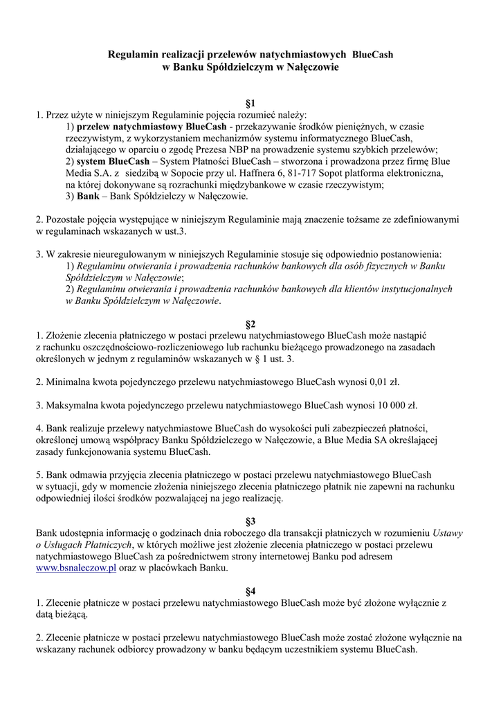 Regulamin realizacji przelewów natychmiastowych BlueCash w Banku Spółdzielczym w Nałęczowie §1 1. Przez użyte w niniejszym Regulaminie pojęcia rozumieć należy: 1) przelew natychmiastowy BlueCash - przekazywanie środków pieniężnych, w czasie rzeczywistym, z wykorzystaniem mechanizmów systemu informatycznego BlueCash, działającego w oparciu o zgodę Prezesa NBP na prowadzenie systemu szybkich przelewów; 2) system BlueCash – System Płatności BlueCash – stworzona i prowadzona przez firmę Blue Media S.A. z siedzibą w Sopocie przy ul. Haffnera 6, 81-717 Sopot platforma elektroniczna, na której dokonywane są rozrachunki międzybankowe w czasie rzeczywistym; 3) Bank – Bank Spółdzielczy w Nałęczowie. 2. Pozostałe pojęcia występujące w niniejszym Regulaminie mają znaczenie tożsame ze zdefiniowanymi w regulaminach wskazanych w ust.3. 3. W zakresie nieuregulowanym w niniejszych Regulaminie stosuje się odpowiednio postanowienia: 1) Regulaminu otwierania i prowadzenia rachunków bankowych dla osób fizycznych w Banku Spółdzielczym w Nałęczowie; 2) Regulaminu otwierania i prowadzenia rachunków bankowych dla klientów instytucjonalnych w Banku Spółdzielczym w Nałęczowie. §2 1. Złożenie zlecenia płatniczego w postaci przelewu natychmiastowego BlueCash może nastąpić z rachunku oszczędnościowo-rozliczeniowego lub rachunku bieżącego prowadzonego na zasadach określonych w jednym z regulaminów wskazanych w § 1 ust. 3. 2. Minimalna kwota pojedynczego przelewu natychmiastowego BlueCash wynosi 0,01 zł. 3. Maksymalna kwota pojedynczego przelewu natychmiastowego BlueCash wynosi 10 000 zł. 4. Bank realizuje przelewy natychmiastowe BlueCash do wysokości puli zabezpieczeń płatności, określonej umową współpracy Banku Spółdzielczego w Nałęczowie, a Blue Media SA określającej zasady funkcjonowania systemu BlueCash. 5. Bank odmawia przyjęcia zlecenia płatniczego w postaci przelewu natychmiastowego BlueCash w sytuacji, gdy w momencie złożenia niniejszego zlecenia płatniczego płatnik nie zapewni na rachunku odpowiedniej ilości środków pozwalającej na jego realizację. §3 Bank udostępnia informację o godzinach dnia roboczego dla transakcji płatniczych w rozumieniu Ustawy o Usługach Płatniczych, w których możliwe jest złożenie zlecenia płatniczego w postaci przelewu natychmiastowego BlueCash za pośrednictwem strony internetowej Banku pod adresem www.bsnaleczow.pl oraz w placówkach Banku. §4 1. Zlecenie płatnicze w postaci przelewu natychmiastowego BlueCash może być złożone wyłącznie z datą bieżącą. 2. Zlecenie płatnicze w postaci przelewu natychmiastowego BlueCash może zostać złożone wyłącznie na wskazany rachunek odbiorcy prowadzony w banku będącym uczestnikiem systemu BlueCash. 3. Bank obciąża rachunek płatnika kwotą wskazaną przez płatnika podczas składania zlecenia płatniczego w postaci przelewu natychmiastowego BlueCash oraz należną Bankowi opłatą z tytułu realizacji przelewu natychmiastowego BlueCash w wysokości określonej w Tabeli opłat i prowizji bankowych Banku Spółdzielczego w Nałęczowie dla klientów indywidualnych lub Tabeli opłat i prowizji bankowych Banku Spółdzielczego w Nałęczowie dla klientów instytucjonalnych i osób fizycznych prowadzących działalność gospodarczą, w momencie przyjęcia przez Bank niniejszego zlecenia płatniczego. §5 Bank powiadamia Płatnika o odmowie przyjęcia zlecenia płatniczego w postaci przelewu natychmiastowego BlueCash: 1) w formie komunikatu - w przypadku zlecenia płatniczego składanego za pośrednictwem usługi Internet Banking; 2) w formie ustnej - w przypadku zlecenia płatniczego składanego w placówce Banku. §6 Informacja dotycząca zasad przeprowadzania przez BlueMedia SA rozrachunków międzybankowych w systemie BlueCash oraz informacja o bankach będących uczestnikami systemu BlueCash zawarta jest na stronie internetowej BlueMedia SA pod adresem www.bluemedia.pl. Regulamin obowiązuje od 20.02. 2014 r.