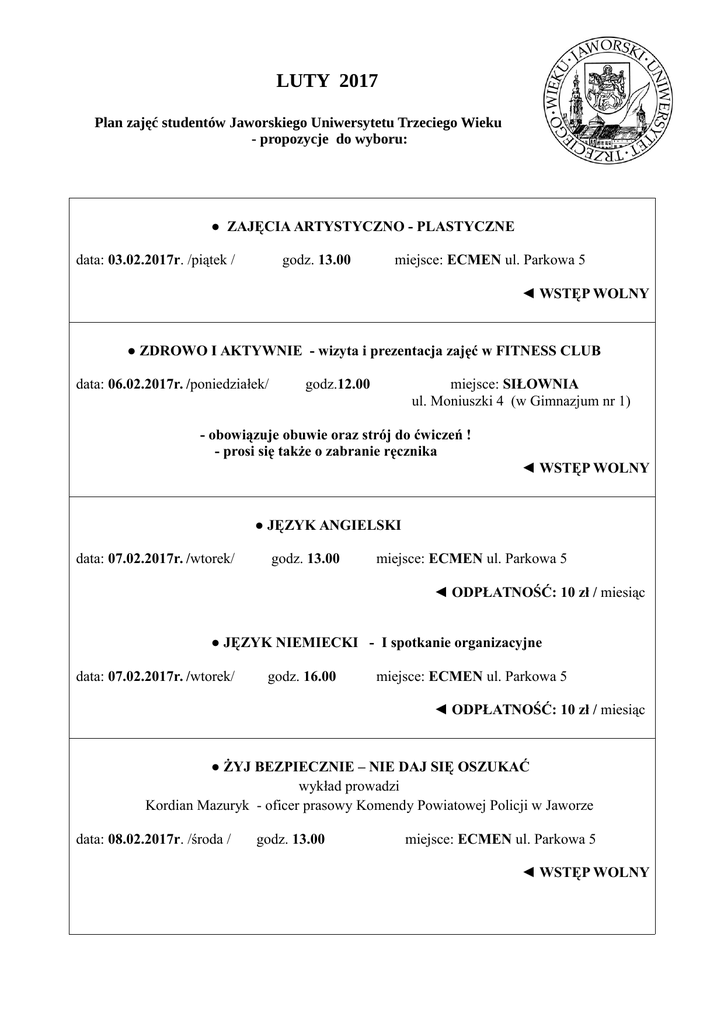 LUTY 2017 Plan zajęć studentów Jaworskiego Uniwersytetu Trzeciego Wieku - propozycje do wyboru: ● ZAJĘCIA ARTYSTYCZNO - PLASTYCZNE data: 03.02.2017r. /piątek / godz. 13.00 miejsce: ECMEN ul. Parkowa 5 ◄ WSTĘP WOLNY ● ZDROWO I AKTYWNIE - wizyta i prezentacja zajęć w FITNESS CLUB data: 06.02.2017r. /poniedziałek/ godz.12.00 miejsce: SIŁOWNIA ul. Moniuszki 4 (w Gimnazjum nr 1) - obowiązuje obuwie oraz strój do ćwiczeń ! - prosi się także o zabranie ręcznika ◄ WSTĘP WOLNY ● JĘZYK ANGIELSKI data: 07.02.2017r. /wtorek/ godz. 13.00 miejsce: ECMEN ul. Parkowa 5 ◄ ODPŁATNOŚĆ: 10 zł / miesiąc ● JĘZYK NIEMIECKI - I spotkanie organizacyjne data: 07.02.2017r. /wtorek/ godz. 16.00 miejsce: ECMEN ul. Parkowa 5 ◄ ODPŁATNOŚĆ: 10 zł / miesiąc ● ŻYJ BEZPIECZNIE – NIE DAJ SIĘ OSZUKAĆ wykład prowadzi Kordian Mazuryk - oficer prasowy Komendy Powiatowej Policji w Jaworze data: 08.02.2017r. /środa / godz. 13.00 miejsce: ECMEN ul. Parkowa 5 ◄ WSTĘP WOLNY ● "ISLANDIA CZY KORSYKA? - wybór należy do Ciebie" spotkanie podróżnicze data: 09.02.2017r. /czwartek / godz. 16.00 miejsce: MIEJSKA BIBLIOTEKA PUBLICZNA ul. pl. Seniora 4 ◄ WSTĘP WOLNY ● EDUKACJA FILMOWA – pokaz filmu nominowanego do Oskara data: 10.02.2017r. /piątek / godz. 13.00 miejsce: ECMEN ul. Parkowa 5 ◄ WSTĘP WOLNY ● JĘZYK ANGIELSKI data: 14.02.2017r. /wtorek/ godz. 13.00 miejsce: ECMEN ul. Parkowa 5 ● JĘZYK NIEMIECKI data: 14.02.2017r. /wtorek/ godz. 16.00 miejsce: ECMEN ul. Parkowa 5 ● "POZNAJEMY REGION" " Skarb z Paszowic i starożytni metalurdzy" data: 16.02.2017r. /czwartek / godz. 17.00 miejsce:MUZEUM REGIONALNE ul. Klasztorna 6 ◄ WSTĘP WOLNY ● JĘZYK ANGIELSKI data: 21.02.2017r. /wtorek/ godz. 13.00 miejsce: ECMEN ul. Parkowa 5 ● ZUMBA W RYTMACH LATINO zajęcia prowadzi instruktor - Iza Kowalska data: 23.02.2017r. / czwartek/ godz. 13.00 miejsce: ECMEN ul. Parkowa 5 - prosi się o zabranie wygodnego obuwia oraz stroju do ćwiczeń ! ◄ WSTĘP WOLNY ● WIZYTA W TĘŻNI SOLANKOWEJ data: 27.02.2017r. /poniedziałek/ godz. 10.00 godz. 10.00-14.00 miejsce: Pływalnia SŁOWIANKA ul. Rogatki 1 godz. 11.00 godz. 12.00 godz. 13.00 godz. 14.00 UWAGA! - wcześniej należy zapisać się na odpowiednią godzinę pod tel. 76/ 870 71 41 - należy zabrać ze sobą obuwie zmienne ( np. klapki ) oraz wygodny strój ◄ WSTĘP WOLNY ● JĘZYK ANGIELSKI data: 28.02.2017r. /wtorek/ godz. 13.00 miejsce: ECMEN ul. Parkowa 5 ● JĘZYK NIEMIECKI data: 28.02.2017r. /wtorek/ godz. 16.00 miejsce: ECMEN ul. Parkowa 5