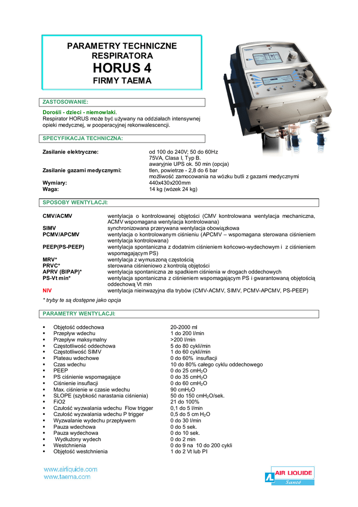 PARAMETRY TECHNICZNE RESPIRATORA HORUS 4 FIRMY TAEMA ZASTOSOWANIE: Dorośli - dzieci - niemowlaki. Respirator HORUS może być używany na oddziałach intensywnej opieki medycznej, w pooperacyjnej rekonwalescencji. SPECYFIKACJA TECHNICZNA: Zasilanie elektryczne: Zasilanie gazami medycznymi: Wymiary: Waga: od 100 do 240V; 50 do 60Hz 75VA, Clasa I, Typ B. awaryjnie UPS ok. 50 min (opcja) tlen, powietrze - 2,8 do 6 bar możliwość zamocowania na wózku butli z gazami medycznymi 440x430x200mm 14 kg (wózek 24 kg) SPOSOBY WENTYLACJI: CMV/ACMV SIMV PCMV/APCMV PEEP(PS-PEEP) MRV* PRVC* APRV (BIPAP)* PS-Vt min* NIV wentylacja o kontrolowanej objętości (CMV kontrolowana wentylacja mechaniczna, ACMV wspomagana wentylacja kontrolowana) synchronizowana przerywana wentylacja obowiązkowa wentylacja o kontrolowanym ciśnieniu (APCMV – wspomagana sterowana ciśnieniem wentylacja kontrolowana) wentylacja spontaniczna z dodatnim ciśnieniem końcowo-wydechowym i z ciśnieniem wspomagającym PS) wentylacja z wymuszoną częstością sterowana ciśnieniowo z kontrolą objętości wentylacja spontaniczna ze spadkiem ciśnienia w drogach oddechowych wentylacja spontaniczna z ciśnieniem wspomagającym PS i gwarantowaną objętością oddechową Vt min wentylacja nieinwazyjna dla trybów (CMV-ACMV, SIMV, PCMV-APCMV, PS-PEEP) * tryby te są dostępne jako opcja PARAMETRY WENTYLACJI: Objętość oddechowa Przepływ wdechu Przepływ maksymalny Częstotliwość oddechowa Częstotliwość SIMV Plateau wdechowe Czas wdechu PEEP PS ciśnienie wspomagające Ciśnienie insuflacji Max. ciśnienie w czasie wdechu SLOPE (szybkość narastania ciśnienia) FiO2 Czułość wyzwalania wdechu Flow trigger Czułość wyzwalania wdechu P trigger Wyzwalanie wydechu przepływem Pauza wdechowa Pauza wydechowa Wydłużony wydech Westchnienia Objętość westchnienia 20-2000 ml 1 do 200 l/min >200 l/min 5 do 80 cykli/min 1 do 60 cykli/min 0 do 60% insuflacji 10 do 80% całego cyklu oddechowego 0 do 25 cmH2O 0 do 35 cmH2O 0 do 60 cmH2O 90 cmH2O 50 do 150 cmH2O/sek. 21 do 100% 0,1 do 5 l/min 0,5 do 5 cm H2O 0 do 30 l/min 0 do 5 sek. 0 do 10 sek. 0 do 2 min 0 do 9 na 10 do 200 cykli 1 do 2 Vt lub PI MONITOROWANIE: 1) Na ekranie pomiarowym: Objętość pojedynczego wydechu Wentylacja minutowa Objętość minutowa spontaniczna Ciśnienie szczytowe Ciśnienie średnie Fi02 Ciśnienie Plateau Rzeczywisty stosunek I:E PEEP Auto PEEP Podatność statyczna Oporność statyczna Historia alarmów do 2000 zdarzeń VTexp V SpontVe ml Pimax ml l/min cmH2O cmH2O % Ppletau cmH2O cmH2O 2) Wyżej wymienione parametry mogą być prezentowane w postaci przebiegów w czasie rzeczywistym z pamięcią do 68 godzin.. 3) Ponadto, respirator umożliwia obserwację następujących pętli V(Q) (objętość/przepływ), V(P) (objętość/ciśnienie), Q(P) (przepływ/ciśnienie). Istnieje także możliwość ,,zamrożenia’’ ekranu z przebiegiem i dokonanie pomiarów przy pomocy kursorów pomiarowych, co pozwala na wyznaczenie np. lokalizacji i pochodzenia rezystancji wydechowej, pomiar podatności dynamicznej, pomiar PODATNOŚCI QUASI-STATYCZNEJ ALARMY: Pmax Vt min/max – objętość jednego oddechu V min/max – wentylacja minutowa Fmin/max – częstość oddechów FiO2 min/max Wentylacja w bezdechu Rozłączenie pacjenta Awaria zasilania: energia / gazy INNE FUNKCJE: Nebulizator (opcja) Możliwość używania ssaka w obwodzie bez odłączenia pacjenta Automatyczna kontrola i kalibracja Low insufflation flow (pomiar krzywych ciśnienia - objętości) KOLOROWY MONITOR: Kolorowy 10,4” ekran dotykowy Możliwość prezentacji: dwóch krzywych dynamicznych, 10 ustawionych 15 aktualnie mierzonych parametrów wentylacji. Krzywe (w czasie): przepływ(t), ciśnienie(t), objętość(t), ciśnienie zew.(t) Pętle: V(Q), Q(P), V(P), Q(Pzew), V(Pzew), możliwość wyświetlenia 4 pętli Możliwość dokładnego wyznaczenia z krzywej objętości/ciśnienia dolnego i górnego punktu załamania FiO2 21 – 100% Parametry mierzone: Vexp, Vinspi, Vtinsp, Vtexp, F, Pmax, Pśr, PEEP, Ti/Ttot, Plateau, AutoPEEP, , oporność stat., podatność stat., FiO2, Indeks przecieków %, praca oddychania W, Trendy: wszystkie parametry 96 godzin ( 4 dni ) Historia alarmów 4000 zdarzeń Pamięć krzywych dynamicznych: 24 godziny Pamięć pętli: 30 pętli Możliwość podłączenia drukarki. DIAGNOS Sp. z o.o. ul. Łączyny 4; 02 – 820 Warszawa tel.: (022) 331-05-03 do 04; fax: (022) 331-05-00 [email protected], http://www.diagnos.pl