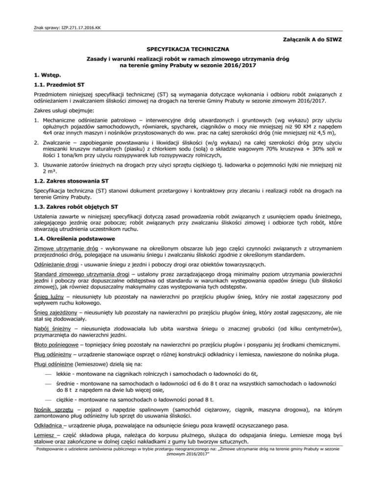 Znak sprawy: IZP.271.17.2016.KK Załącznik A do SIWZ SPECYFIKACJA TECHNICZNA Zasady i warunki realizacji robót w ramach zimowego utrzymania dróg na terenie gminy Prabuty w sezonie 2016/2017 1. Wstęp. 1.1. Przedmiot ST Przedmiotem niniejszej specyfikacji technicznej (ST) są wymagania dotyczące wykonania i odbioru robót związanych z odśnieżaniem i zwalczaniem śliskości zimowej na drogach na terenie Gminy Prabuty w sezonie zimowym 2016/2017. Zakres usługi obejmuje: 1. Mechaniczne odśnieżanie patrolowo – interwencyjne dróg utwardzonych i gruntowych (wg wykazu) przy użyciu opłużnych pojazdów samochodowych, równiarek, spycharek, ciągników o mocy nie mniejszej niż 90 KM z napędem 4x4 oraz innych maszyn i nośników przystosowanych do ww. prac na całej szerokości dróg (nie mniejszej niż 4,5 m), 2. Zwalczanie – zapobieganie powstawaniu i likwidacji śliskości (w/g wykazu) na całej szerokości dróg przy użyciu mieszanki kruszyw naturalnych (piasku) z chlorkiem sodu (solą) o składzie wagowym 70% kruszywa + 30% soli w ilości 1 tona/km przy użyciu rozsypywarek lub rozsypywaczy rolniczych, 3. Usuwanie zatorów śnieżnych na drogach przy użyci sprzętu ciężkiego tj. ładowarka o pojemności łyżki nie mniejszej niż 2 m³. 1.2. Zakres stosowania ST Specyfikacja techniczna (ST) stanowi dokument przetargowy i kontraktowy przy zlecaniu i realizacji robót na drogach na terenie Gminy Prabuty. 1.3. Zakres robót objętych ST Ustalenia zawarte w niniejszej specyfikacji dotyczą zasad prowadzenia robót związanych z usunięciem opadu śnieżnego, zalegającego jezdnię oraz pobocze; robót związanych przy zwalczaniu śliskości zimowej i odbiorze tych robót, które stwarzają utrudnienia uczestnikom ruchu. 1.4. Określenia podstawowe Zimowe utrzymanie dróg - wykonywane na określonym obszarze lub jego części czynności związanych z utrzymaniem przejezdności dróg, polegające na usuwaniu śniegu i zwalczaniu śliskości zgodnie z określonym standardem. Odśnieżanie drogi - usuwanie śniegu z jezdni i poboczy drogi oraz obiektów towarzyszących. Standard zimowego utrzymania drogi – ustalony przez zarządzającego drogą minimalny poziom utrzymania powierzchni jezdni i poboczy oraz dopuszczalne odstępstwa od standardu w warunkach występowania opadów śniegu (lub śliskości zimowej), jak również dopuszczalny maksymalny czas występowania tych odstępstw. Śnieg luźny – nieusunięty lub pozostały na nawierzchni po przejściu pługów śnieg, który nie został zagęszczony pod wpływem ruchu kołowego. Śnieg zajeżdżony – nieusunięty lub pozostały na nawierzchni po przejściu pługów śnieg, który został zagęszczony, ale nie stał się zlodowaciały. Nabój śnieżny – nieusunięta zlodowaciała lub ubita warstwa śniegu o znacznej grubości (od kilku centymetrów), przymarznięta do nawierzchni jezdni. Błoto pośniegowe – topniejący śnieg pozostały na nawierzchni po przejściu pługów i posypaniu jej środkami chemicznymi. Pług odśnieżny – urządzenie stanowiące osprzęt o różnej konstrukcji odkładnicy i lemiesza, nawieszone do nośnika pługa. Pługi odśnieżne (lemieszowe) dzielą się na: lekkie - montowane na ciągnikach rolniczych i samochodach o ładowności do 6t, średnie - montowane na samochodach o ładowności od 6 do 8 t oraz na wszystkich samochodach o ładowności do 8 t z napędem na dwie lub więcej osie, ciężkie - montowane na samochodach o ładowności ponad 8 t. Nośnik sprzętu – pojazd o napędzie spalinowym (samochód ciężarowy, ciągnik, maszyna drogowa), na którym zamontowano pług odśnieżny lub sprzęt do usuwania śliskości. Odkładnica – urządzenie pługa, pozwalające na odsunięcie śniegu poza krawędź oczyszczanego pasa. Lemiesz – część składowa pługa, należąca do korpusu płużnego, służąca do odspajania śniegu. Lemiesze mogą byś stalowe oraz zakończone w dolnej części nakładkami z gumy lub tworzyw sztucznych. Postępowanie o udzielenie zamówienia publicznego w trybie przetargu nieograniczonego na: „Zimowe utrzymanie dróg na terenie gminy Prabuty w sezonie zimowym 2016/2017” Znak sprawy: IZP.271.17.2016.KK Czołownica – płyta czołowa, stanowiąca element łączący odkładnicę i lemiesz pługa z ramą nośnika pługa. Odśnieżarka – urządzenie montowane zwykle na nośniku, napędzane silnikiem spalinowym, służące do odspajania i odrzutu śniegu na odległość ok. 6 -60 m poza obręb drogi, za pomocą odpowiednio skonstruowanych mechanizmów. Odśnieżarki dzielą się na: ślimakowo-wirnikowe, frezowo-wirnikowe, frezowo-bębnowe, turbinowe, lemieszowo-wirnikowe. Odśnieżanie interwencyjne – usuwanie śniegu na wybranych odcinkach drogi z dopuszczeniem pozostawienia na jezdni równomiernej, zjeżdżonej warstwy śniegu oraz dopuszczeniem odśnieżenia w trudnych warunkach atmosferycznych tylko jednego pasa ruchu (z mijankami co 200-300 m). Odśnieżanie uzupełniające – odśnieżanie polegające na usuwaniu zwałów śniegu z poboczy poza koronę drogi, pozostawionych przy odśnieżaniu patrolowym, patrolowo-interwencyjnym i interwencyjnym. Śliskość zimowa – zjawisko występujące na drogach wskutek tworzenia się na jezdniach warstwy lodu albo zlodowaciałego lub ubitego śniegu. Zwalczanie śliskości zimowej – zabiegi mające na celu zapobieganie wystąpieniu śliskości zimowej oraz zabiegi likwidujące powstałą śliskość zimową. Likwidacja śliskości zimowej – usunięcie z nawierzchni drogi lodu lub zlodowaciałego albo ubitego śniegu przy użyciu środków chemicznych, oszorstniających lub mechanicznych albo środków tych łącznie. Uszorstnienie lodu lub zlodowaciałego lub ubitego śniegu – posypanie nawierzchni kruszywem w celu zwiększenia przyczepności kół pojazdu z nawierzchnią. Gołoledź – cienka warstwa lodu grubości do 1mm, powstała na skutek opadu na nawierzchnię o temperaturze ujemn