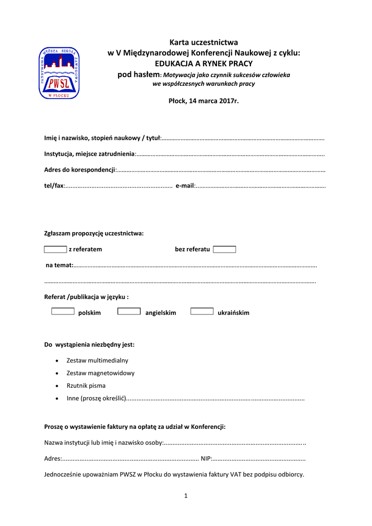 Karta uczestnictwa w V Międzynarodowej Konferencji Naukowej z cyklu: EDUKACJA A RYNEK PRACY pod hasłem: Motywacja jako czynnik sukcesów człowieka we współczesnych warunkach pracy Płock, 14 marca 2017r. Student a praca Imię i nazwisko, stopień naukowy / tytuł:…………………………………………………………………………………………. Instytucja, miejsce zatrudnienia:……………………………………………………………………………………………………….. Adres do korespondencji:…………………………………………………………………………………………………………………… tel/fax:.............................................................. e-mail:...……………………………………………………………………. Zgłaszam propozycję uczestnictwa: z referatem bez referatu na temat:………………………………………………………………………………………………………………………………………. ………………………………………………………………………………………………………………………………………………………. Referat /publikacja w języku : polskim angielskim ukraińskim Do wystąpienia niezbędny jest:  Zestaw multimedialny  Zestaw magnetowidowy  Rzutnik pisma  Inne (proszę określić)....................................................................................................... Proszę o wystawienie faktury na opłatę za udział w Konferencji: Nazwa instytucji lub imię i nazwisko osoby:.................................................................................. Adres:............................................................................... NIP:...................................................... Jednocześnie upoważniam PWSZ w Płocku do wystawienia faktury VAT bez podpisu odbiorcy. 1 Osoby zainteresowane udziałem prosimy o przesłanie wypełnionej Karty Uczestnictwa   pocztą zwykłą na adres: PWSZ w PŁOCKU, Wydział Nauk Humanistycznych i Społecznych ul. Gałczyńskiego 28 z dopiskiem „V Konferencja - Edukacja a rynek pracy 2017” lub pocztą elektroniczną na adres: [email protected] Opłata:    200 zł dla aktywnego uczestnika – prelegenta (opłata zawiera koszt posiłku, materiałów konferencyjnych i publikacji) 150 zł dla osób, które prześlą tylko tekst (opłata zawiera tekst publikacji) 100 zł dla biernego uczestnika (opłata zawiera koszt posiłków i materiałów konferencyjnych) Opłatę należy przesłać do 28.02.2017r na konto: PKO BP SA 46 1020 3974 0000 5102 0084 8077 z dopiskiem „V Konferencja – Edukacja a rynek pracy 2017” Opłata nie zawiera kosztu noclegu. Ewentualny nocleg można uzgodnić telefonicznie z sekretariatem Konferencji. Informacji udzielają: Sekretarz Konferencji: Organizacyjnego: Z up. Komitetu mgr Joanna Szczukocka mgr Monika Wolińska tel: 24 366 54 10 tel: 698 740 225 e-mail: [email protected] 2