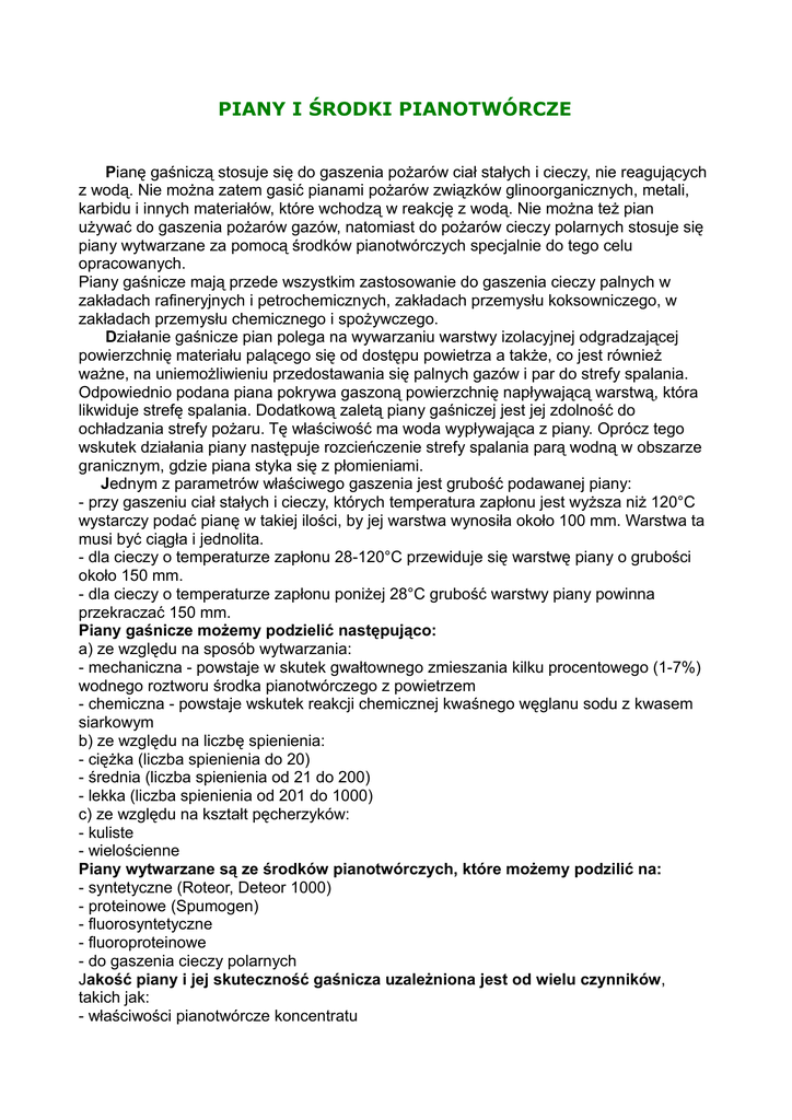 PIANY I ŚRODKI PIANOTWÓRCZE Pianę gaśniczą stosuje się do gaszenia pożarów ciał stałych i cieczy, nie reagujących z wodą. Nie można zatem gasić pianami pożarów związków glinoorganicznych, metali, karbidu i innych materiałów, które wchodzą w reakcję z wodą. Nie można też pian używać do gaszenia pożarów gazów, natomiast do pożarów cieczy polarnych stosuje się piany wytwarzane za pomocą środków pianotwórczych specjalnie do tego celu opracowanych. Piany gaśnicze mają przede wszystkim zastosowanie do gaszenia cieczy palnych w zakładach rafineryjnych i petrochemicznych, zakładach przemysłu koksowniczego, w zakładach przemysłu chemicznego i spożywczego. Działanie gaśnicze pian polega na wywarzaniu warstwy izolacyjnej odgradzającej powierzchnię materiału palącego się od dostępu powietrza a także, co jest również ważne, na uniemożliwieniu przedostawania się palnych gazów i par do strefy spalania. Odpowiednio podana piana pokrywa gaszoną powierzchnię napływającą warstwą, która likwiduje strefę spalania. Dodatkową zaletą piany gaśniczej jest jej zdolność do ochładzania strefy pożaru. Tę właściwość ma woda wypływająca z piany. Oprócz tego wskutek działania piany następuje rozcieńczenie strefy spalania parą wodną w obszarze granicznym, gdzie piana styka się z płomieniami. Jednym z parametrów właściwego gaszenia jest grubość podawanej piany: - przy gaszeniu ciał stałych i cieczy, których temperatura zapłonu jest wyższa niż 120°C wystarczy podać pianę w takiej ilości, by jej warstwa wynosiła około 100 mm. Warstwa ta musi być ciągła i jednolita. - dla cieczy o temperaturze zapłonu 28-120°C przewiduje się warstwę piany o grubości około 150 mm. - dla cieczy o temperaturze zapłonu poniżej 28°C grubość warstwy piany powinna przekraczać 150 mm. Piany gaśnicze możemy podzielić następująco: a) ze względu na sposób wytwarzania: - mechaniczna - powstaje w skutek gwałtownego zmieszania kilku procentowego (1-7%) wodnego roztworu środka pianotwórczego z powietrzem - chemiczna - powstaje wskutek reakcji chemicznej kwaśnego węglanu sodu z kwasem siarkowym b) ze względu na liczbę spienienia: - ciężka (liczba spienienia do 20) - średnia (liczba spienienia od 21 do 200) - lekka (liczba spienienia od 201 do 1000) c) ze względu na kształt pęcherzyków: - kuliste - wielościenne Piany wytwarzane są ze środków pianotwórczych, które możemy podzilić na: - syntetyczne (Roteor, Deteor 1000) - proteinowe (Spumogen) - fluorosyntetyczne - fluoroproteinowe - do gaszenia cieczy polarnych Jakość piany i jej skuteczność gaśnicza uzależniona jest od wielu czynników, takich jak: - właściwości pianotwórcze koncentratu - rodzaj środka pianotwórczego - stężenie środka pianotwórczego w wodnym roztworze - jakość wody oraz stopień jej zasolenia - jakość sprzętu wytwarzającego pianę - temperatura wody i otoczenia - właściwości fizykochemiczne i pożarowe materiałów znajdujących się w strefie spalania. Właściwości pian gaśniczych określają następujące podstawowe parametry: - liczba spienienia - stosunek objętości piany do objętości roztworu, z którego ta piana powstała. - dyspersyjność - stopień rozdrobnienia pęcherzyków piany. Im wyższa jest średnica pęcherzyków, tym mniejsza jest dyspersyjność piany. - trwałość - jest to zdolność piany do zachowania swoich właściwości, jakie uzyskała w momencie wytworzenia. Trwałość piany określana jest na podstawie szybkości wypływu z niej wodnego roztworu środka pianotwórczego. Jest to również miara szybkości niszczenia piany. Im wolniej następuje proces niszczenia pęcherzyków, tym piana jest trwalsza. Czas w którym wypłynie 25% lub 50% objętości roztworu, z którego piana została wytworzona, jest miarą trwałości piany. Trwałość piany zależy od wielu czynników takich, jak: właściwości i stężenia środka pianotwórczego, jakość wody, z której wytworzono pianę, liczba spienienia, dyspersyjność, temperatura pożaru i powietrza oraz rodzaj środowiska stykającego się z pianą. - płynność - jest to zdolność piany do rozpływania się po powierzchni ciał stałych lub cieczy. Szybkie rozpływanie się piany jest cechą pożądaną. Im szybciej rozpływa się piana po powierzchni palącego się materiału, tym krótszy jest kontakt jej z płomieniami, mniejsze niszczenie piany spowodowane wysoką temperaturą i szybsze gaszenie pożaru. Właściwości pianotwórcze koncentratów różnią się między sobą nieraz znacznie. Różnice te wynikają przede wszystkim z różnic składów poszczególnych koncentratów pianotwórczych. Przykładowo, środki pianotwórcze produkowane na bazie hydrolizatorów białkowych wytwarzają pianę o niższej liczbie spienienia, a także charakteryzują się lepszą przyczepnością do powierzchni materiału. Środki pianotwórcze otrzymywane na bazie syntetycznych środków powierzchniowo czynnych pozwalają na otrzymanie piany o liczbie spienienia wyższej o 50-100% w stosunku do pian proteinowych. Trwałość i odporność na wysokie temperatury także różnicują poszczególne rodzaje środków pianotwórczych. Trwałość piany i odporność na temperatury wynikają nie tylko z rodzaju zastosowanej bazy powierzchniowo czynnej, ale również zależne są od zastosowanych dodatków utrwalających. Istotne znaczenie dla otrzymania pełnowartościowej piany gaśniczej ma precyzyjne dozowanie koncentratu do wody. Stężenie środka pianotwórczego musi być dokładnie takie, jakie wymienia producent w normie zakładowej czy w prospekcie. Nadmiar koncentratu w roztworze nie poprawia jakości piany lecz wyraźnie wpływa na jej pogorszenie. Występując w znacznym nadmiarze, powoduje, że piany w ogóle nie można uzyskać. Nie bez znaczenia jest też jakość wody pobieranej do wytwarzania piany gaśniczej. Zanieczyszczenia,