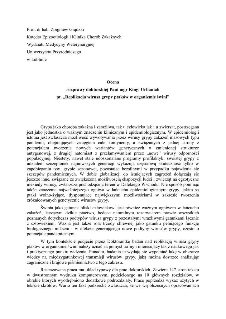 Prof. dr hab. Zbigniew Grądzki Katedra Epizootiologii i Klinika Chorób Zakaźnych Wydziału Medycyny Weterynaryjnej Uniwersytetu Przyrodniczego w Lublinie Ocena rozprawy doktorskiej Pani mgr Kingi Urbaniak pt. „Replikacja wirusa grypy ptaków w organizmie świni” Grypa jako choroba zakaźna i zaraźliwa, tak u człowieka jak i u zwierząt, postrzegana jest jako jednostka o ważnym znaczeniu klinicznym i epidemiologicznym. W epidemiologii istotna jest zwłaszcza możliwość wywoływania przez wirusy grypy zakażeń masowych typu pandemii, obejmujących zasięgiem całe kontynenty, a związanych z jednej strony z potencjałem tworzenia nowych wariantów genetycznych o zmienionej strukturze antygenowej, z drugiej natomiast z przełamywaniem przez „nowe” wirusy odporności populacyjnej. Niestety, nawet stale udoskonalane programy profilaktyki swoistej grypy z udziałem szczepionek najnowszych generacji wykazują częściową skuteczność tylko w zapobieganiu tzw. grypie sezonowej, pozostając bezsilnymi w przypadku pojawienia się szczepów pandemicznych. W dobie globalizacji do istniejących zagrożeń dołączają się jeszcze inne, związane ze zwiększoną możliwością ekspozycji ludzi i zwierząt na egzotyczne niekiedy wirusy, zwłaszcza pochodzące z terenów Dalekiego Wschodu. Nie sposób pominąć także znaczenia najważniejszego ogniwa w łańcuchu epidemiologicznym grypy, jakim są ptaki wolno-żyjące, dysponujące największymi możliwościami w zakresie tworzenia zróżnicowanych genetycznie wirusów grypy. Świnia jako gatunek bliski człowiekowi jest również ważnym ogniwem w łańcuchu zakażeń, łączącym dzikie ptactwo, będące naturalnym rezerwuarem prawie wszystkich poznanych dotychczas podtypów wirusa grypy z pozostałymi wrażliwymi gatunkami łącznie z człowiekiem. Ważna jest także rola trzody chlewnej jako gatunku pełniącego funkcję biologicznego miksera i w efekcie generującego nowe podtypy wirusów grypy, często o potencjale pandemicznym. W tym kontekście podjęcie przez Doktorantkę badań nad replikacją wirusa grypy ptaków w organizmie świni należy uznać za pomysł trafny i interesujący tak z naukowego jak i praktycznego punktu widzenia. Ponadto, badania te wydają się wypełniać lukę w obszarze wiedzy nt. międzygatunkowej transmisji wirusów grypy, jaką można dostrzec analizując zagraniczne i krajowe piśmiennictwo z tego zakresu. Recenzowana praca ma układ typowy dla prac doktorskich. Zawiera 147 stron tekstu w dwustronnym wydruku komputerowym, podzielonego na 10 głównych rozdziałów, w obrębie których wyodrębniono dodatkowe podrozdziały. Pracę poprzedza wykaz użytych w tekście skrótów. Warto ten fakt podkreślić zwłaszcza, że we współczesnych opracowaniach 2 naukowych pojawia się wiele określeń zapożyczonych z terminologii anglojęzycznej, od których tworzone są uniwersalne skróty odnoszące się np. do elementów struktury i nazw mikroorganizmów, metod badawczych, parametrów reakcji chemicznych, nazw odczynników itp. Włączenie do tekstu rozprawy przewodnika po tych zawiłościach językowych ułatwia jego czytanie i analizę, a Autorowi pozwala pominąć wielokrotne rozwijanie i tłumaczenie używanych skrótów. Rozprawa opatrzona jest także streszczeniem przedstawionym w języku polskim i angielskim, zawierającym syntetyczny opis trzech głównych eksperymentów przeprowadzonych w ramach realizacji badań własnych. Wstęp rozprawy jest przeglądem aktualnej wiedzy nt. grypy jako choroby zakaźnej i zaraźliwej oraz nt. wirusów grypy jako czynników etiologicznych tej choroby. Z analizy tej części pracy wynika, że Autorka dysertacji jest dobrze zorientowana w problematyce jaką się zajmuje, ma dużą wiedzę wypływającą ze znajomości piśmiennictwa z zakresu grypy u zwierząt i człowieka oraz, co godne uwagi, opiera ją na najnowszych opracowaniach publikowanych w renomowanych czasopismach anglojęzycznych. W opinii recenzenta proporcjonalnie Autorka zbyt wiele miejsca poświęciła we wstępie szczegółowemu opisowi struktury oraz funkcji poszczególnych białek wirusa grypy kosztem informacji ściślej wiążących się z tematem rozprawy, tj. możliwościom transmisji międzygatunkowej i replikacji wirusa grypy ptaków u nowego gospodarza. Wprawdzie, jak twierdzi Autorka zagadnienia te są w odniesieniu do wirusów ptasich słabo poznane, tym niemniej na bazie istniejących hipotez można było własne rozważania na ten temat bardziej rozbudować. Warto natomiast zwrócić uwagę na zamieszczone we wstępie schematy budowy wirusa grypy oraz cyklu replikacyjnego, pochodzące z opracowań firmowanych przez Doktorantkę. W podrozdziale 2.4., odnoszącym się do zmienności wirusa grypy Autorka pisząc nt. skoku antygenowego, przybierającego formę reasortacji genetycznej, powinna zaznaczyć, że nowe podtypy wirusa powstają wówczas gdy wymiana materiału genetycznego dotyczy segmentów 4 i 6, kodujących odpowiednio HA i NA. Znaczenie świń w epidemiologii grypy jest fundamentalne i związane jest z różnorodnością receptorów komórkowych dla tych zarazków. W opinii recenzenta zagadnienie to zostało potraktowane marginalnie chociaż wiadomo, że warunkuje ono możliwość generowania w organizmie świni zmienionych genetycznie i antygenowo nowych wariantów wirusa grypy, często należących do różnych podtypów (mixing vessel). Informacje na ten temat pojawiają się wprawdzie w rozdziale „Dyskusja”, jednak swoją naturą bardziej pasują do wprowadzenia, które stanowi wstęp. Podrozdział 2.5. wstępu napisany jest w nieco odmiennej konwencji w porównaniu do pozostałych podrozdziałów, ponieważ dotyczy aspektu zoonotycznego tylko wirusów grypy świń. Wszystkie wcześniejsze rozważania nt. wirusów grypy odnosiły się ogólnie do wirusów typu A bez zróżnicowania gatunkowego. Być może jednak Doktorantka chciała w ten sposób zwrócić więks