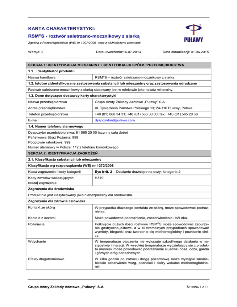 KARTA CHARAKTERYSTYKI: RSM®S - roztwór saletrzano-mocznikowy z siarką Zgodna z Rozporządzeniem (WE) nr 1907/2006 wraz z późniejszymi zmianami. Wersja: 2 Data utworzenia:16.07.2013 Data aktualizacji: 01.06.2015 SEKCJA 1: IDENTYFIKACJA MIESZANINY I IDENTYFIKACJA SPÓŁKI/PRZEDSIĘBIORSTWA 1.1. Identyfikator produktu Nazwa handlowa RSM®S – roztwór saletrzano-mocznikowy z siarką 1.2. Istotne zidentyfikowane zastosowania substancji lub mieszaniny oraz zastosowania odradzane Roztwór saletrzano-mocznikowy z siarką stosowany jest w rolnictwie jako nawóz mineralny. 1.3. Dane dotyczące dostawcy karty charakterystyki Nazwa przedsiębiorstwa Grupa Azoty Zakłady Azotowe „Puławy” S.A. Adres przedsiębiorstwa Al. Tysiąclecia Państwa Polskiego 13; 24-110 Puławy; Polska Telefon przedsiębiorstwa +48 (81) 886 34 31; +48 (81) 565 30 00; fax.: +48 (81) 565 28 56 E-mail [email protected] 1.4. Numer telefonu alarmowego Dyspozytor przedsiębiorstwa: 81 565 20 00 (czynny całą dobę) Państwowa Straż Pożarna: 998 Pogotowie ratunkowe: 999 Numer alarmowy w Polsce: 112 z telefonu komórkowego SEKCJA 2: IDENTYFIKACJA ZAGROŻEŃ 2.1. Klasyfikacja substancji lub mieszaniny Klasyfikacja wg rozporządzenia (WE) nr 1272/2008 Klasa zagrożenia i kody kategorii Eye Irrit. 2 – Działanie drażniące na oczy, kategoria 2 Kody zwrotów wskazujących rodzaj zagrożenia H319 Zagrożenia dla środowiska Produkt nie jest klasyfikowany jako niebezpieczny dla środowiska. Zagrożenia dla zdrowia człowieka Kontakt ze skórą W przypadku dłuższego kontaktu ze skórą, może spowodować podrażnienia. Kontakt z oczami Może powodować podrażnienie, zaczerwienienie i ból oka. Połknięcie Połknięcie dużych ilości roztworu RSM®S może spowodować zaburzenia gastryczno-jelitowe, a w ekstremalnych przypadkach spowodować wymioty, biegunki oraz tworzenie się methemoglobiny i powstanie sinicy. Wdychanie W temperaturze otoczenia nie wykazuje szkodliwego działania w następstwie inhalacji. W wysokiej temperaturze wydzielający się z produktu amoniak może powodować podrażnienie śluzówki nosa, oczu, gardła i górnych dróg oddechowych. Efekty długoterminowe W kilka godzin po zatruciu drogą pokarmową może wystąpić sinoniebieskie zabarwienie warg, paznokci i skóry wskutek methemoglobinemii. Grupa Azoty Zakłady Azotowe „Puławy” S.A. STRONA 1 Z 11 KARTA CHARAKTERYSTYKI: RSM®S - roztwór saletrzano-mocznikowy z siarką Zgodna z Rozporządzeniem (WE) nr 1907/2006 wraz z późniejszymi zmianami. Wersja: 2 Data utworzenia:16.07.2013 Zagrożenia związane z właściwościami fizykochemicznymi Data aktualizacji: 01.06.2015 Produkt nie został sklasyfikowany jako niebezpieczny w wyniku analizy zagrożeń związanych z właściwościami fizykochemicznymi. 2.2. Elementy oznakowania Piktogram GHS07 Hasło ostrzegawcze Uwaga Zwroty H H319: Działa drażniąco na oczy. Zwroty P P305 + P351 + P338: W PRZYPADKU DOSTANIA SIĘ DO OCZU: Ostrożnie płukać wodą przez kilka minut. Wyjąć soczewki kontaktowe, jeżeli są i można je łatwo usunąć. Nadal płukać. P337 + P313: W przypadku utrzymywania się działania drażniącego na oczy: Zasięgnąć porady/zgłosić się pod opiekę lekarza. 2.3. Inne zagrożenia Zawarty w mieszaninie mocznik nie spełnia kryteriów przyjętych dla substancji trwałych, wykazujących zdolność do bioakumulacji i toksycznych (ang. Persistent, Bioaccumulative, Toxic – PBT) ani substancji bardzo trwałych i wykazujących bardzo dużą zdolność do bioakumulacji (ang. very Persistent very Bioaccumulative - vPvB). Azotanu (V) amonu oraz siarczan (VI ) amonu nie podlegają ocenie właściwości PBT/vPvB SEKCJA 3: SKŁAD/INFORMACJA O SKŁADNIKACH 3.1. Substancje Nie dotyczy 3.2. Mieszaniny RSM®S – roztwór saletrzano-mocznikowy z siarką Identyfikator produktu Klasyfikacja składników wg Rozporządzenia (WE) 1272/2008 Nr WE Nr rejestracji Klasy zagrożenia i kody kategorii Zwroty H 23 229-347-8 01-2119490981-27-0025 Oxid. Solid 3 Eye Irrit. 2 H272 H319 Mocznik 33 200-315-5 01-2119463277-33-0025 Nie dotyczy Nie dotyczy Siarczan (VI) amonu 13 7783-20-2 01-2119455044-46-0011 Nie dotyczy Nie dotyczy Nazwa składnika Azotan amonu (V) Stężenie Pełne brzmienie zwrotów wskazujących rodzaj zagrożenia (zwrotów H) znajduje się w punkcie 16. SEKCJA 4: ŚRODKI PIERWSZEJ POMOCY Grupa Azoty Zakłady Azotowe „Puławy” S.A. STRONA 2 Z 11 KARTA CHARAKTERYSTYKI: RSM®S - roztwór saletrzano-mocznikowy z siarką Zgodna z Rozporządzeniem (WE) nr 1907/2006 wraz z późniejszymi zmianami. Wersja: 2 Data utworzenia:16.07.2013 Data aktualizacji: 01.06.2015 4.1. Opis środków pierwszej pomocy Informacje ogólne Stosować ogólną wentylację. Zaleca się wyposażenie miejsca pracy w prysznic oraz myjkę do oczu. Inhalacja Usunąć poszkodowanego z miejsca zagrożenia zapewniając dostęp świeżego powietrza. W przypadku wystąpienia objawów zatrucia zapewnić pomoc medyczną. Połknięcie Podać poszkodowanemu dużą ilość wody do picia. Nie wywoływać wymiotów. Małe dawki zazwyczaj nie wywołują objawów zatrucia. Spożycie większych ilości nawozu może prowadzić do zaburzeń żołądkowo - trawiennych, spadku ciśnienia krwi oraz tworzenia się methemoglobiny. Wezwać pomoc lekarską. Skóra Zdjąć zanieczyszczoną odzież. Skórę spłukać dużą ilością wody. W przypadku wystąpienia podrażnień skontaktować się z lekarzem. Oczy Przemywać oczy dużą ilością wody przez około 15 minut. Unikać silnego strumienia wody ze względu na możliwość uszkodzenia rogówki. Zasięgnąć porady lekarskiej. 4.2. Najważniejsze ostre i opóźnione objawy oraz skutki narażenia Mieszanina działa drażniąco na oczy. W przypadku spożycia dużych ilości może wystąpić sinoniebieskie zabarwienie warg, paznokci, skóry wskutek methemoglobinemii. 4.3. Wskazania dotyczące wszelkiej natychmiastowej pomocy lekarskiej i szczególnego postępowania z poszkodowanym W p