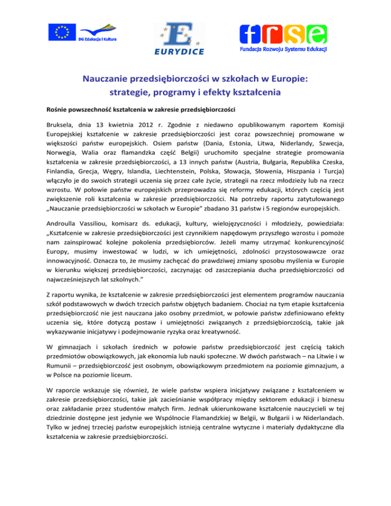 Nauczanie przedsiębiorczości w szkołach w Europie: strategie, programy i efekty kształcenia Rośnie powszechność kształcenia w zakresie przedsiębiorczości Bruksela, dnia 13 kwietnia 2012 r. Zgodnie z niedawno opublikowanym raportem Komisji Europejskiej kształcenie w zakresie przedsiębiorczości jest coraz powszechniej promowane w większości państw europejskich. Osiem państw (Dania, Estonia, Litwa, Niderlandy, Szwecja, Norwegia, Walia oraz flamandzka część Belgii) uruchomiło specjalne strategie promowania kształcenia w zakresie przedsiębiorczości, a 13 innych państw (Austria, Bułgaria, Republika Czeska, Finlandia, Grecja, Węgry, Islandia, Liechtenstein, Polska, Słowacja, Słowenia, Hiszpania i Turcja) włączyło je do swoich strategii uczenia się przez całe życie, strategii na rzecz młodzieży lub na rzecz wzrostu. W połowie państw europejskich przeprowadza się reformy edukacji, których częścią jest zwiększenie roli kształcenia w zakresie przedsiębiorczości. Na potrzeby raportu zatytułowanego „Nauczanie przedsiębiorczości w szkołach w Europie” zbadano 31 państw i 5 regionów europejskich. Androulla Vassiliou, komisarz ds. edukacji, kultury, wielojęzyczności i młodzieży, powiedziała: „Kształcenie w zakresie przedsiębiorczości jest czynnikiem napędowym przyszłego wzrostu i pomoże nam zainspirować kolejne pokolenia przedsiębiorców. Jeżeli mamy utrzymać konkurencyjność Europy, musimy inwestować w ludzi, w ich umiejętności, zdolności przystosowawcze oraz innowacyjność. Oznacza to, że musimy zachęcać do prawdziwej zmiany sposobu myślenia w Europie w kierunku większej przedsiębiorczości, zaczynając od zaszczepiania ducha przedsiębiorczości od najwcześniejszych lat szkolnych.” Z raportu wynika, że kształcenie w zakresie przedsiębiorczości jest elementem programów nauczania szkół podstawowych w dwóch trzecich państw objętych badaniem. Chociaż na tym etapie kształcenia przedsiębiorczość nie jest nauczana jako osobny przedmiot, w połowie państw zdefiniowano efekty uczenia się, które dotyczą postaw i umiejętności związanych z przedsiębiorczością, takie jak wykazywanie inicjatywy i podejmowanie ryzyka oraz kreatywność. W gimnazjach i szkołach średnich w połowie państw przedsiębiorczość jest częścią takich przedmiotów obowiązkowych, jak ekonomia lub nauki społeczne. W dwóch państwach – na Litwie i w Rumunii – przedsiębiorczość jest osobnym, obowiązkowym przedmiotem na poziomie gimnazjum, a w Polsce na poziomie liceum. W raporcie wskazuje się również, że wiele państw wspiera inicjatywy związane z kształceniem w zakresie przedsiębiorczości, takie jak zacieśnianie współpracy między sektorem edukacji i biznesu oraz zakładanie przez studentów małych firm. Jednak ukierunkowane kształcenie nauczycieli w tej dziedzinie dostępne jest jedynie we Wspólnocie Flamandzkiej w Belgii, w Bułgarii i w Niderlandach. Tylko w jednej trzeciej państw europejskich istnieją centralne wytyczne i materiały dydaktyczne dla kształcenia w zakresie przedsiębiorczości. Kontekst Unia Europejska promuje przedsiębiorczość jako kluczowy czynnik konkurencyjności, a także wskazuje na znaczenie rozpowszechniania europejskiej kultury przedsiębiorczości przez wspieranie właściwego sposobu myślenia i umiejętności związanych z przedsiębiorczością. W zaleceniu Parlamentu Europejskiego i Rady z 2006 r. w sprawie kompetencji kluczowych w procesie uczenia się przez całe życie przedsiębiorczość jest jedną z ośmiu kluczowych kompetencji. Potrzeba zwiększenia potencjału obywateli w zakresie przedsiębiorczości i innowacyjności podkreślona jest także w trzech inicjatywach przewodnich strategii „Europa 2020” na rzecz zrównoważonego wzrostu gospodarczego i zatrudnienia: „Unia innowacji”, „Mobilna młodzież” oraz „Program na rzecz nowych umiejętności i zatrudnienia”. Zwiększanie kreatywności i innowacyjności, w tym przedsiębiorczości, na wszystkich poziomach kształcenia i szkolenia jest także długoterminowym celem strategicznych ram współpracy europejskiej „Kształcenie i szkolenie 2020” . W tym celu w listopadzie 2011 r. Komisja powołała grupę roboczą ds. kształcenia w zakresie przedsiębiorczości. Grupa ta składa się z ekspertów z 24 państw oraz z przedstawicieli przedsiębiorstw i związków zawodowych. Jej celem jest wsparcie wysiłków państw członkowskich w realizacji kształcenia w zakresie przedsiębiorczości oraz kierowanie pracami Komisji na rzecz promowania kształcenia w tym zakresie. Do końca 2013 r. grupa opracuje poradnik strategiczny na temat kształcenia w zakresie przedsiębiorczości. Tekst opracowano na podstawie Komunikatu Prasowego Komisji Europejskiej IP/12/365 Pełna wersja raportu Entrepreneurship Education at School in Europe. National Strategies, Curricula and Learning Outcomes Jest dostępna w języku angielskim na stronie internetowej Polskiego Biura Eurydice: http://www.eurydice.org.pl/node/84 Rys. 1: Krajowe/regionalne strategie i inicjatywy dotyczące włączania przedsiębiorczości do kształcenia ogólnego (ISCED 1-3), 2011/12 Źródło: Eurydice. Rys. 2: Przedmioty obejmujące kształcenie w zakresie przedsiębiorczości w gimnazjach (ISCED 2), 2011/12 Przedsiębiorczość Ekonomia, biznes i planowanie kariery Nauki społeczne Matematyka, nauki ścisłe, technologia, informatyka Sztuka i muzyka Przedmioty nieobowiązkowe/do wyboru Źródło: Eurydice. Przedmioty obowiązkowe dla wszystkich Rys. 3: Przedmioty obejmujące kształcenie w zakresie przedsiębiorczości w szkołach ponadgimnazjalnych (ISCED 3), 2011/12 Przedsiębiorczość Ekonomia, biznes i planowanie kariery Nauki społeczne Matematyka, nauki ścisłe, technologia, informatyka Etyka i język ojczysty Przedmioty nieobowiązkowe/do wyboru Przedmioty obowiązkowe dla wszystkich Źródło: Eurydice. Rys. 4: Dostępnoś