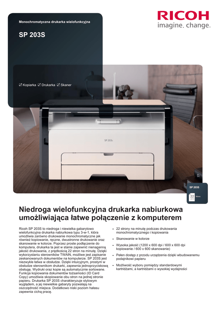Monochromatyczna drukarka wielofunkcyjna SP 203S Kopiarka Drukarka Skaner SP 203S 22 Mono str/mi Niedroga wielofunkcyjna drukarka nabiurkowa umożliwiająca łatwe połączenie z komputerem Ricoh SP 203S to niedroga i niewielka gabarytowo wielofunkcyjna drukarka nabiurkowa typu 3-w-1, która umożliwia zarówno drukowanie monochromatyczne jak również kopiowanie, ręczne, dwustronne drukowanie oraz skanowanie w kolorze. Poprzez proste podłączenie do komputera, drukarka ta jest w stanie zapewnić nienaganną jakość drukowania, z prędkością 22 stron na minutę. Dzięki wykorzystaniu sterowników TWAIN, możliwe jest zapisanie zeskanowanych dokumentów na komputerze. SP 203S jest niezwykle łatwa w obsłudze. Dzięki intuicyjnym, prostym w obsłudze sterownikom drukarki, zapewnia jednoprzyciskową obsługę. Wydruki oraz kopie są automatycznie sortowane. Funkcja kopiowania dokumentów tożsamości (ID Card Copy) umożliwia skopiowanie obu stron na jednej stronie papieru. Drukarka SP 203S charakteryzuje stylowym wyglądem, a jej niewielkie gabaryty pozwalają na oszczędność miejsca. Dodatkowo niski poziom hałasu zapewnia cichą pracę. 22 strony na minutę podczas drukowania monochromatycznego i kopiowania Skanowanie w kolorze Wysoka jakość (1200 x 600 dpi / 600 x 600 dpi kopiowanie / 600 x 600 skanowanie) Pełen dostęp z przodu urządzenia dzięki wbudowanemu podajnikowi papieru Możliwość wyboru pomiędzy standardowymi kartridżami, a kartridżami o wysokiej wydajności Specyfikacja główna SP 203S Gramatura papieru: OGÓLNE Czas nagrzewania: 25 sekund Prędkość wykonania pierwszej kopii: Prędkość wydruku ciągłego: 10 sekund 22 stron na minutę EKOLOGIA Wymiary (szer. x gł. x wys.): 402 x 360 x 249 mm Pobór mocy: Waga: 8,9 kg Źródło zasilania: 220 - 240 V, 50/60 Hz Standardowa/e kaseta/y na papier: 60 - 105 g/m² Taca ręczna: 60 - 105 g/m² Maksymalnie: 400 W Tryb uśpienia: 5 W MATERIAŁY EKSPLOATACYJNE KOPIARKA Proces kopiowania: Skanowanie wiązką lasera i druk elektrofotograficzny Kopiowanie wielokrotne: Do 99 kopii Rozdzielczość: 600 x 600 dpi Zoom: Od 25% do 400% co 1% Pojemność kartridża All-in-one (mała wydajność): Pojemność kartridża All-in-one (duża wydajność): Czarny: 1 500 wydruków Czarny: 2 600 wydruków DRUKARKA RAM: 16 MB Język drukarki: Standardowo: DDST (GDI) Rozdzielczość drukowania: 1 200 x 600 dpi Interfejs: USB 2.0 Środowiska Windows®: Windows® XP, Windows® Vista, Windows® 7, Windows® 8, Windows® Server 2003, Windows® Server 2008, Windows® Server 2008R2, Windows® Server 2012 SKANER Prędkość skanowania: Pełnokolorowe: Maksymalnie 6,5 oryginałów na minutę Mono: Maksymalnie 13 oryginałów na minutę Rozdzielczość: Maksymalnie: 600 dpi Rozmiar oryginału: A4 Sterowniki standardowe: Sieciowy TWAIN OBSŁUGIWANY PAPIER Zalecany rozmiar papieru: Standardowa/e kaseta/y na papier: A4, A5, A6, B5, B6 Taca ręczna: A4, A5, A6, B5, B6 Pojemność wejściowa papieru: Maksymalnie: 151 arkuszy Pojemność wyjściowa papieru: Maksymalnie: 50 arkuszy Certyfikaty ISO9001, ISO14001, ISO27001 Wszystkie marki i/lub produkty są nazwami handlowymi ich właścicieli. Specyfikacja i wygląd zewnętrzny mogą ulec zmianie bez uprzedniej informacji. Kolor produktu może różnić się od przedstawionego w broszurze. Zdjęcia w broszurze nie są prawdziwymi fotografiami i w wyglądzie mogą pojawić się niewielkie różnice. www.ricoh-europe.com Copyright © 2013 Ricoh Europe PLC. All rights reserved. Broszura, jej zawartość i/lub wygląd nie mogą być zmieniane, adoptowane, kopiowane w części i/lub całości ani używane w innych opracowaniach bez pisemnej zgody Ricoh Europe PLC.