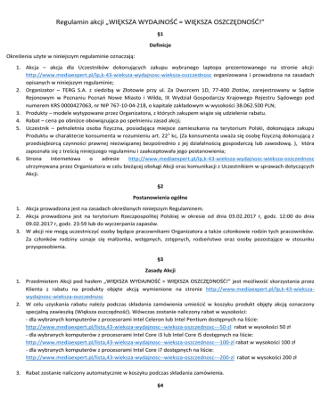 Regulamin akcji „WIĘKSZA WYDAJNOŚĆ = WIĘKSZA OSZCZĘDNOŚĆ!” §1 Definicje Określenia użyte w niniejszym regulaminie oznaczają: 1. Akcja – akcja dla Uczestników dokonujących zakupu wybranego laptopa prezentowanego na stronie akcji: http://www.mediaexpert.pl/lp,k-43-wieksza-wydajnosc-wieksza-oszczednosc organizowana i prowadzona na zasadach opisanych w niniejszym regulaminie; 2. Organizator – TERG S.A. z siedzibą w Złotowie przy ul. Za Dworcem 1D, 77-400 Złotów, zarejestrowany w Sądzie Rejonowym w Poznaniu Poznań Nowe Miasto i Wilda, IX Wydział Gospodarczy Krajowego Rejestru Sądowego pod numerem KRS 0000427063, nr NIP 767-10-04-218, o kapitale zakładowym w wysokości 38.062.500 PLN; 3. Produkty – modele wytypowane przez Organizatora, z których zakupem wiąże się udzielenie rabatu. 4. Rabat – cena po obniżce obowiązująca po spełnieniu zasad akcji; 5. Uczestnik – pełnoletnia osoba fizyczna, posiadająca miejsce zamieszkania na terytorium Polski, dokonująca zakupu Produktu w charakterze konsumenta w rozumieniu art. 221 kc, (Za konsumenta uważa się osobę fizyczną dokonującą z przedsiębiorcą czynności prawnej niezwiązanej bezpośrednio z jej działalnością gospodarczą lub zawodową. ), która zapoznała się z treścią niniejszego regulaminu i zaakceptowała jego postanowienia; 6. Strona internetowa o adresie http://www.mediaexpert.pl/lp,k-43-wieksza-wydajnosc-wieksza-oszczednosc utrzymywana przez Organizatora w celu bieżącej obsługi Akcji oraz komunikacji z Uczestnikiem w sprawach dotyczących Akcji. §2 Postanowienia ogólne 1. Akcja prowadzona jest na zasadach określonych niniejszym Regulaminem. 2. Akcja prowadzona jest na terytorium Rzeczpospolitej Polskiej w okresie od dnia 03.02.2017 r, godz. 12:00 do dnia 09.02.2017 r, godz. 23:59 lub do wyczerpania zapasów. 3. W akcji nie mogą uczestniczyć osoby będące pracownikami Organizatora a także członkowie rodzin tych pracowników. Za członków rodziny uznaje się małżonka, wstępnych, zstępnych, rodzeństwo oraz osoby pozostające w stosunku przysposobienia. §3 Zasady Akcji 1. Przedmiotem Akcji pod hasłem „WIĘKSZA WYDAJNOŚĆ = WIĘKSZA OSZCZĘDNOŚĆ!” jest możliwość skorzystania przez Klienta z rabatu na produkty objęte akcją wymienione na stronie http://www.mediaexpert.pl/lp,k-43-wiekszawydajnosc-wieksza-oszczednosc 2. W celu uzyskania rabatu należy podczas składania zamówienia umieścić w koszyku produkt objęty akcją oznaczony specjalną zawieszką (Większa oszczędność). Wówczas zostanie naliczony rabat w wysokości: - dla wybranych komputerów z procesorami Intel Celeron lub Intel Pentium dostępnych na liście: http://www.mediaexpert.pl/lista,43-wieksza-wydajnosc--wieksza-oszczednosc---50-zl rabat w wysokości 50 zł - dla wybranych komputerów z procesorami Intel Core i3 lub Intel Core i5 dostępnych na liście: http://www.mediaexpert.pl/lista,43-wieksza-wydajnosc--wieksza-oszczednosc---100-zl rabat w wysokości 100 zł - dla wybranych komputerów z procesorami Intel Core i7 dostępnych na liście: http://www.mediaexpert.pl/lista,43-wieksza-wydajnosc--wieksza-oszczednosc---200-zl rabat w wysokości 200 zł 3. Rabat zostanie naliczony automatycznie w koszyku podczas składania zamówienia. §4 Ograniczenia akcji promocyjnej 1. Ilość produktów dostępnych w akcji „WIĘKSZA WYDAJNOŚĆ = WIĘKSZA OSZCZĘDNOŚĆ!” jest ograniczona. 2. Sprzedaż produktów objętych akcją „WIĘKSZA WYDAJNOŚĆ = WIĘKSZA OSZCZĘDNOŚĆ!” jest możliwa tylko i wyłącznie w ilościach detalicznych - maksymalnie 2 sztuki tego samego towaru. 3. Przy zakupie produktów biorących udział w akcji „WIĘKSZA WYDAJNOŚĆ = WIĘKSZA OSZCZĘDNOŚĆ!” od zaprezentowanych cen nie przysługują już żadne inne upusty. 4. W przypadku skorzystania z prawa zwrotu produktu lub produktów objętego/objętych akcją „WIĘKSZA WYDAJNOŚĆ = WIĘKSZA OSZCZĘDNOŚĆ!” uprawniającego do otrzymania rabatu, Uczestnik obowiązany jest do zapłaty pełnej wartości ceny obowiązującej w dniu zakupu, czyli ceny bez promocji produktu, którego nie zwraca. §5 Raty 1. W przypadku zakupu na raty w okresie obowiązywania akcji warunkiem skorzystania z aktualnych ofert ratalnych jest otrzymanie zgody na zawarcie kredytu w wyniku przeprowadzonej weryfikacji, oceny zdolności kredytowej Klienta przez Bank. W przypadku negatywnej odpowiedzi banku na wniosek kredytowy Klienta ze strony Organizatora zostaną zaproponowane inne alternatywne formy płatności. 2. Wysokość rat zaprezentowanych w akcji nie zawiera ubezpieczenia. Ubezpieczenie spłaty kredytu ma charakter dobrowolny i stanowi zabezpieczenie pożyczki/kredytu w momencie zgody Klienta na zawarcie umowy ubezpieczenia kredytu. 3. Minimalna wartość brutto towaru nabywanego w systemie ratalnym wynosi 300 zł. §6 Reklamacje 1. Reklamację należy składać mailowo na adres: [email protected]. Reklamacja powinna zawierać: imię, nazwisko i adres do korespondencji składającego reklamację, jak również opis podstawy reklamacji. 2. Reklamacja powinna zawierać żądanie określonego zachowania się przez Organizatora. 3. Reklamujący zobowiązany jest wraz z reklamacją doręczyć wszelkie dokumenty oraz przytoczyć wszystkie okoliczności faktyczne bądź prawne uzasadniające żądanie. 4. Reklamacje mogą być składane przez cały czas trwania akcji, jednak nie później niż w terminie 21 dni od dnia jej zakończenia. Reklamacje, które otrzyma Organizator po tej dacie nie będą rozpatrywane. 5. Reklamacje rozpatrywane będą przez Organizatora w terminie 14 dni od dnia otrzymania reklamacji. O wyniku rozpatrzenia reklamacji Uczestnik zostanie poinformowany drogą mailową w terminie 7 dni od daty rozpatrzenia reklamacji. 6. Przy rozpatrywaniu reklamacji Organizator opiera się na treści niniejszego regulaminu oraz obowiązujących przepisach prawa polskiego. §7 Ochrona danych osobowych 1. Administratorem danych 