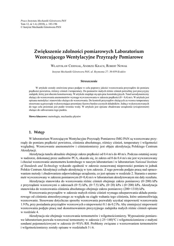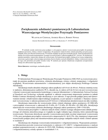 183 Prace Instytutu Mechaniki Górotworu PAN Tom 12, nr 1-4, (2010), s. 183-196 © Instytut Mechaniki Górotworu PAN Zwiększenie zdolności pomiarowych Laboratorium Wzorcującego Wentylacyjne Przyrządy Pomiarowe WŁADYSŁAW CIERNIAK, ANDRZEJ KRACH, ROBERT NOWAK Instytut Mechaniki Górotworu PAN, ul. Reymonta 27; 30-059 Kraków Streszczenie W artykule zostały omówione prace podjęte w celu poprawy jakości wzorcowania przyrządów do pomiaru prędkości powietrza, różnicy ciśnień i temperatury. Do pomiarów małych różnic ciśnień potrzebny jest precyzyjny zadajnik, który jest obecnie konstruowany. W artykule znajduje się opis prac konstrukcyjnych. Tunel aerodynamiczny służący do wzorcowania anemometrów wymaga wywzorcowania w zakresie prędkości (0 ÷ 0,4) m/s. W artykule jest opisana metodyka i stanowisko służące do wzorcowania. Do kontroli przyrządów służących za wzorce temperatury stosowane są przyrządy wykorzystujące przemiany fazowe bardzo czystych składników. Jedną z wykorzystywanych do tego celu przemian jest punkt wrzenia wody. W artykule jest opisane zbudowane urządzenie (ewaporometr) służące do odtwarzania tego punktu. Słowa kluczowe: metrologia, mechanika płynów 1. Wstęp W laboratorium Wzorcującym Wentylacyjne Przyrządy Pomiarowe IMG PAN są wzorcowane przyrządy do pomiaru prędkości powietrza, ciśnienia absolutnego, różnicy ciśnień, temperatury i wilgotności względnej. Wzorcowanie anemometrów i ciśnieniomierzy jest objęte akredytacją Polskiego Centrum Akredytacji. Akredytacja tunelu aktualnie obejmuje zakres prędkości od 0.4 m/s do 40 m/s. Podczas ostatniej oceny w nadzorze, dokonanej przez auditorów PCA, okazało się, że zakres od 0 do 0.4 m/s nie jest wywzorcowany i chociaż wzorcowanie anemometru kontrolnego w naszym laboratorium i w laboratorium National Institute of Standards and Technology wykazało zgodność w zakresie oszacowanej niepewności pomiaru to jednak Polskie Centrum Akredytacji cofnęło akredytację w tym zakresie. Z tego powodu podjęto pracę nad opracowaniem metody i zbudowaniem odpowiedniego urządzenia, co jest opisane w rozdziale 2. Starania o anemometr wywzorcowany w zakresie pomiarowym (0÷0,4) m/s w laboratorium akredytowanym nie dały rezultatu. Akredytacja stanowiska do wzorcowania różnic ciśnień obejmuje zakres pomiarowy (0÷200) kPa z przyrządami wzorcowymi o zakresach (0÷5) kPa, (0÷7.5) kPa, (0÷20) kPa i (0÷200) kPa. Akredytacja stanowiska do wzorcowania ciśnienia absolutnego obejmuje zakres pomiarowy (200÷1310) kPa. Wzorcowania przyrządów w zakresie małych różnic ciśnień wymaga odseparowania układu pomiarowego od ciśnienia atmosferycznego ze względu na ciągłe wahania tego ciśnienia, które uniemożliwiają wzorcowanie. Stosowane dotychczas sposoby wzorcowania pozwalały uzyskać niepewność wzorcowania 1.9 Pa, przy posiadaniu przyrządów wzorcowych o niepewności 0.1 do 0.2 Pa. Aby zmniejszyć niepewność wzorcowania podjęto pracę nad skonstruowaniem precyzyjnego zadajnika małych różnic ciśnień opisane w rozdziale 4. Akredytacja nie obejmuje wzorcowania termometrów i wilgotnościomierzy. Wyposażenie pomiarowe laboratorium pozwala wzorcować termometry w zakresie (-25÷140)°C i wilgotnościomierze z małymi sondami pojemnościowymi w zakresie (6÷95)% RH. Problemy związane z wzorcowaniem termometrów i wilgotnościomierzy zostały opisane w rozdziałach 5 i 6. Władysław Cierniak, Andrzej Krach, Robert Nowak 184 2. Wzorcowanie tunelu aerodynamicznego W artykule [Kiełbasa, 2010] są pokazane przebiegi napięcia wyjściowego z termoanemometru z sinusoidalnie drgającym włóknem. Dla średniej prędkości ruchu włókna równej prędkości powietrza napięcie wyjściowe termoanemometru nie zawiera pierwszej harmoniczne częstotliwości drgań włókna. Jeśli w tunelu aerodynamicznym umieścić taki termoanemometr poruszany z jednostajną znaną prędkością, to gdy ta prędkość będzie równa prędkości powietrza, z sygnału wyjściowego termoanemometru zniknie pierwsza harmoniczna. Pozwala to skonstruować urządzenie do wzorcowania tunelu dla bardzo małych prędkości. Dla dobrania odpowiedniego włókna zostanie przeprowadzona analiza z zastosowaniem wyników wzorcowania termoanemometru stałotemperaturowego z włóknami o różnych grubościach. W pracy [Cierniak, 1993] charakterystyki termoanemometru stałotemperaturowego w zakresie od zera do około 40 m/s zostały aproksymowane funkcją: (1) gdzie: a, b, C, n, v0 – wielkości wyznaczane z aproksymacji charakterystyki termoanemometru, I – prąd płynący przez włókno, W – współczynnik nagrzania włókna. Napięcie zasilające mostek termoanemometru opisuje wzór: U = I(Rw0 W + R + Rp) (2) gdzie: R Rp Rw0 U – – – – rezystancja opornika szeregowo połączona z włóknem termoanemometru, rezystancja przewodów łączących włókno z mostkiem termoanemometru, rezystancja włókna termoanemometru w temperaturze płynącego gazu, napięcie zasilające mostek termoanemometru. W pewnych przypadkach, gdy wokół włókna przez czas rzędu kilkudziesięciu sekund brak fluktuacji prędkości gazu, rozwija się konwekcja swobodna i dla prędkości rzędu centymetra na sekundę i mniejszych prąd płynący przez włókno jest nieco większy niż wynikający ze wzoru (1). W omawianym tutaj przypadku z założenia występują fluktuacje prędkości i można wzór (1 ) stosować. W tabeli (1) zostały zebrane parametry kilku włókien dla temperatury odniesienia 20°C. Tab. 1. Parametry włókien Lp. d l Rw0 Rp W 1 2 3 3 5 8 1.488 5.078 5.090 7.500 18.13 7.550 0.670 0.643 0.475 1.326 1.308 1.320 a b 0.00075821 0.00091036 0.0019828 0.0023456 0.0051157 0.0066846 C n v0 0.007093 1.78e-6 0.7e-6 0.19247 0.21313 0.21514 0.19407 0.05334 0.032957 Wartość rezystancji szeregowego opornika we wszystkich przypadkach wynosiła 5.664 Ω. Znormalizowane charakterystyki w zakresie prędkości od 